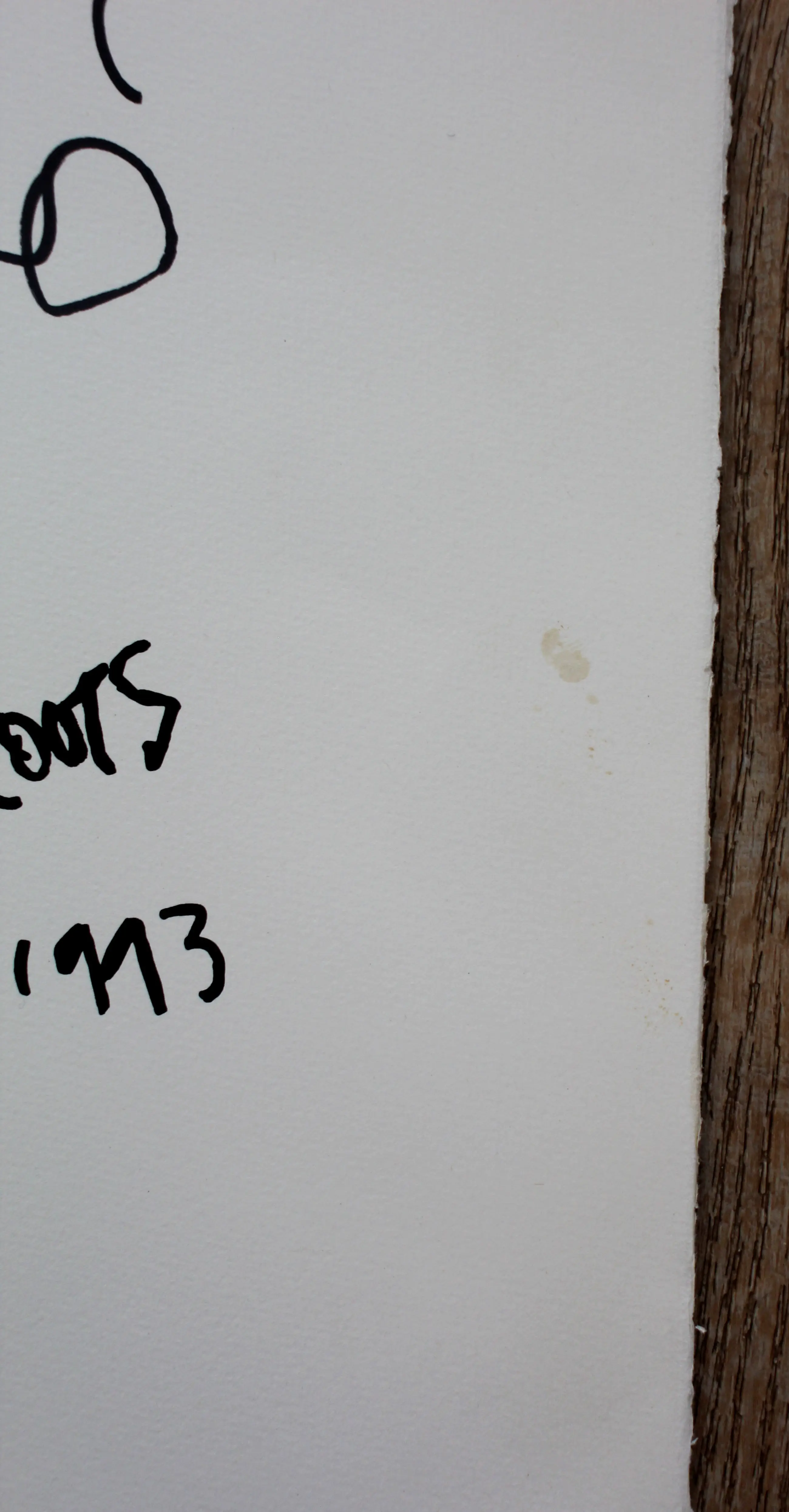 Klein vlekje op de rechterzijde en een heel klein kreukje op de rand van de linker onder hoek. Beide vallen bij inlijsting onder de passe-partout.