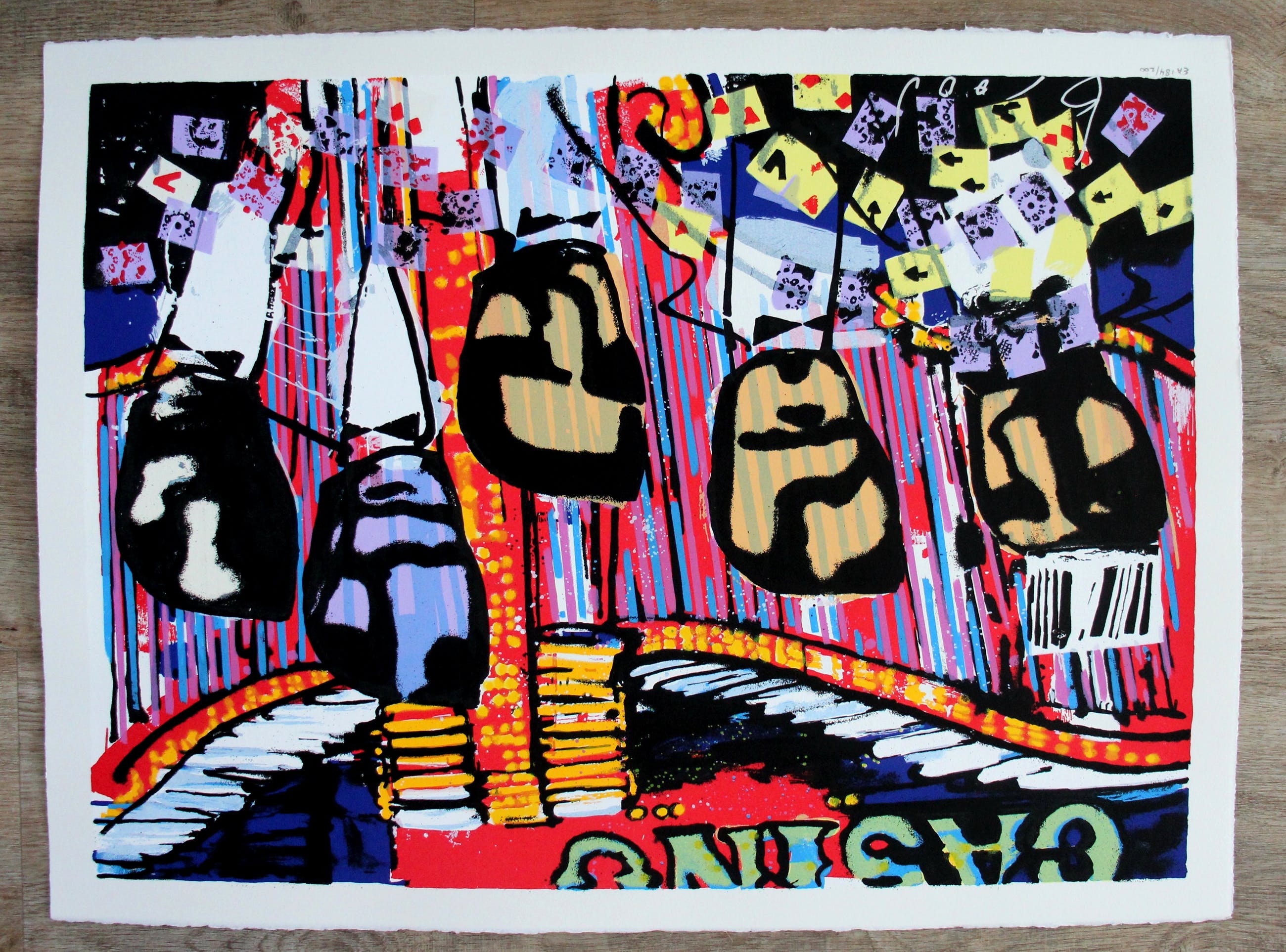 Herkomst: De zeefdruk komt rechtstreeks bij Holland Casino (hoofdkantoor) vandaan. De vorige eigenaar heeft kantoormeubilair opgekocht via BVA veilingen, waarbij hij een aantal zeefdrukken, als verassing, in één van de gekochte kasten aantrof.