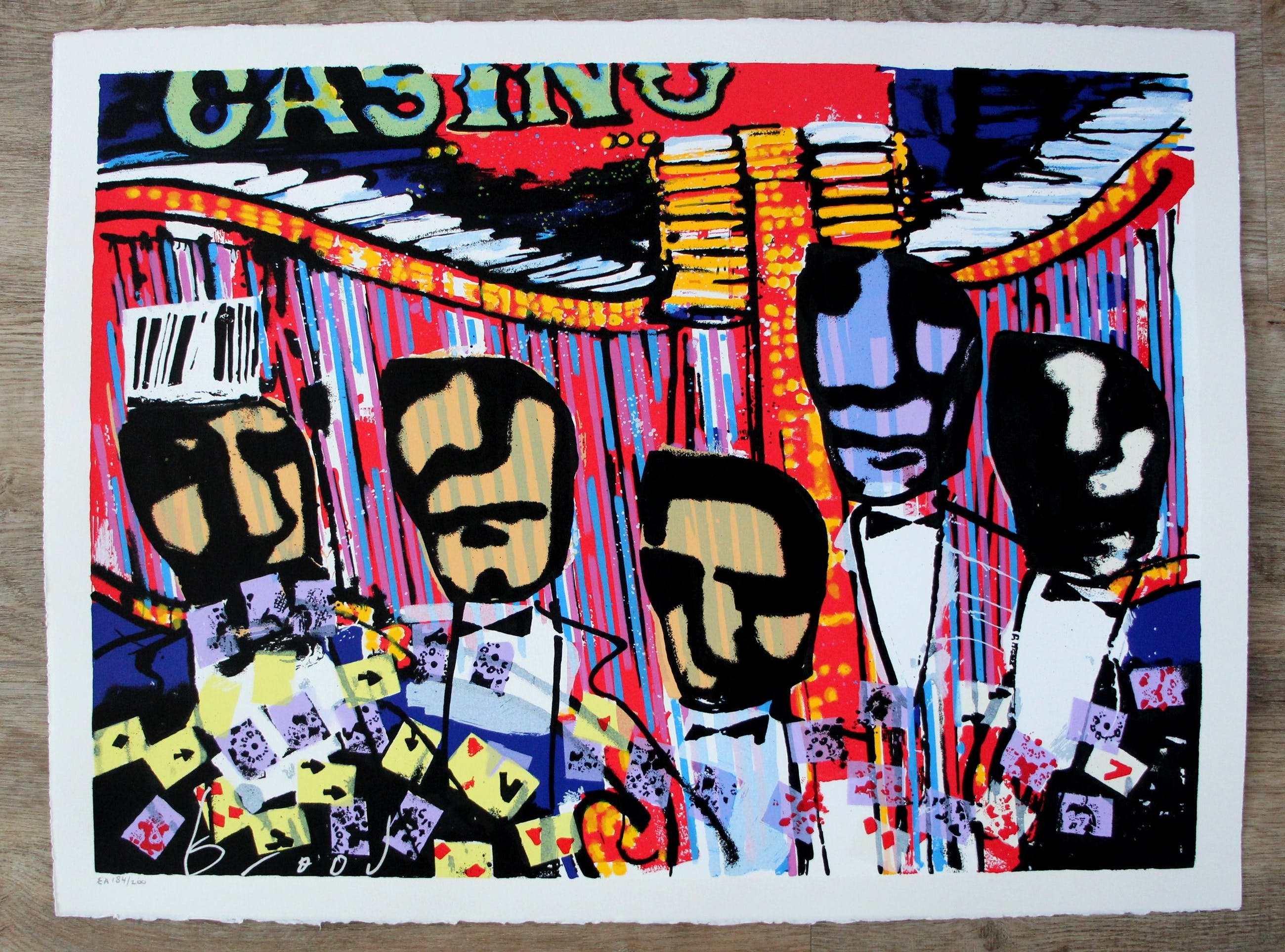 Zeer populaire zeefdruk van Herman Brood. Titel: Casino. Nummer: 184/200. Deze zeefdruk is gemaakt in opdracht van Holland Casino. Afmetingen blad: H56.5 x b76cm. Afmetingen beeld: H51 x b70 cm. Het werk is linksonder met zilveren marker gesigneerd door Herman Brood. De authenticiteit van het aangeboden werk wordt volledig gegarandeerd. Een certificaat van echtheid kan, op aanvraag, worden gemaild.