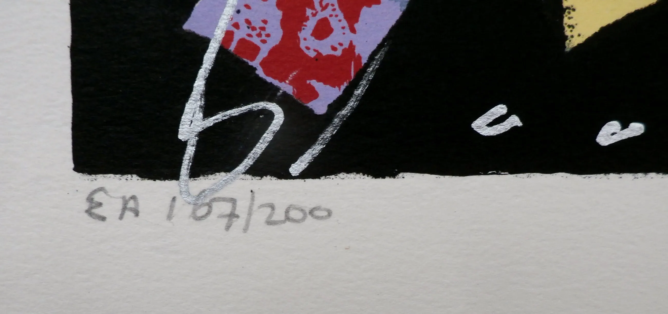 Herkomst: De zeefdruk komt rechtstreeks bij Holland Casino (hoofdkantoor) vandaan. De vorige eigenaar heeft kantoormeubilair opgekocht via BVA veilingen, waarbij hij een aantal zeefdrukken, als verassing, in één van de gekochte kasten aantrof.