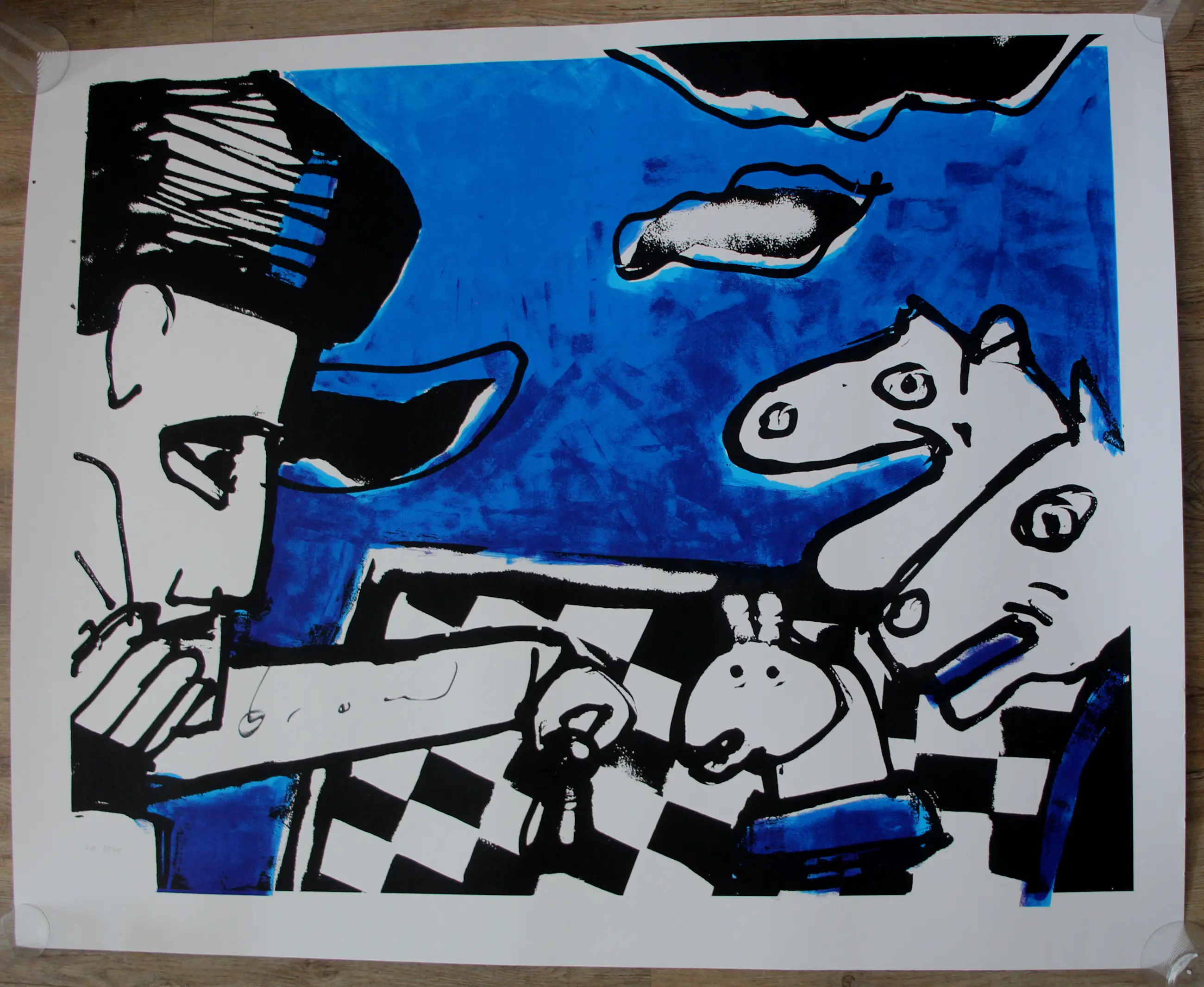Zeefdruk van Herman Brood. Titel: Chess. Oplage: E.A, 25/25. Afmetingen blad: H94 x b119cm. Afmetingen voorstelling: H87 x b107cm. Het werk is, links onderaan, gesigneerd door de kunstenaar. De authenticiteit van het aangeboden werk wordt volledig gegarandeerd. Een certificaat van echtheid kan, op aanvraag, worden gemaild.