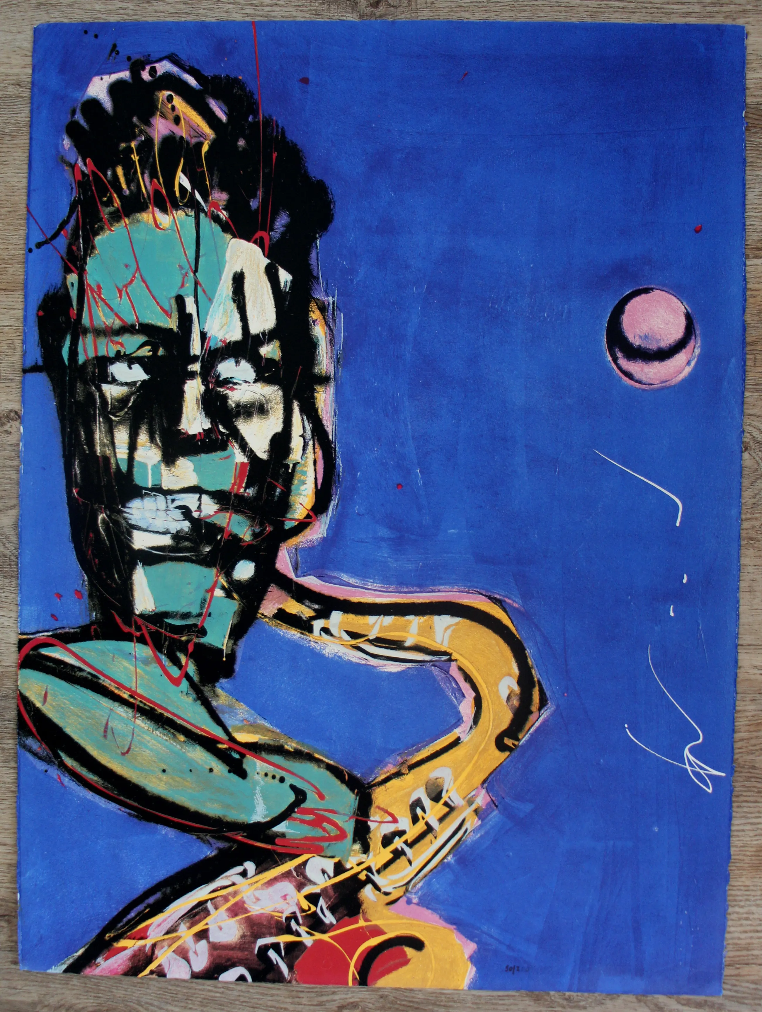 Zeefdruk van Herman Brood. Titel: Het Bandje ( de saxofonist). Nummer: 50/250. Jaar: 1990. Afmetingen blad: H76 x b56cm. Het werk is rechtsonder gesigneerd door de kunstenaar. Deze zeefdruk is uitgegeven door de Free Record Shop. De totale serie bestond uit 5 verschillende werken: