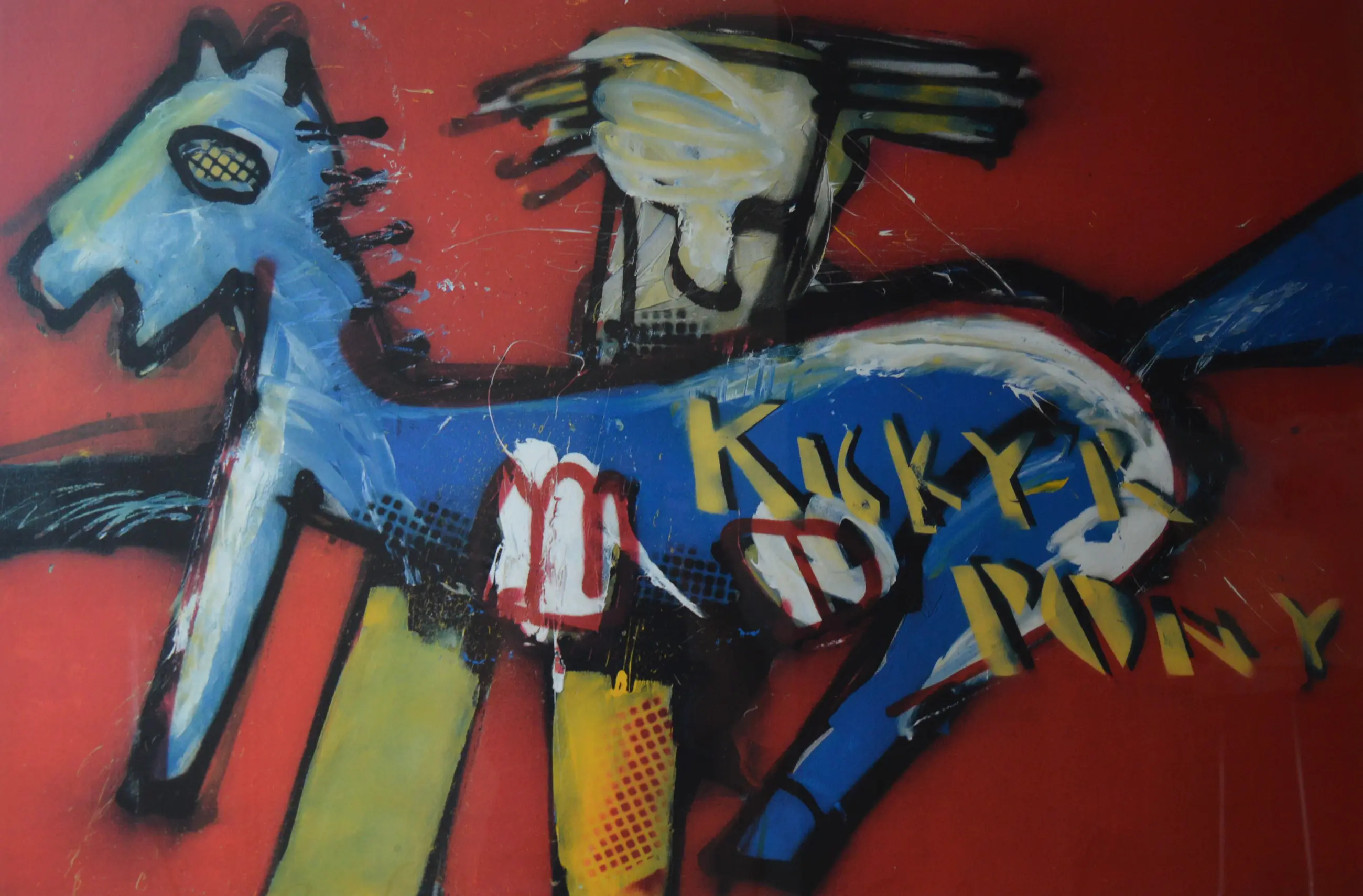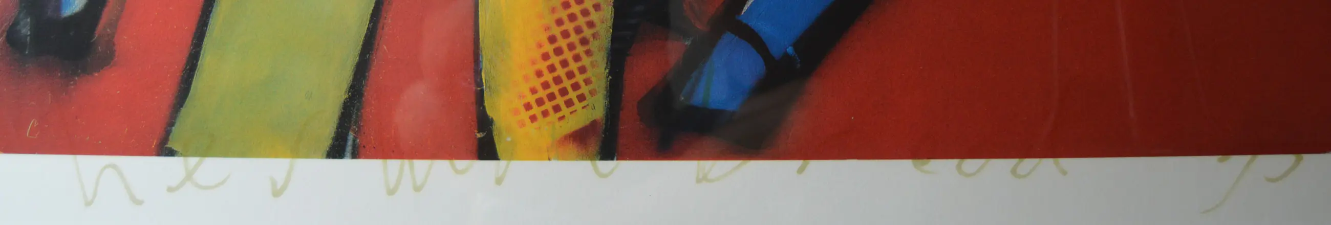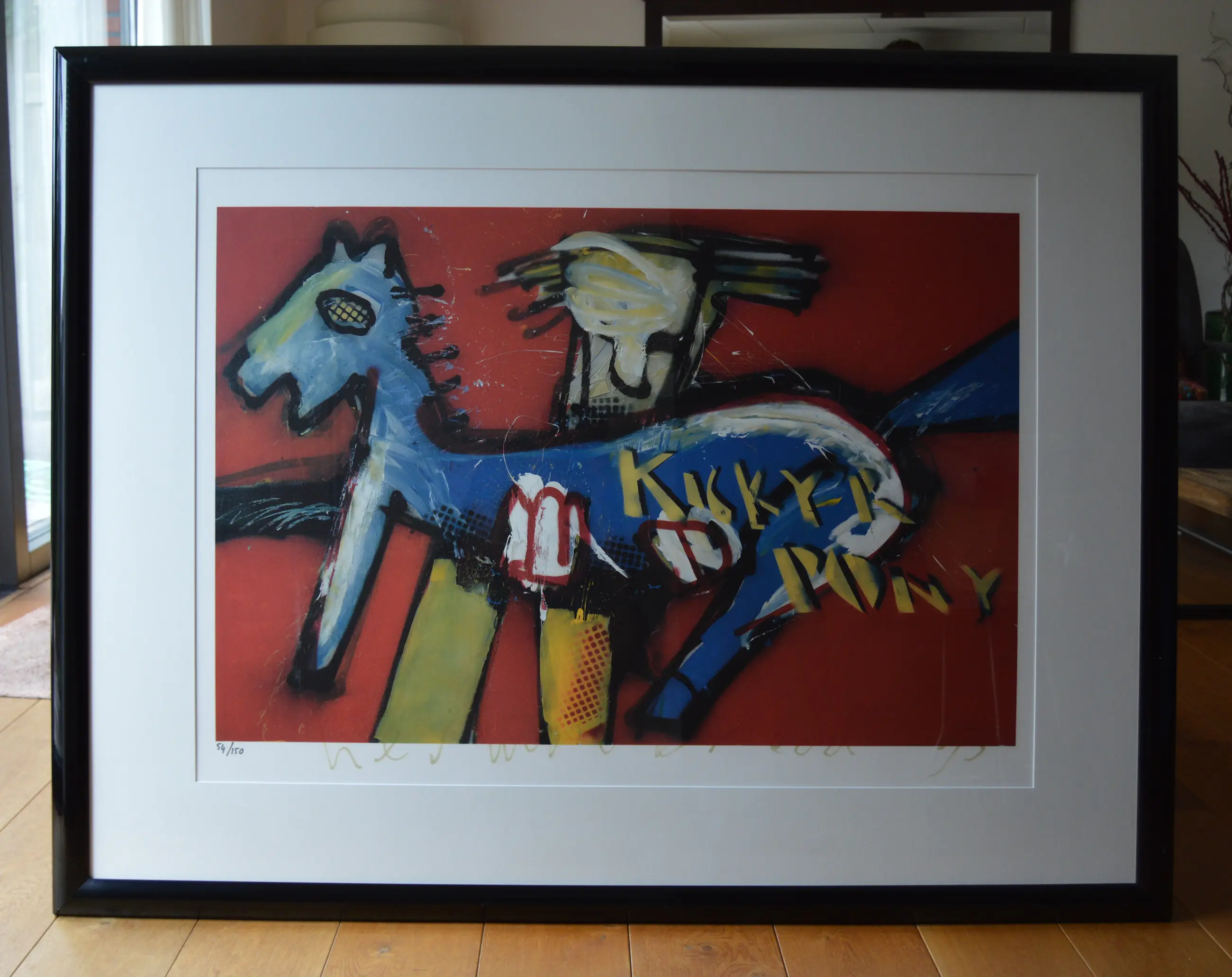 Kleurrijke zeefdruk van Herman Brood uit 1993. Ingelijst in een zwarte houten lijst met passe-partout.