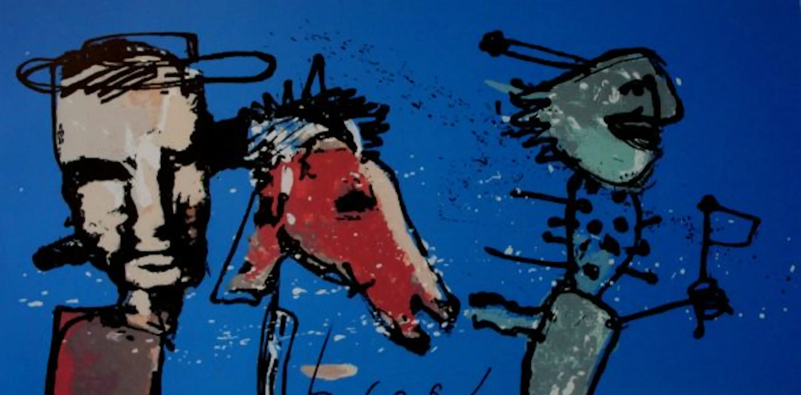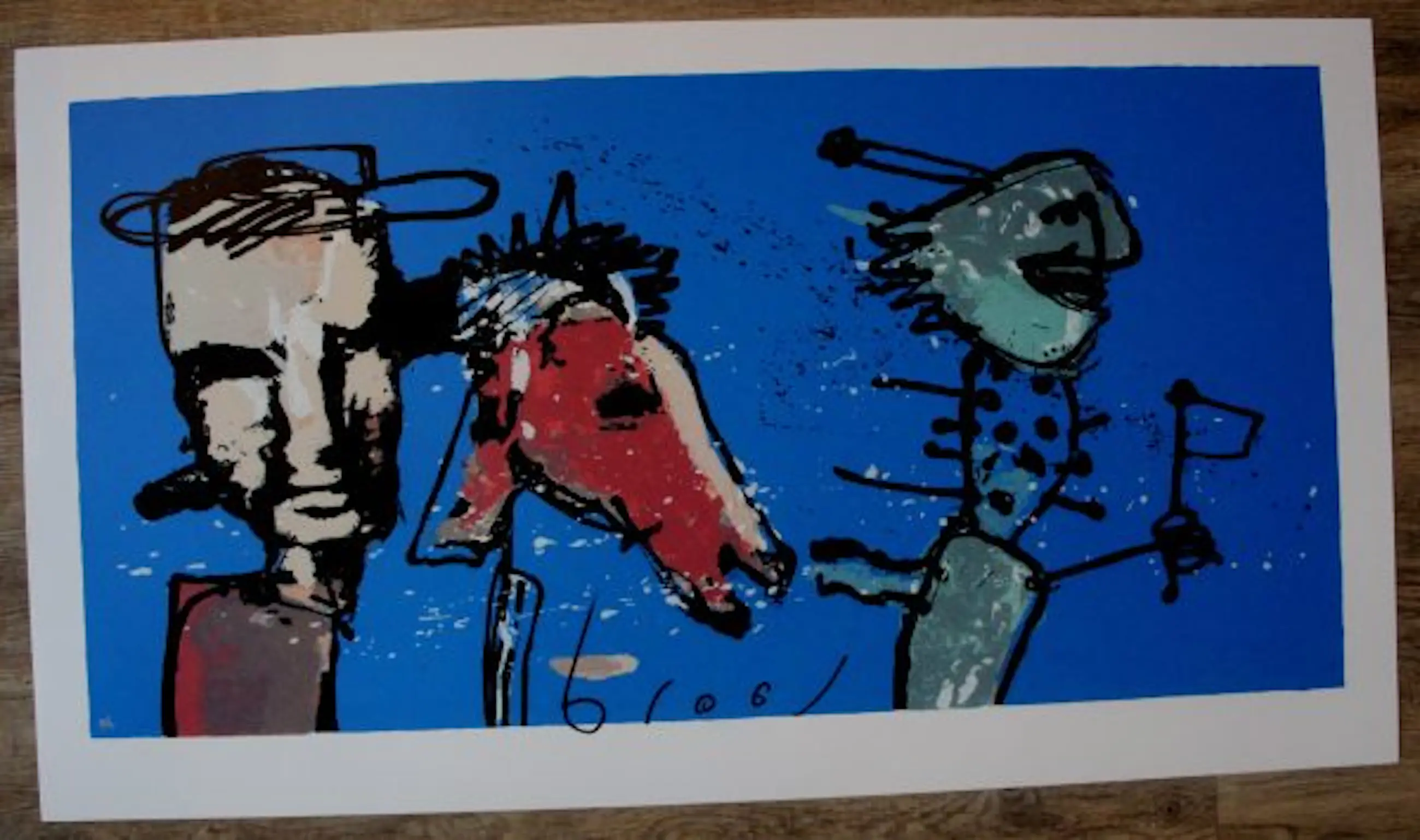 Zeefdruk van Herman Brood. Titel: Lucebertje. Oplage: E.A. Afmetingen blad: H71 x b126cm. Afmetingen voorstelling: H55 x b110cm. Het werk is, rechts onderaan, gesigneerd door de kunstenaar. De authenticiteit van het aangeboden werk wordt volledig gegarandeerd. Een certificaat van echtheid kan, op aanvraag, worden gemaild.