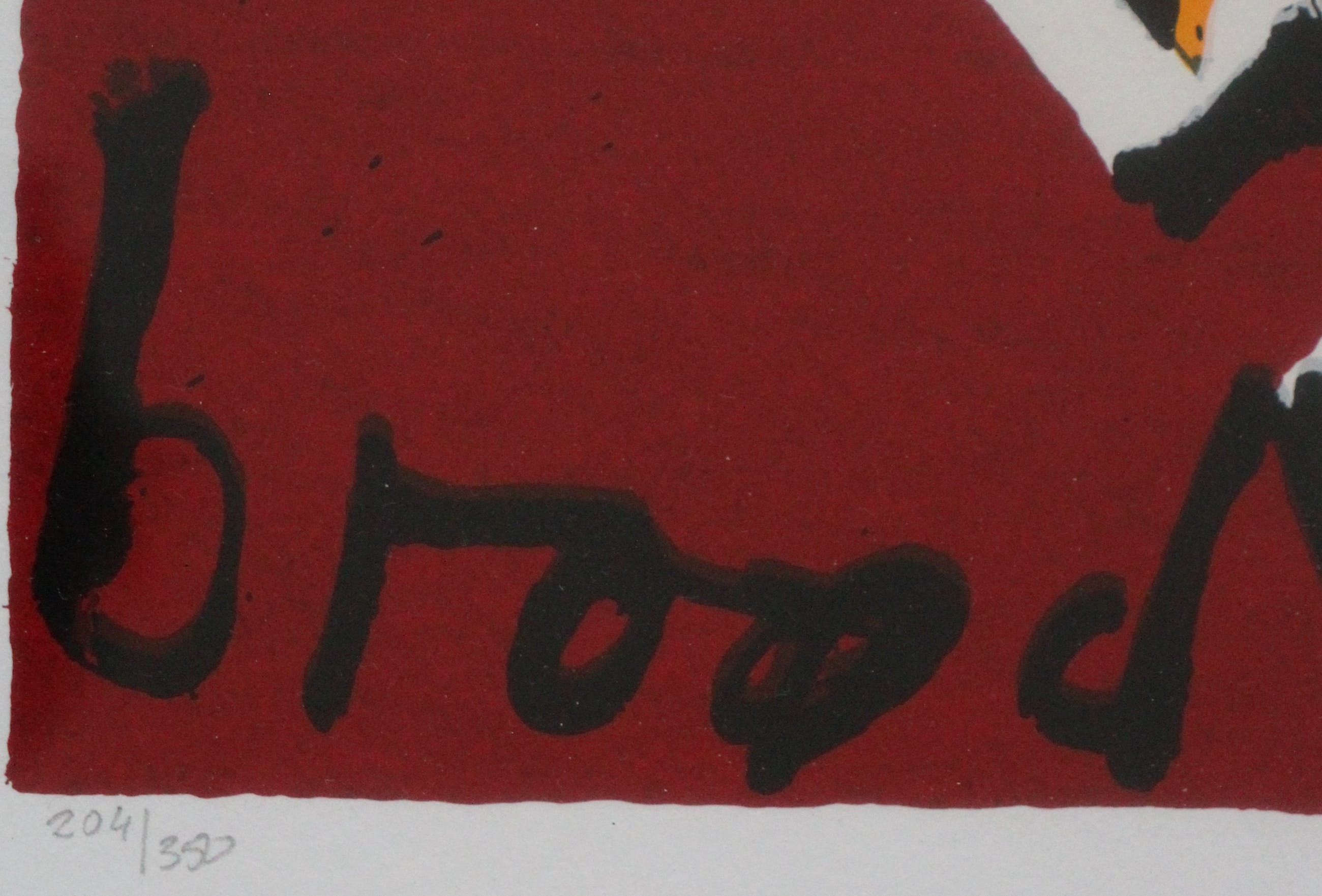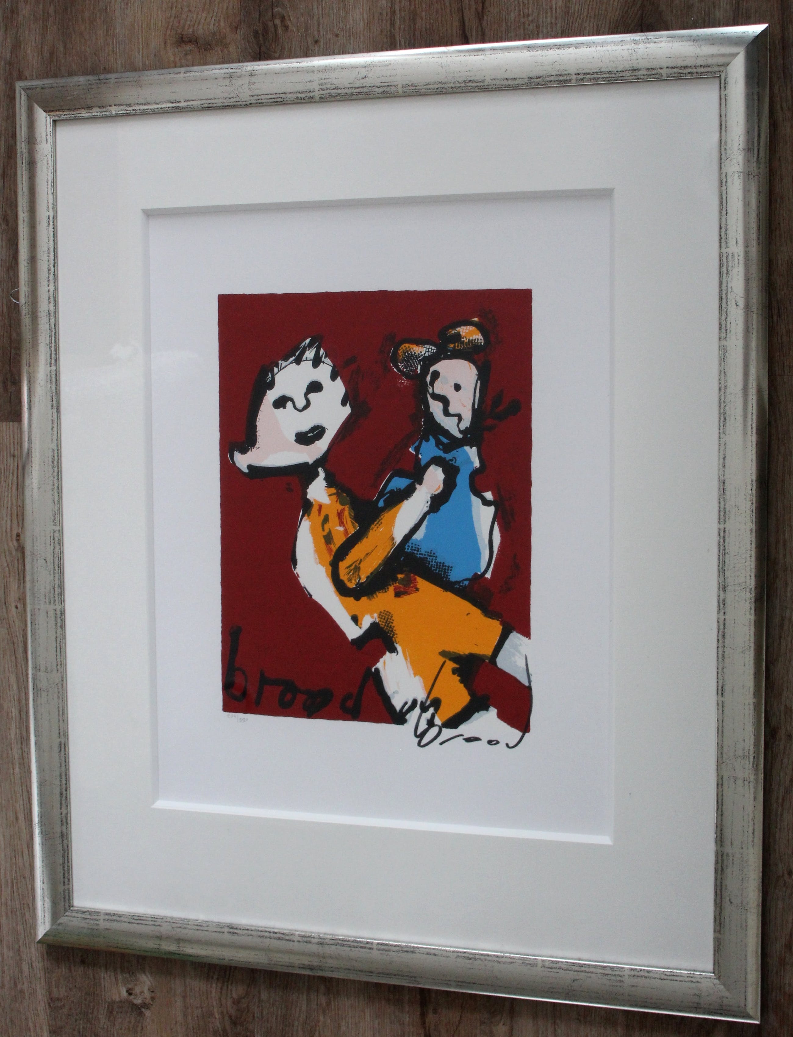 Ingelijste zeefdruk van Herman Brood. Titel: Moeder en kind. Nummer: 204/350. Afmetingen incl lijst: H86.5 x b72cm. Afmetingen voorstelling: H40 x b29.5cm. Het werk zit keurig ingelijst, voorzien van verdiept passepartout. Het werk kan zo thuis aan de muur!