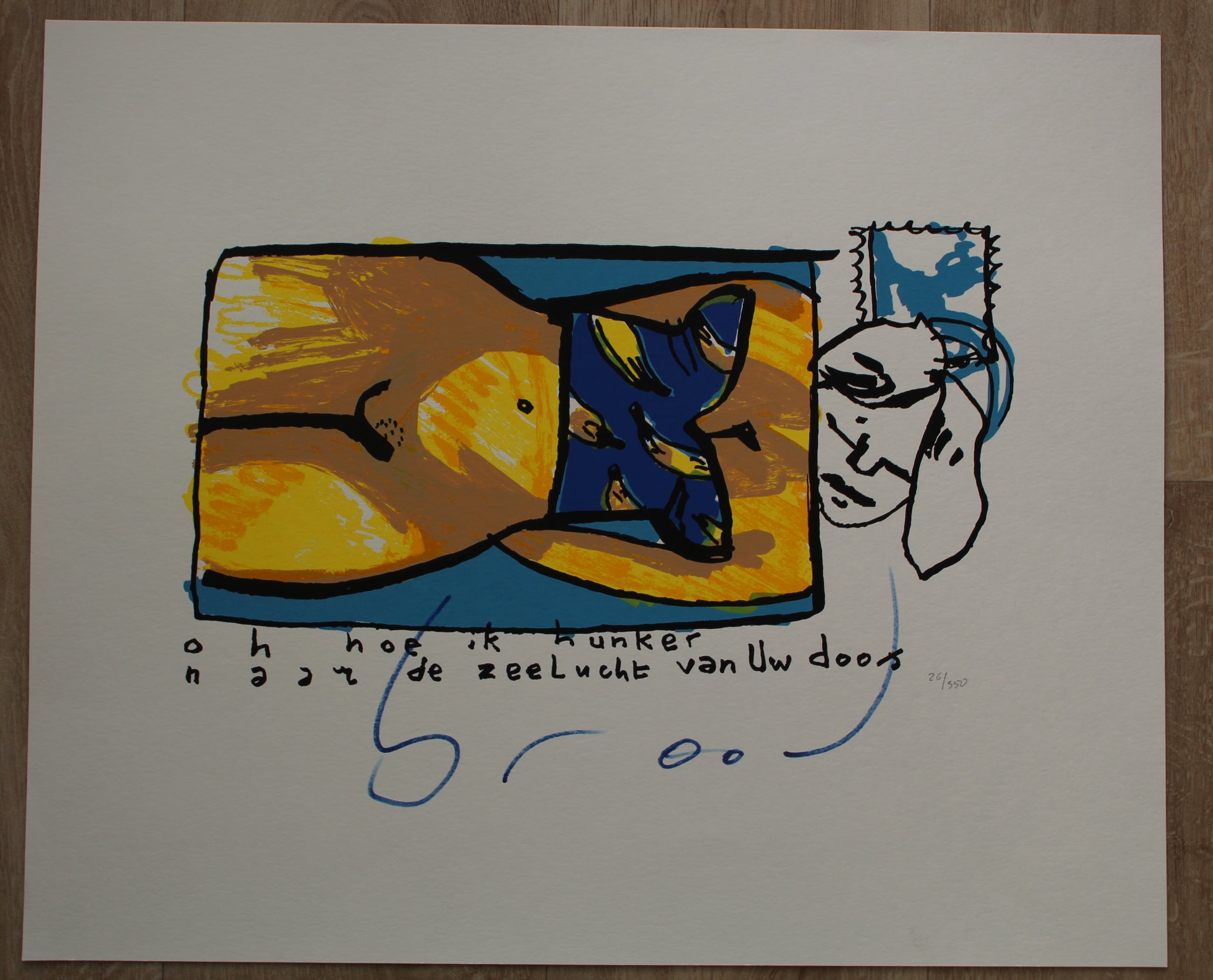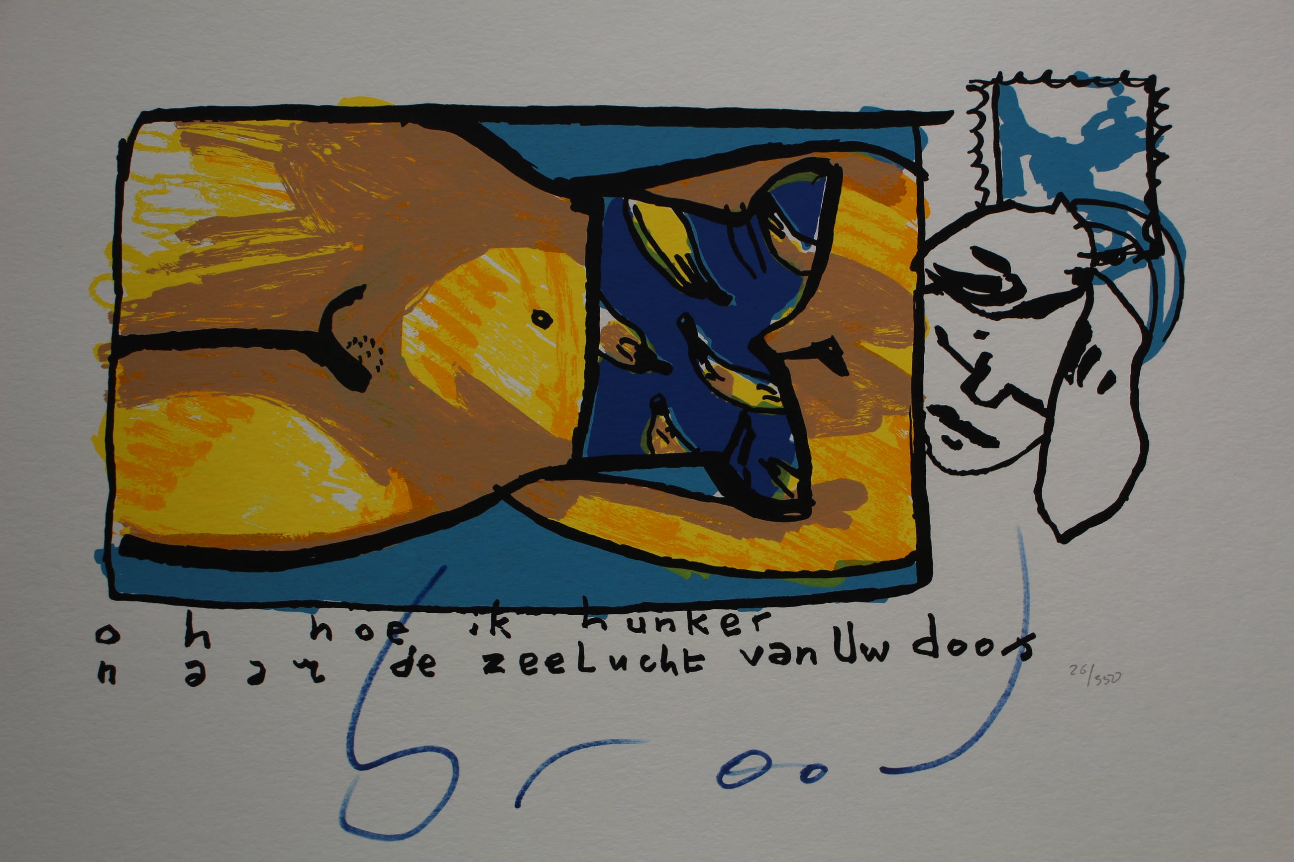 Kleuren zeefdruk van Herman Brood. Titel: Oh hoe ik hunker naar de zeelucht van uw doos. Nummer: 26/550. Afmetingen blad: H49.5 x b60cm. Afmetingen voorstelling: H25 x b45cm. In uitstekende conditie. Het werk is middenonder gesigneerd door de kunstenaar. De authenticiteit van het aangeboden werk wordt voor 100% gegarandeerd. Een certificaat van echtheid kan, op aanvraag worden gemaild.