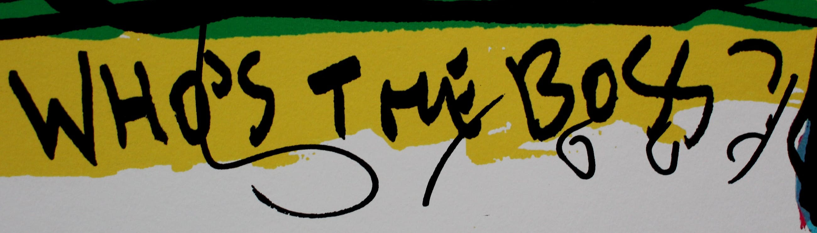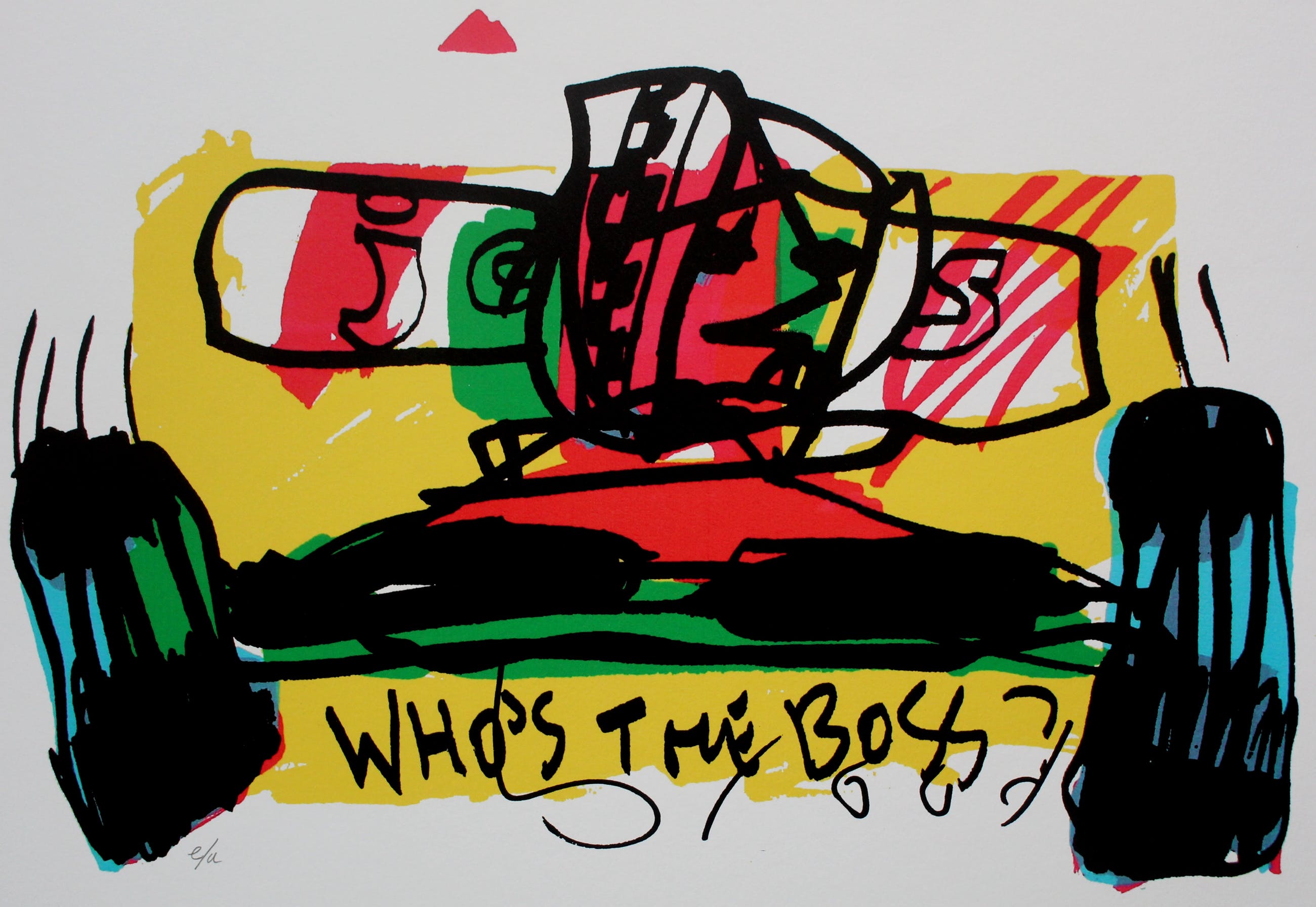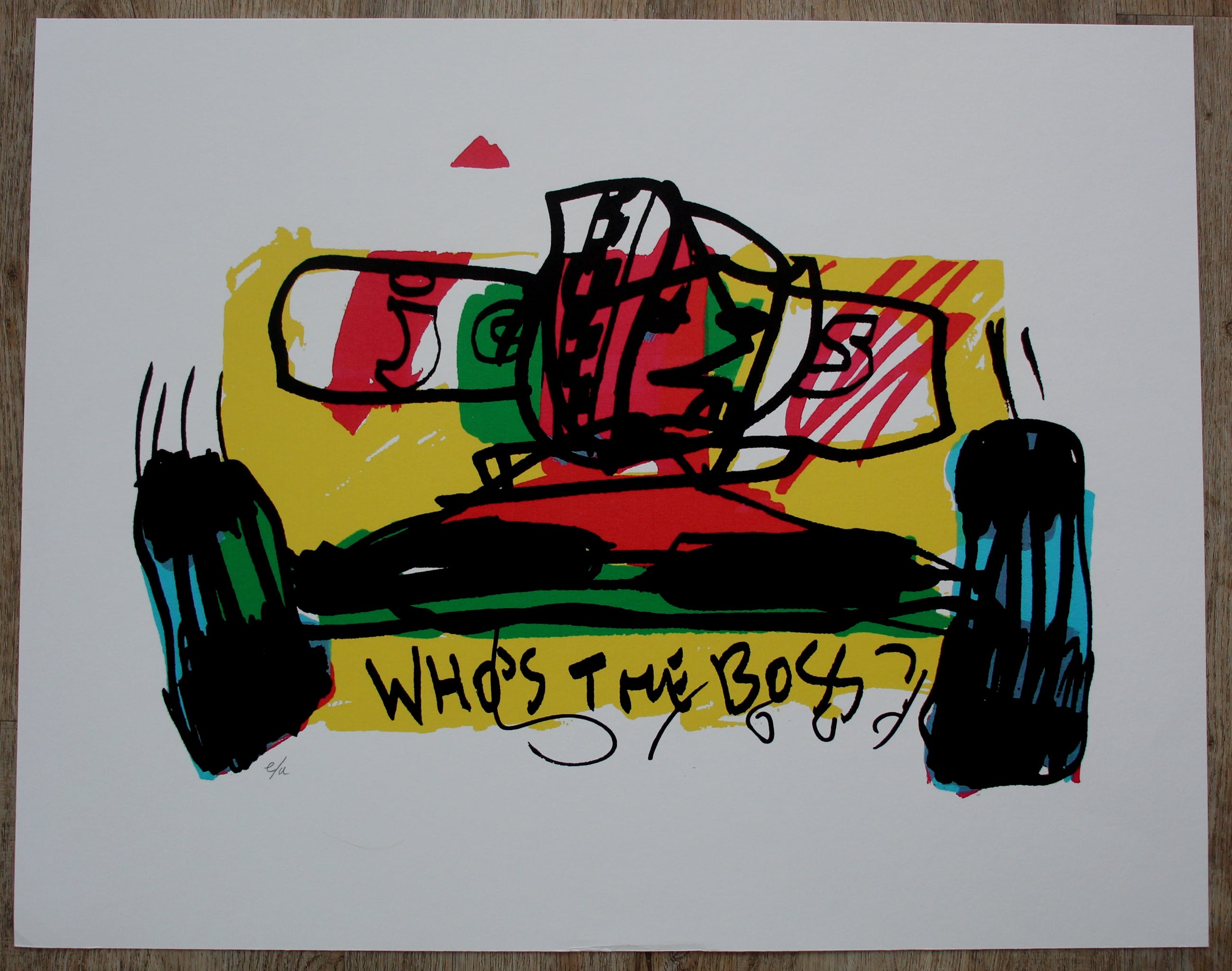 Zeefdruk van Herman Brood. Titel: Who's the boss. Ode aan de familie Verstappen. Nummer: E.A. Afmetingen blad: H55.5 x b70cm. Afmetingen voorstelling: H40 x b56cm. Het werk is onderaan, gesigneerd, door de kunstenaar. De authenticiteit van het werk wordt volledig gegarandeerd. Een certificaat van echtheid kan , op aanvraag, worden gemaild.