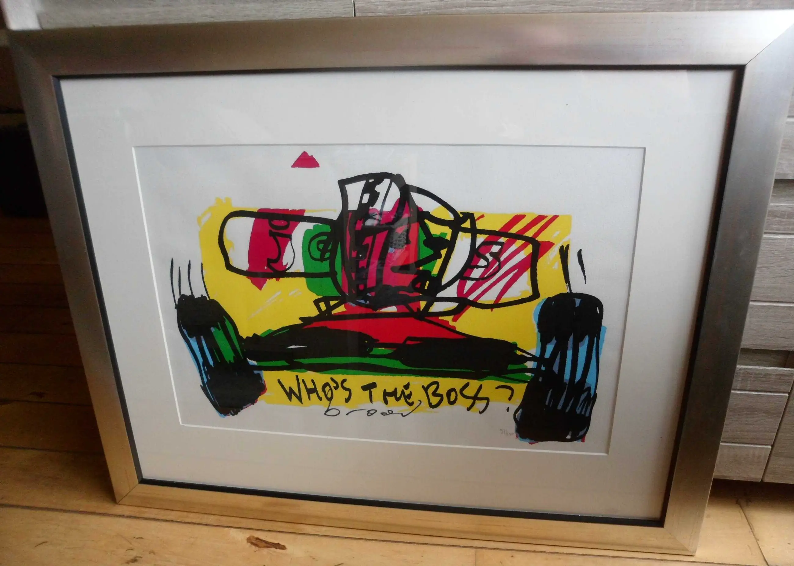 Zeefdruk van Herman Brood. Titel: Who's the boss. Ode aan de familie Verstappen
