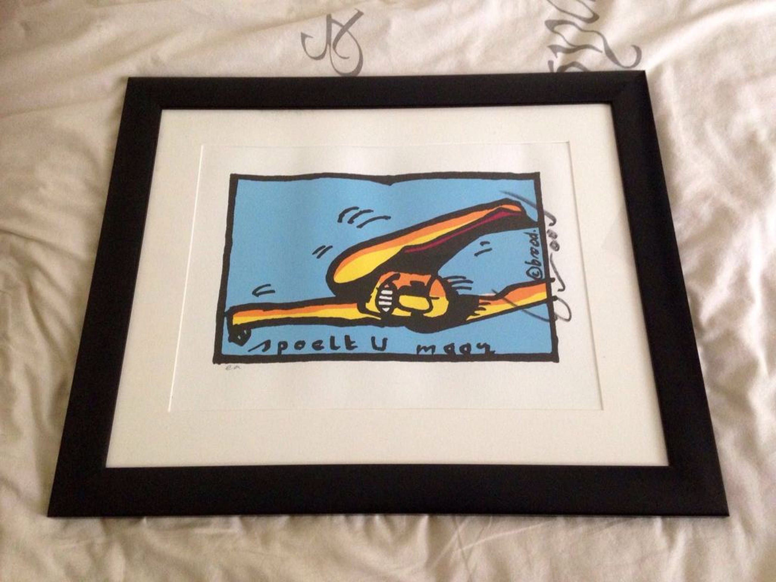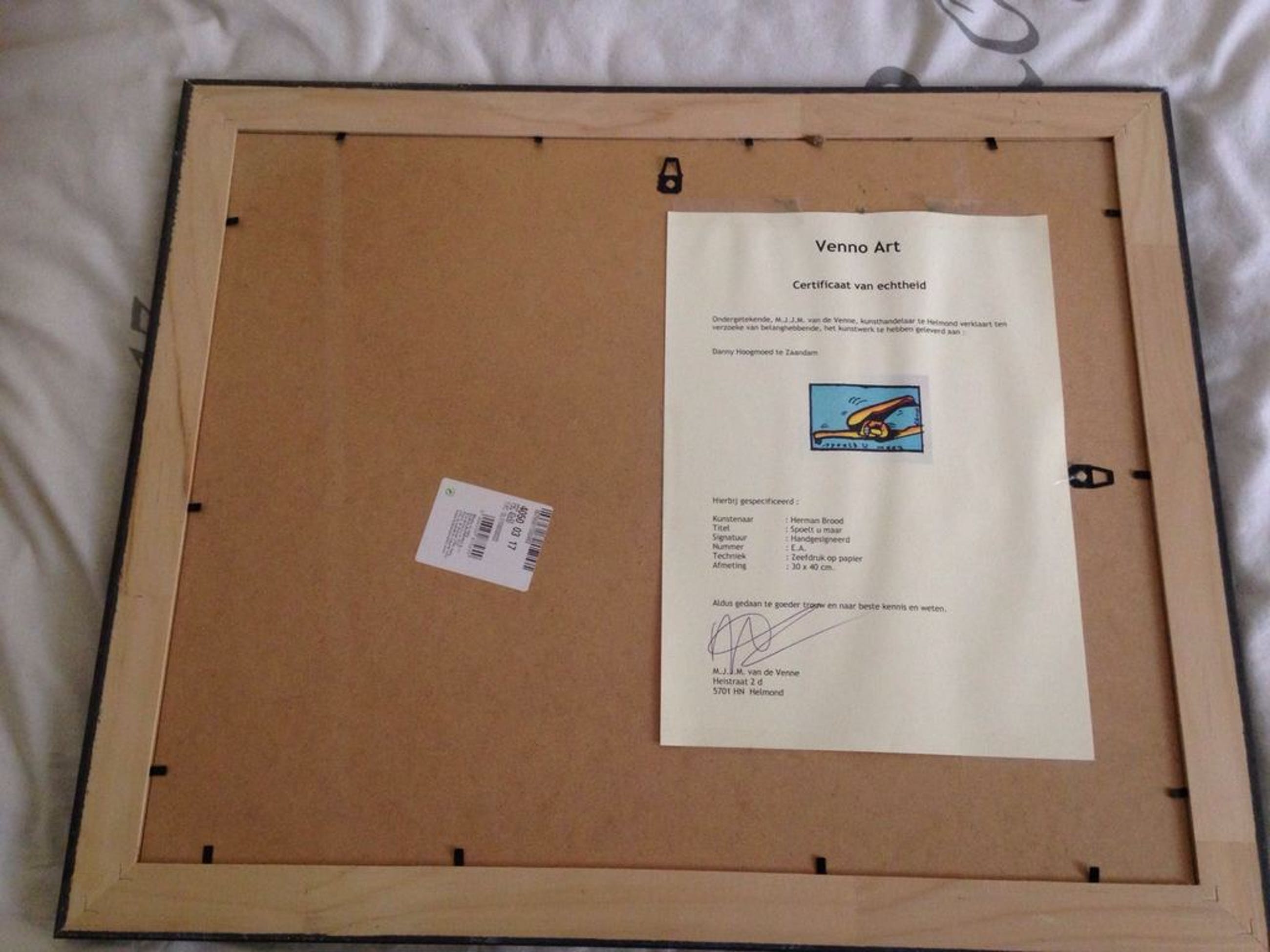 HERMAN BROOD, GELIMITEERDE EN HANDGESIGNEERDE ZEEFDRUK 'SPOELT U MAAR' Ingelijst met luxe passe partout en echtheidscertificaat van leveranvier. Afm lijst 57/47 cm.