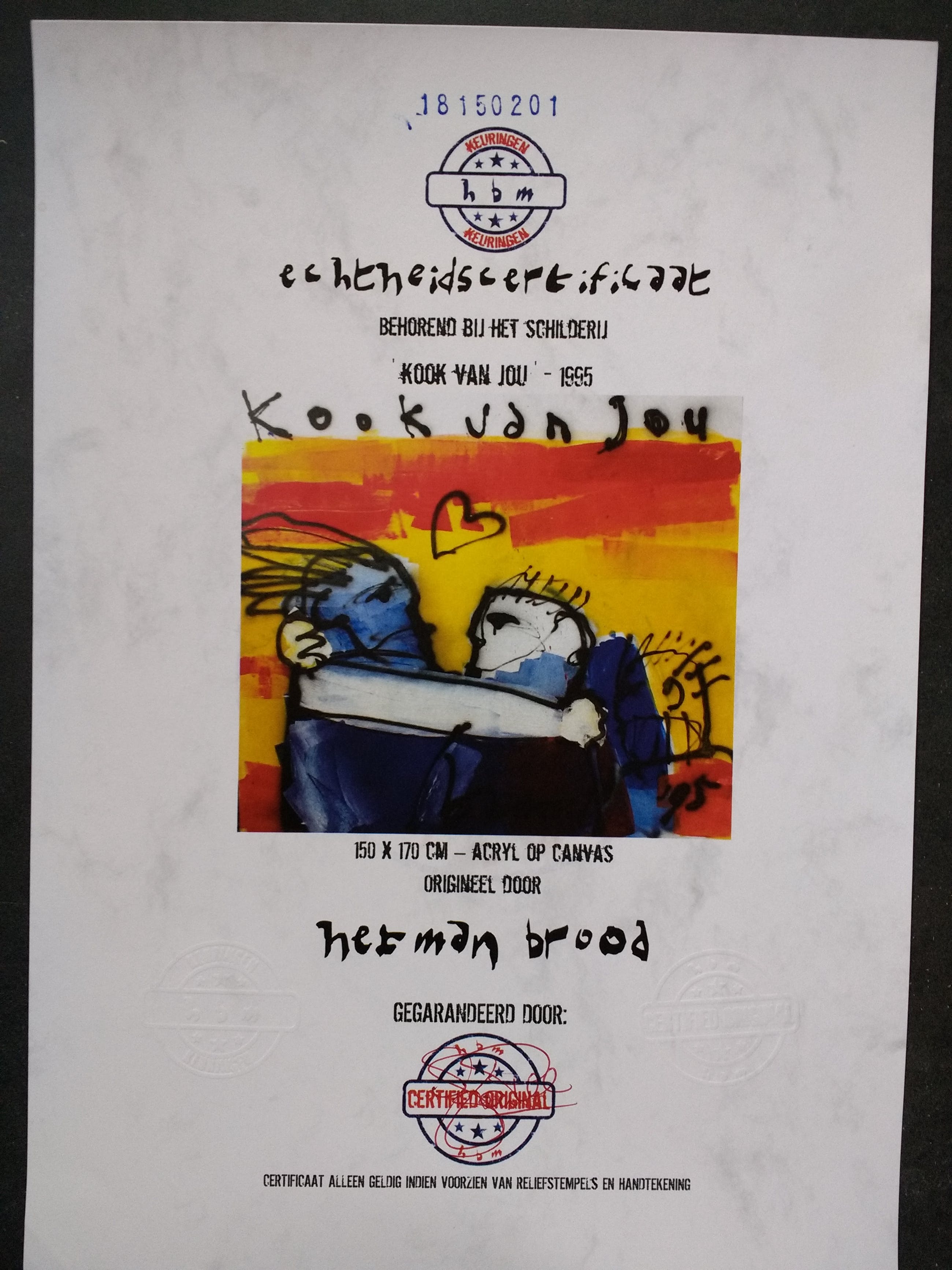 Origineel zeer groot schilderij van Herman Brood Titel: kook van jou Dergelijke grote doeken kom je zeer weinig tegen Afmetingen: 170 x 150 cm Acryl op linnen Handgesigneerd en gedateerd '95 (1995) Doek zelf is in perfecte staat, is reeds opgespannen maar lijst is door grootte van het werk scheef getrokkken Met HB-M certificaat (Herman Brood Museum)