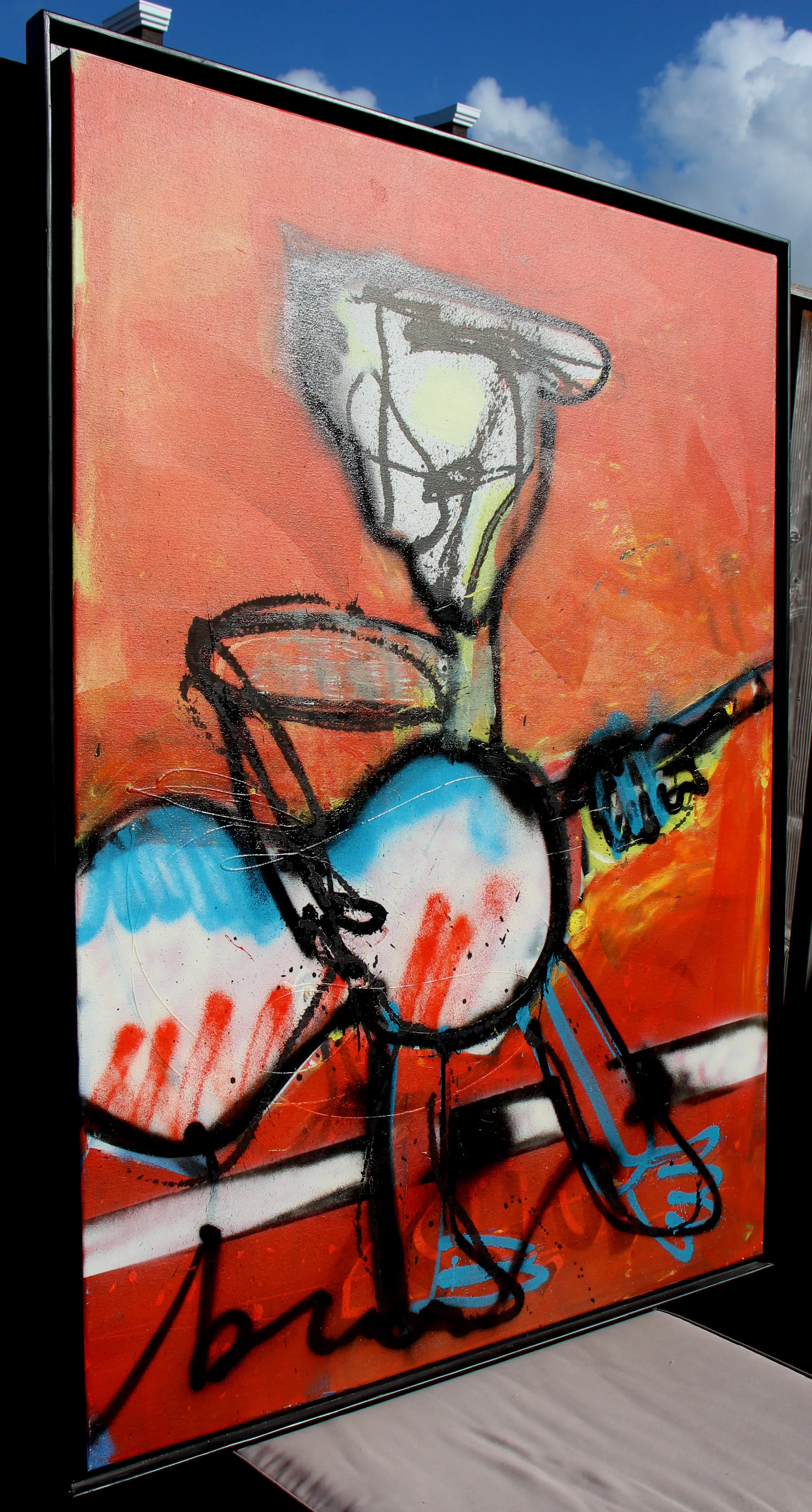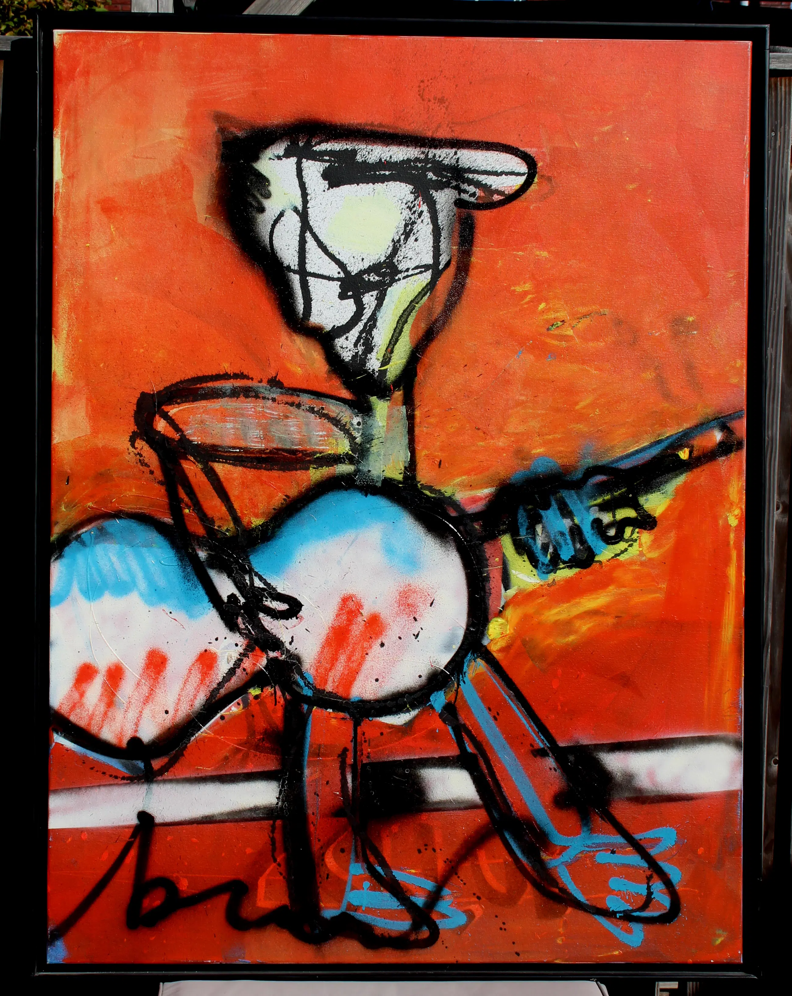 Ingelijste gemengde techniek op doek, van Herman Brood. Titel: Gitar men. Afmetingen incl. lijst: H126 x B126cm. Afmetingen voorstelling: H120 x b120cm.