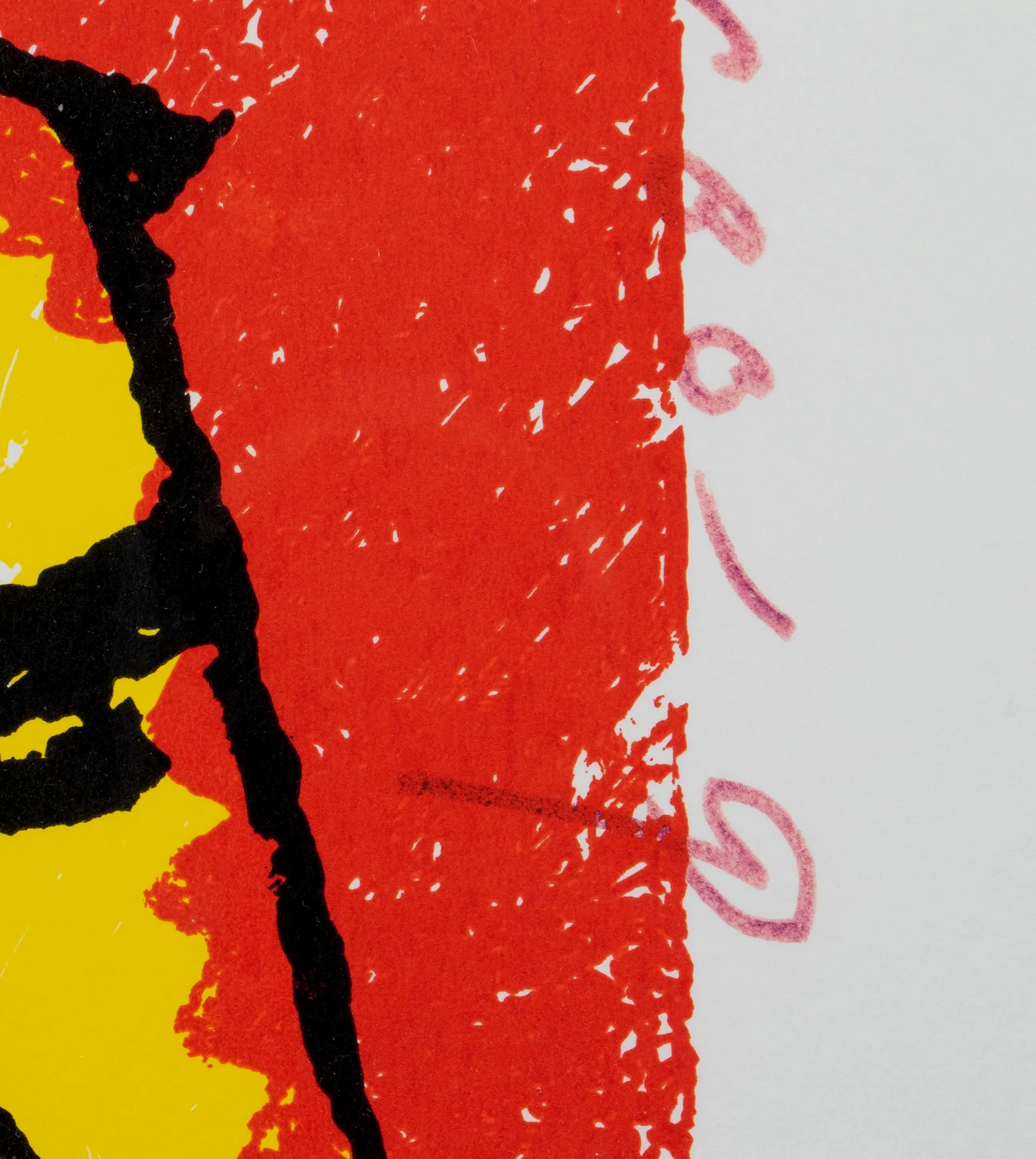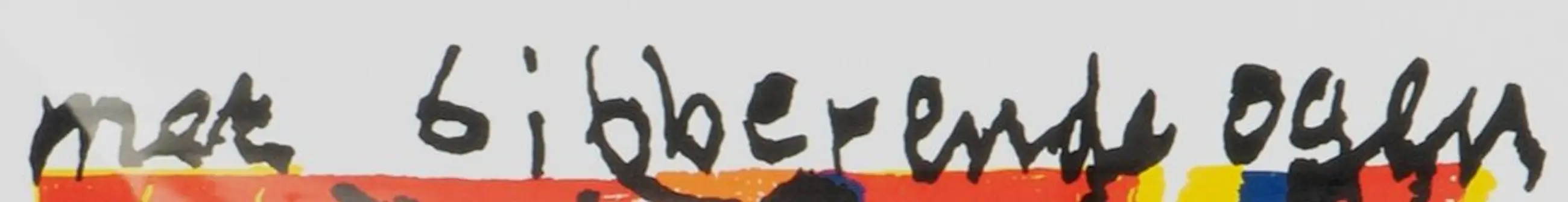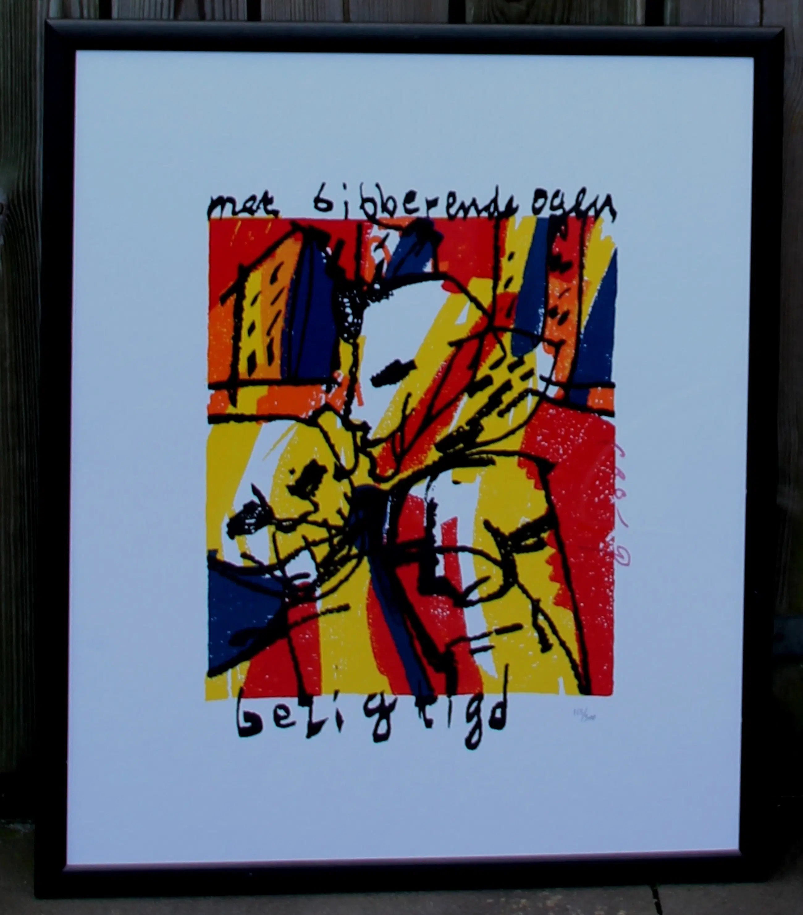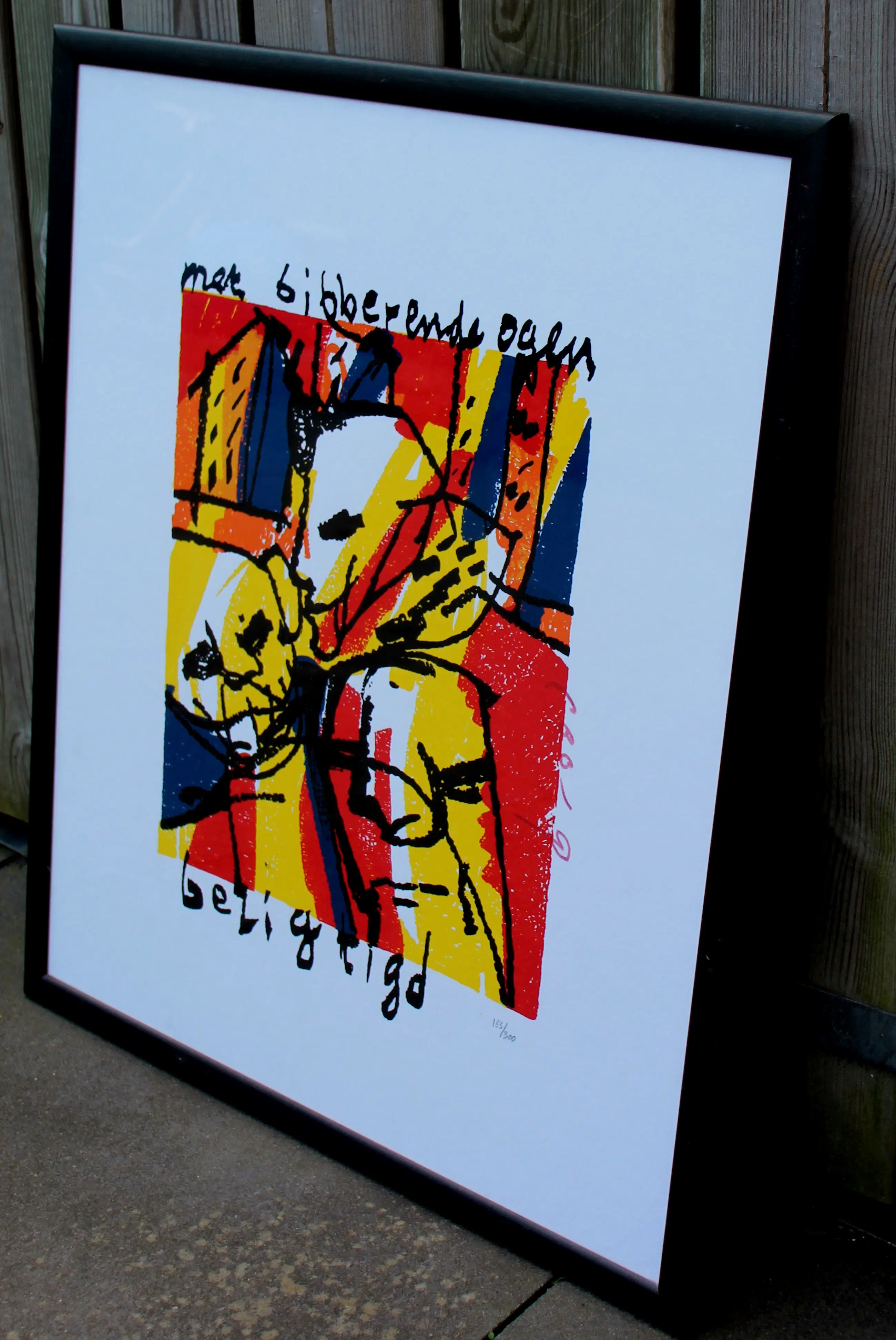 Ingelijste zeefdruk van Herman Brood. Titel: ‘Met bibberende ogen bezigtigd’. Oplage: 163/300. Afmetingen incl. lijst: H63.5 x B53.5cm. Afmetingen voorstelling: H38.5 x b38.5cm.