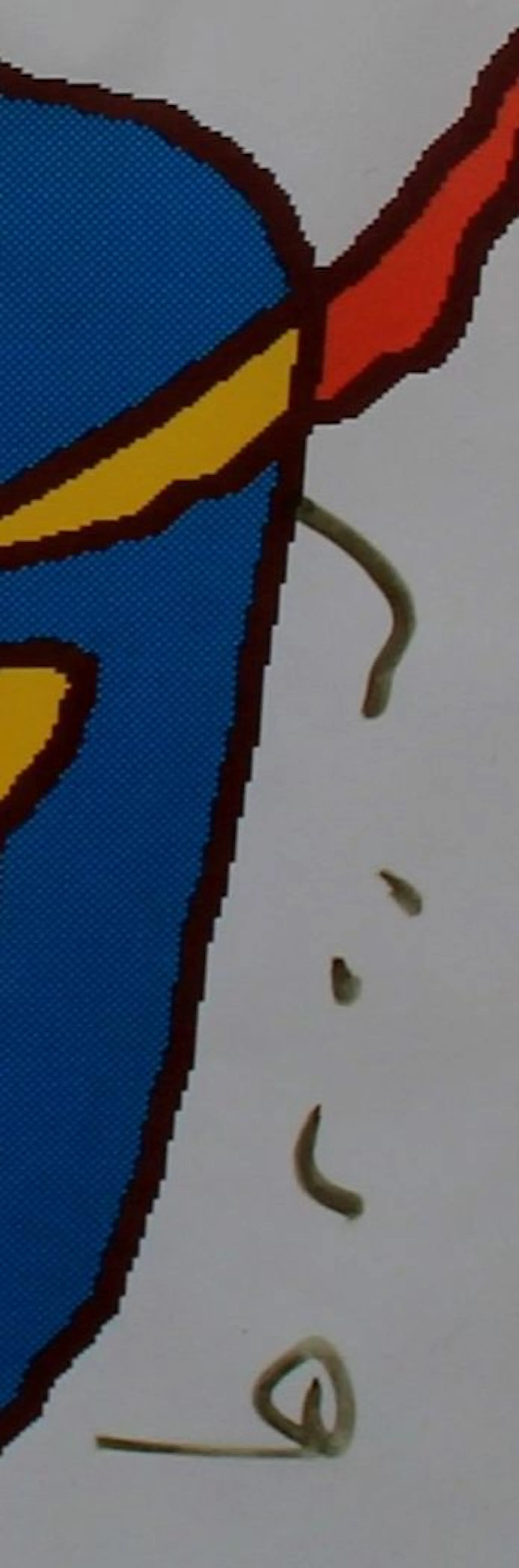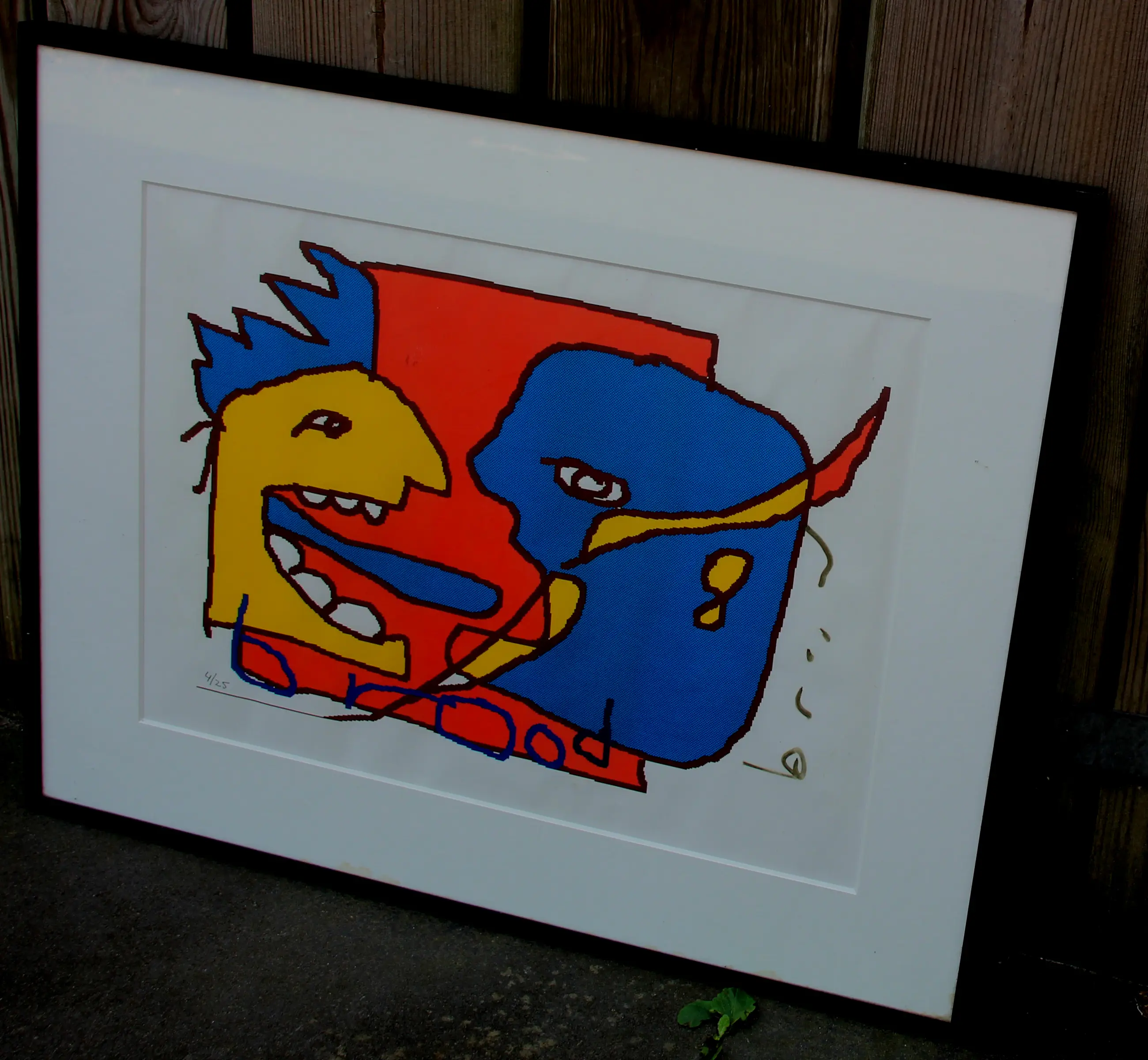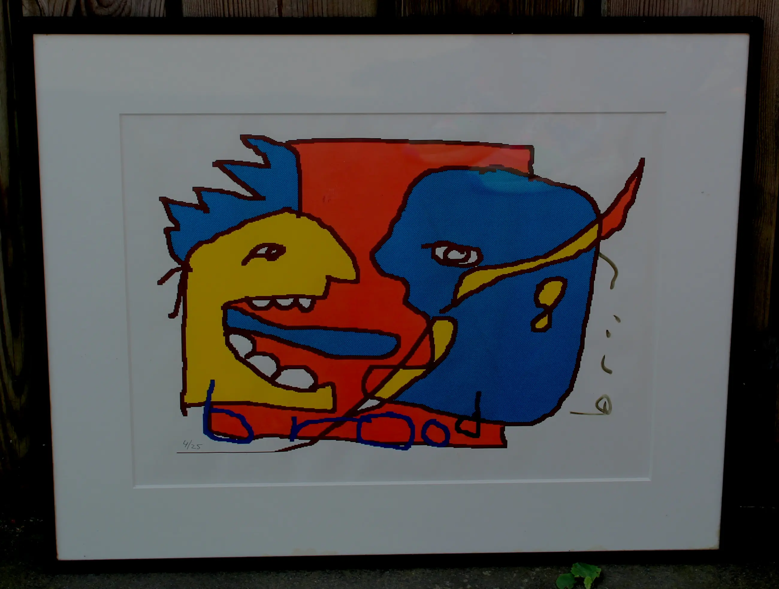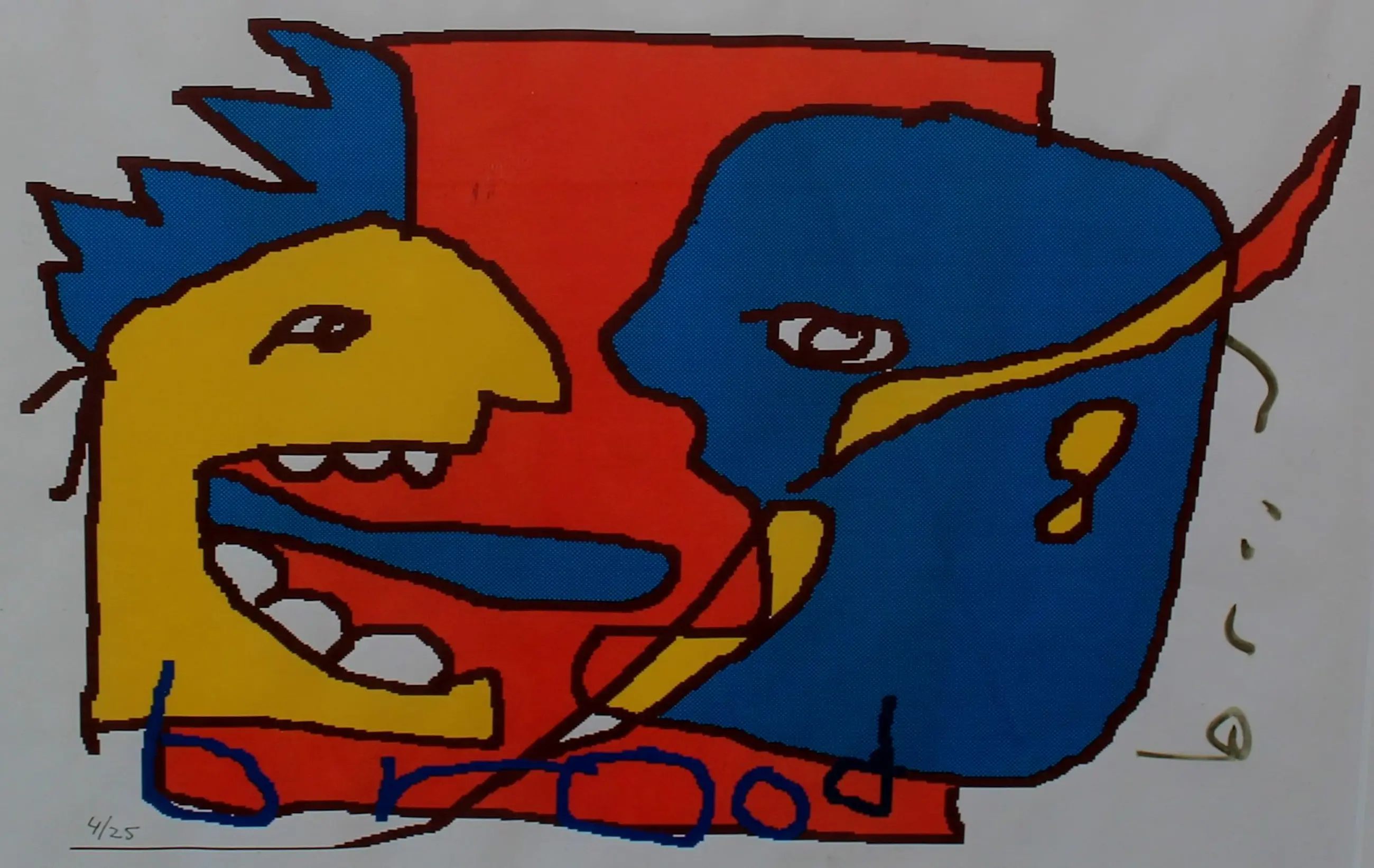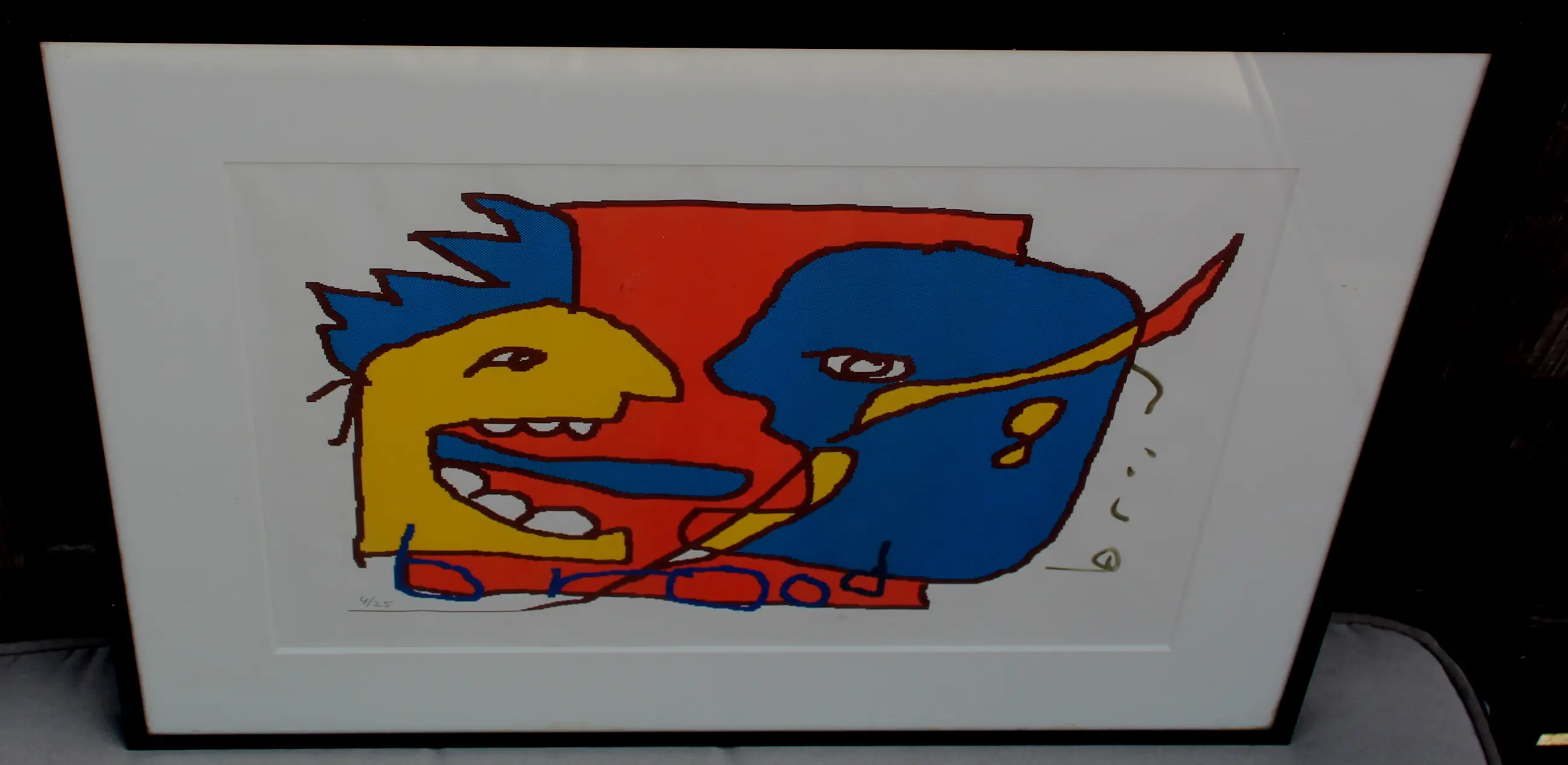 Ingelijste zeefdruk van Herman Brood. Titel: ‘Wat zeg jij?'. Oplage: 4/25. In de begin jaren 90 was Herman dol op tekenen met behulp van een computer. Dit is een van zijn tekeningen waarvan een zeefdruk is gemaakt. Afmetingen incl. lijst: H41 x B51cm. Afmetingen voorstelling: H28 x b38cm.
