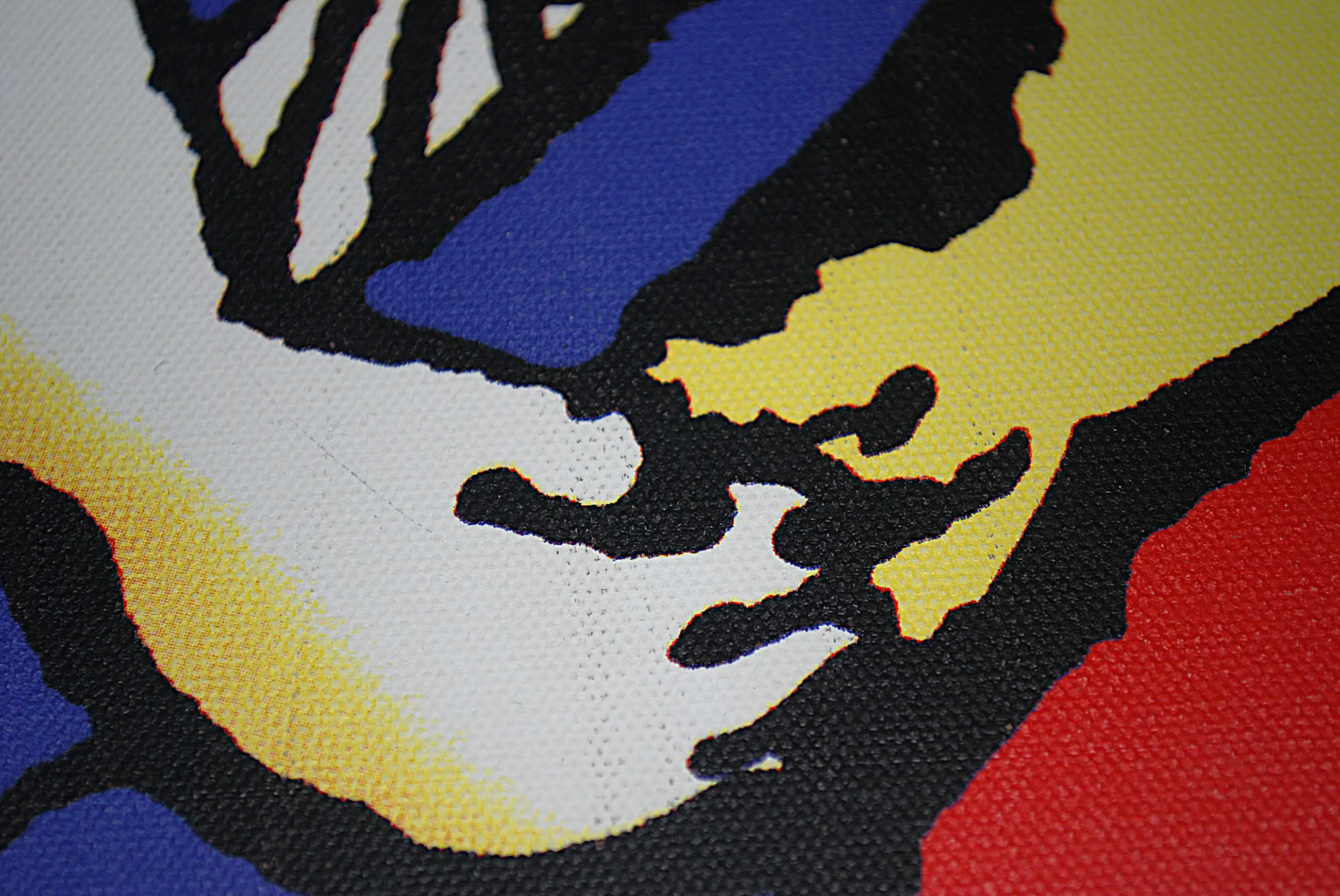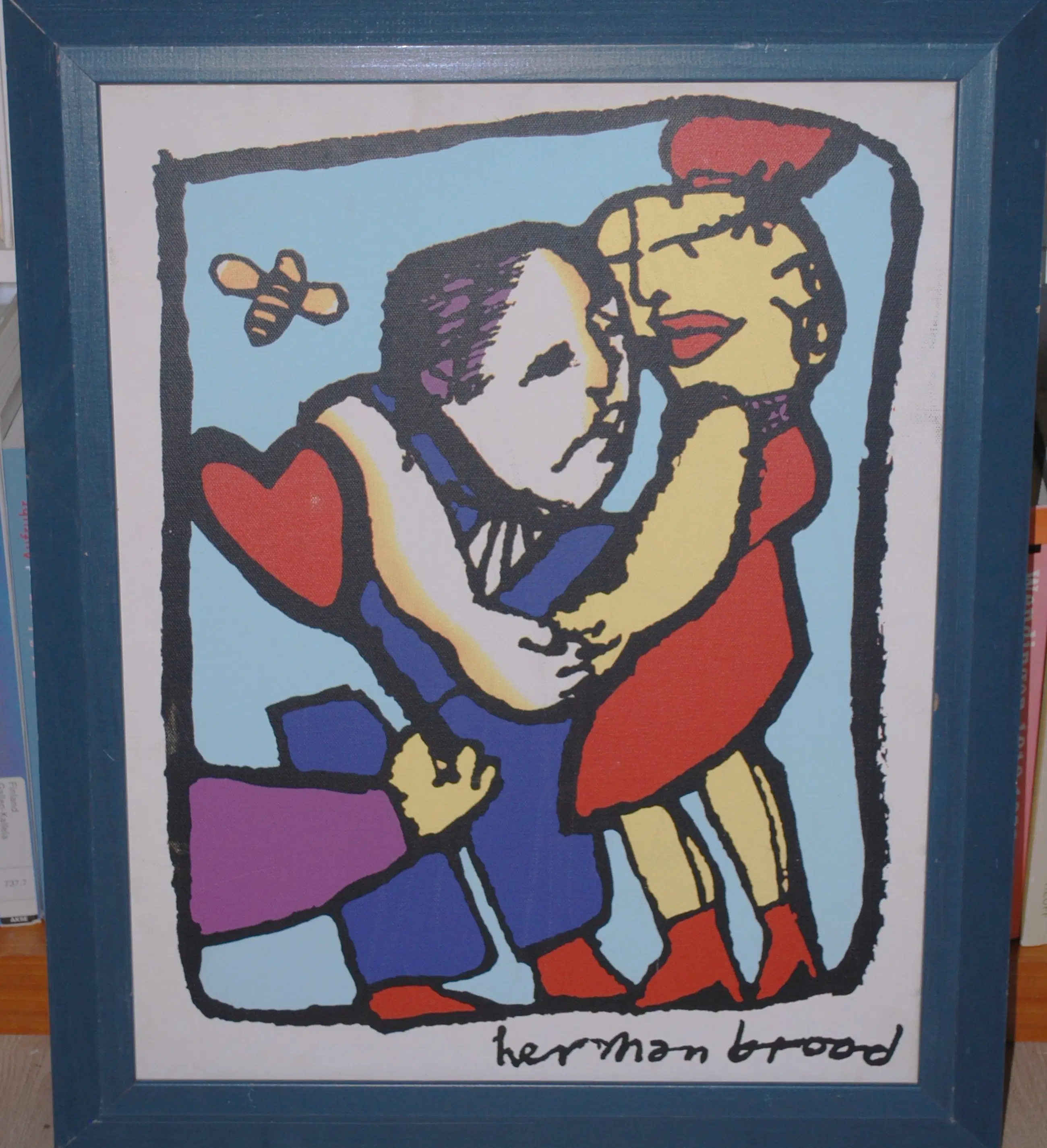 Mooie zeefdruk op canvas. In prima gebruikte staat. In een blauwe houten lijst (lichte slijtage).