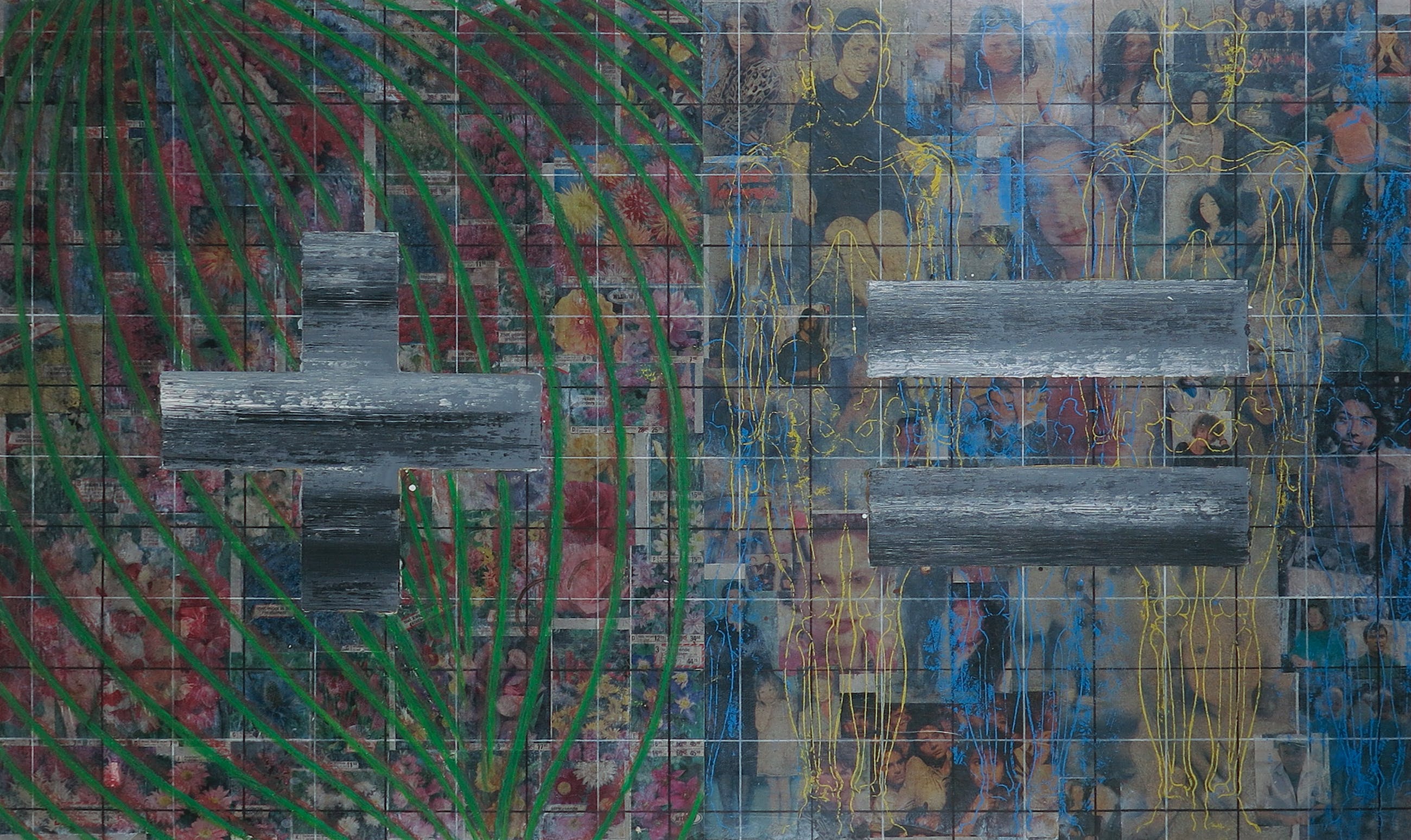 Gemengde techniek op papier (o.a. collage, pastelkrijt en acryl).