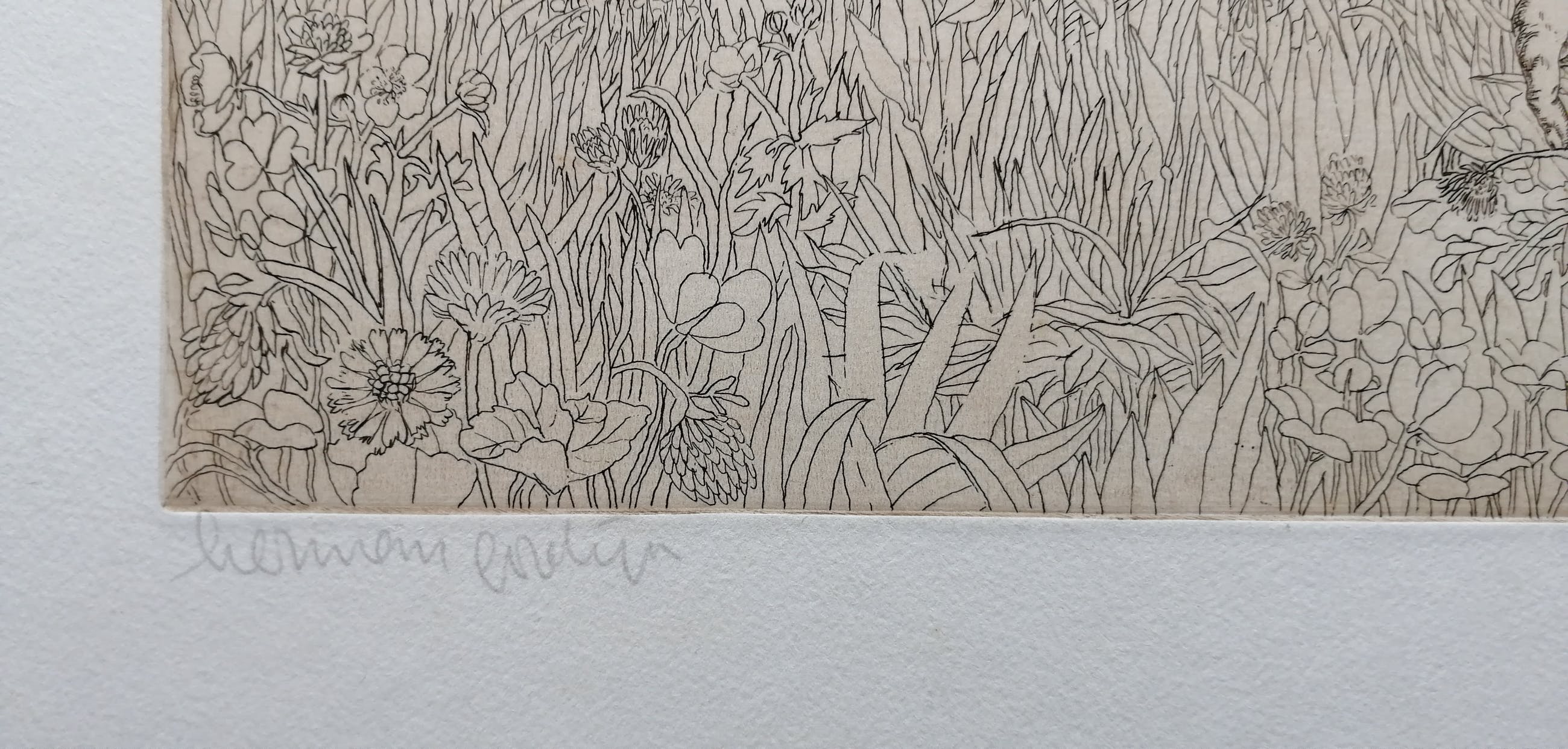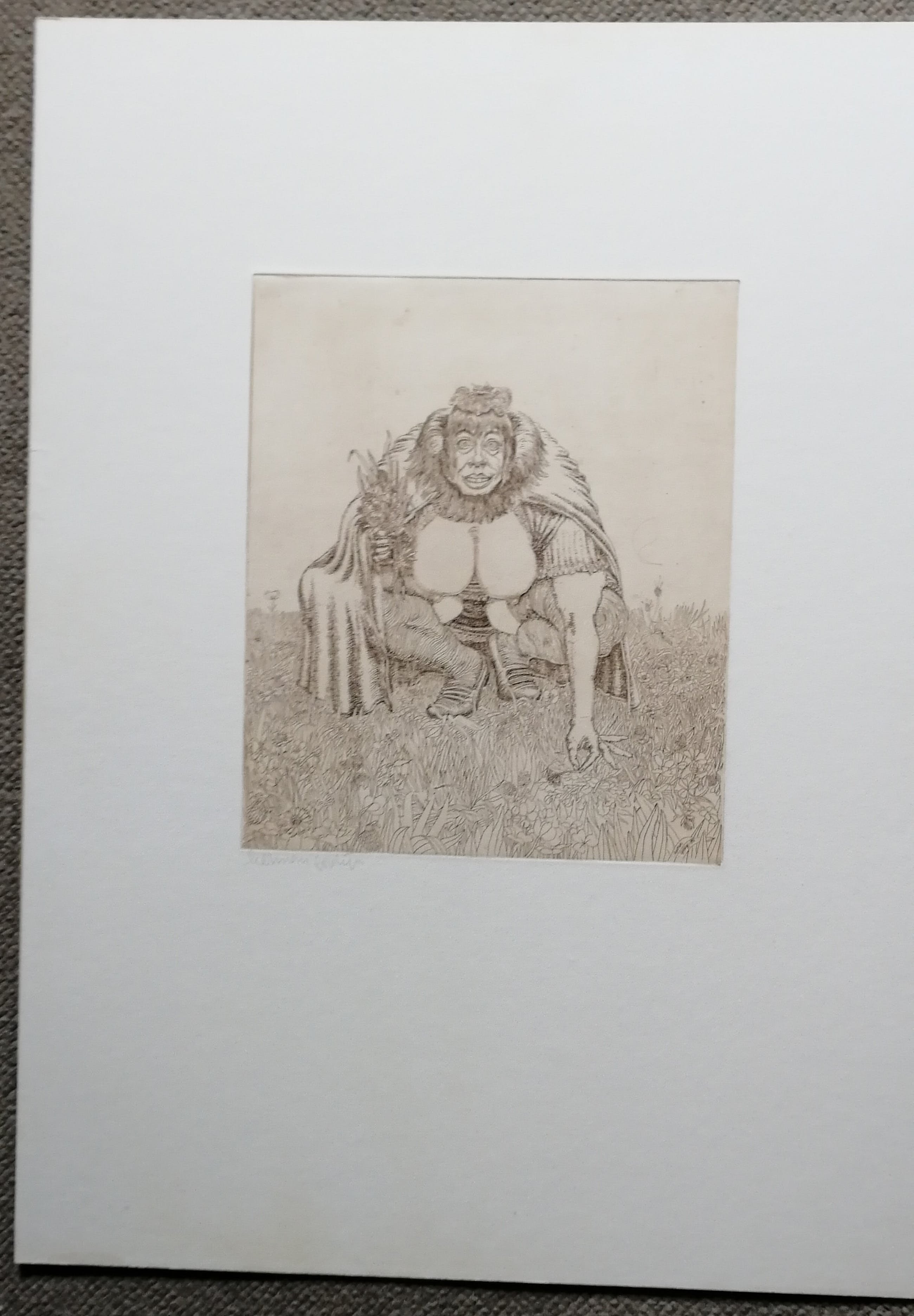 Ets uit 1983 met een typische voorstelling van Herman Gordijn.Potlood gesigneerd linksonder.In de plaat gesigneerd en gedateerd 1983 rechtsonder.De ets is opgeplakt op karton.Beeldmaat 30x25 cm. Bladmaat 65x50 cm.