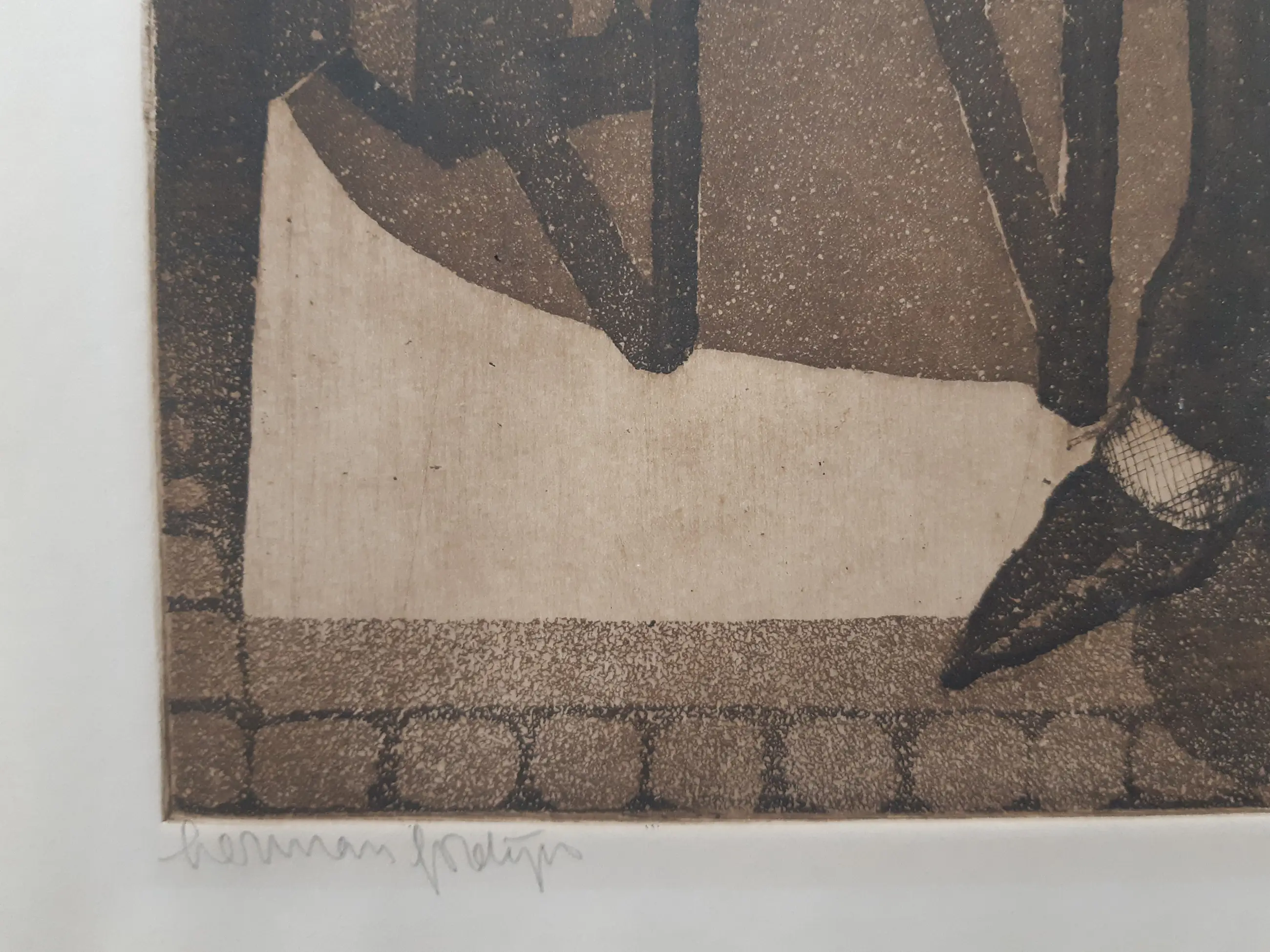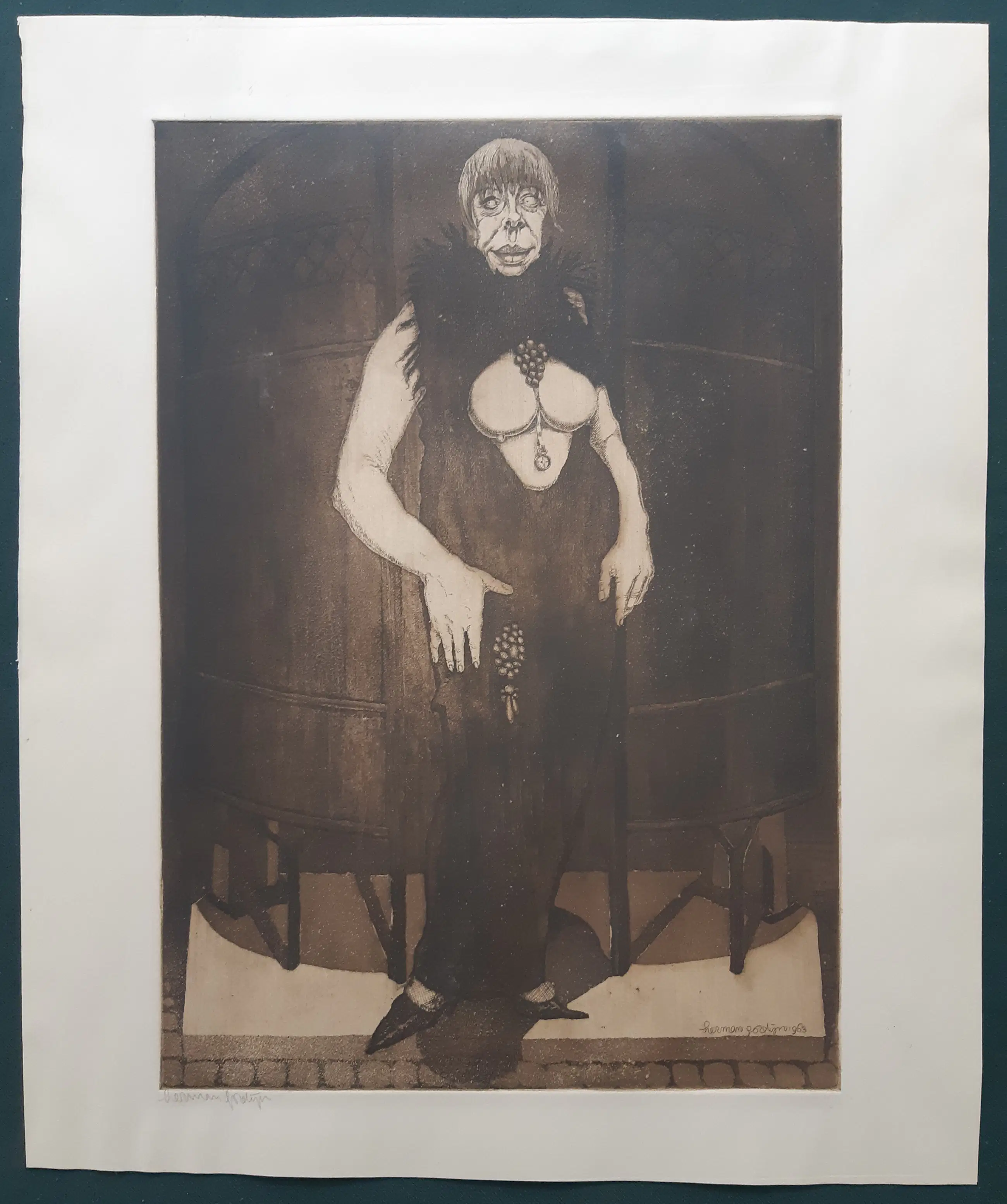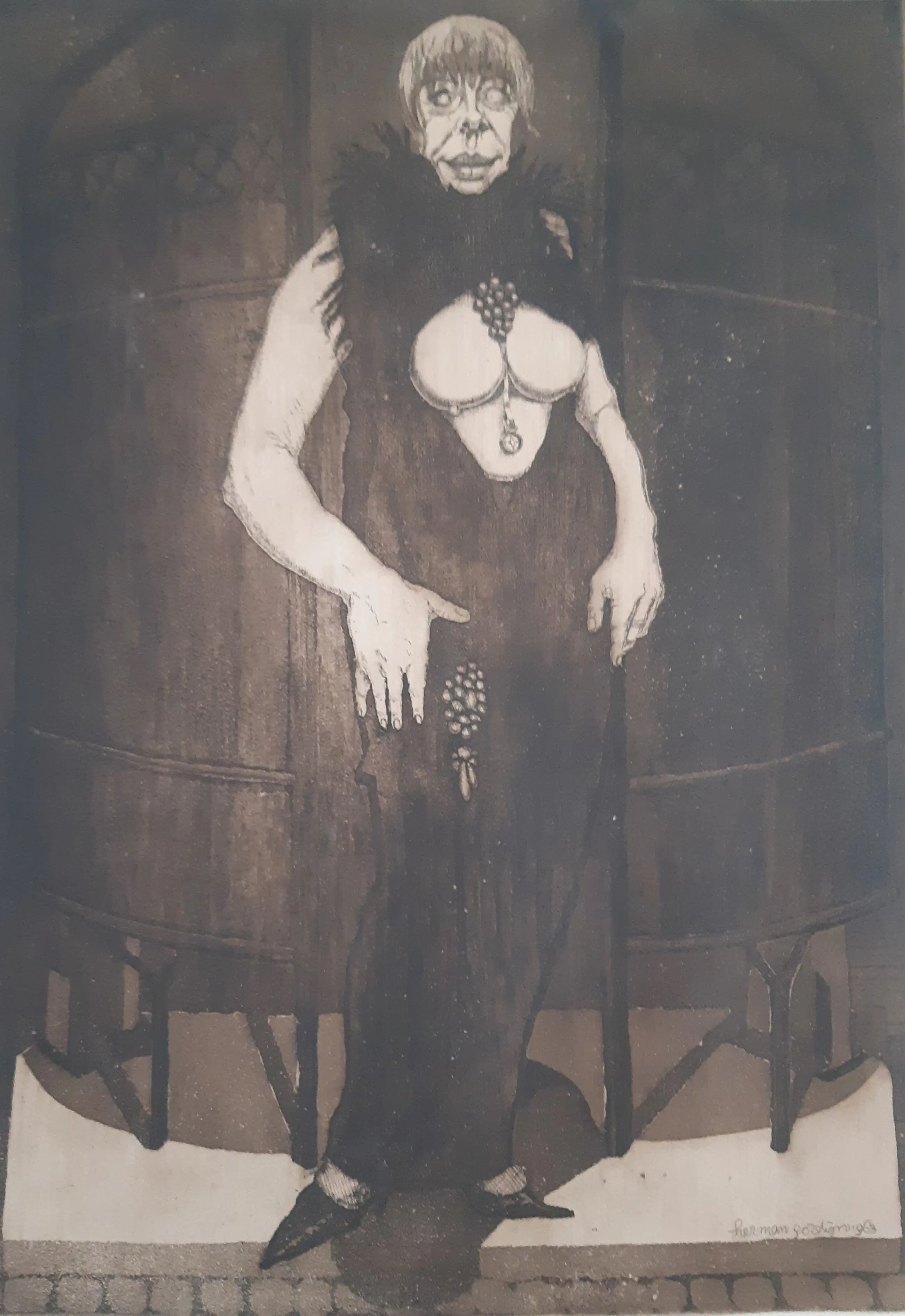 Typisch Herman Gordijn, deze ets/aquatint. Afgedrukt op geschept papier, met de hand gesigneerd, eveneens signatuur en datering in druk. De afbeelding is 40 x 28 cm. Op de achterzijde in het handschrift van Gordijn "urinoir". De conditie is uitstekend, plakbandrest op de achterkant.
