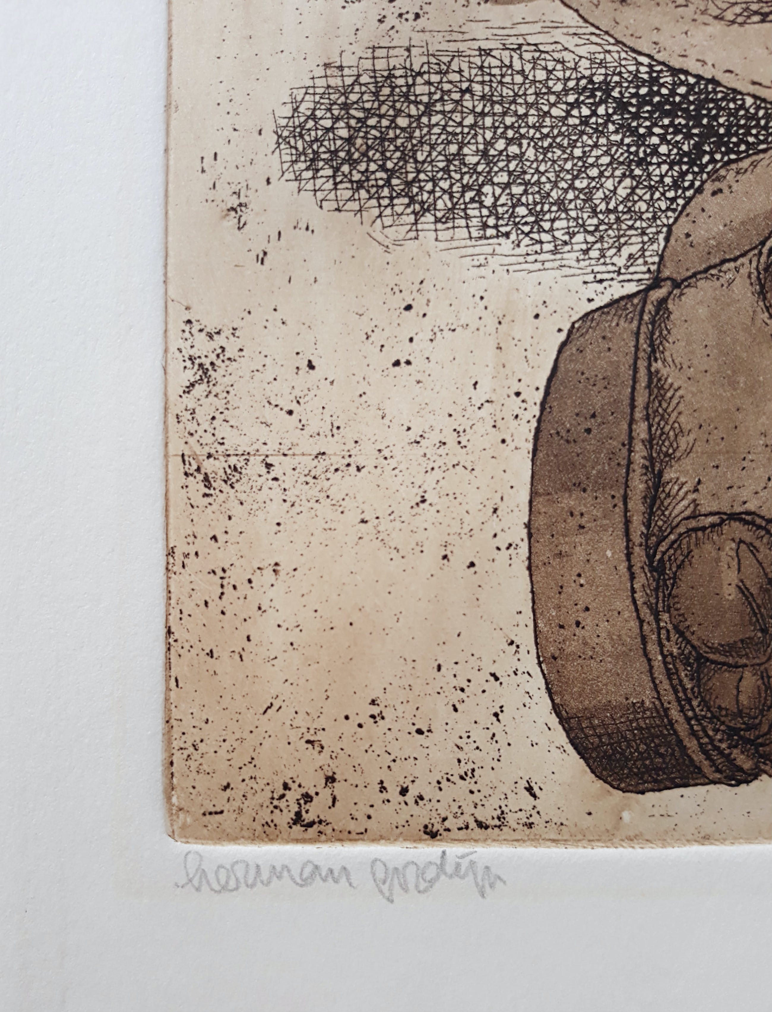 Prachtig, karakteristiek portret door Herman Gordijn. Aquatint ets op geschept papier, met potlood gesigneerd en genummerd (25/30), te dateren eind jaren 70 (waarschijnlijk 1977). In goede conditie, blad heeft ingelijst gezeten want er is een lichte verkleuring binnen een vorig passe-partout en in de marge zitten wat vlekjes. Opnieuw ingelijst met passe-partout is het werk perfect want het etsbeeld is uitstekend.
