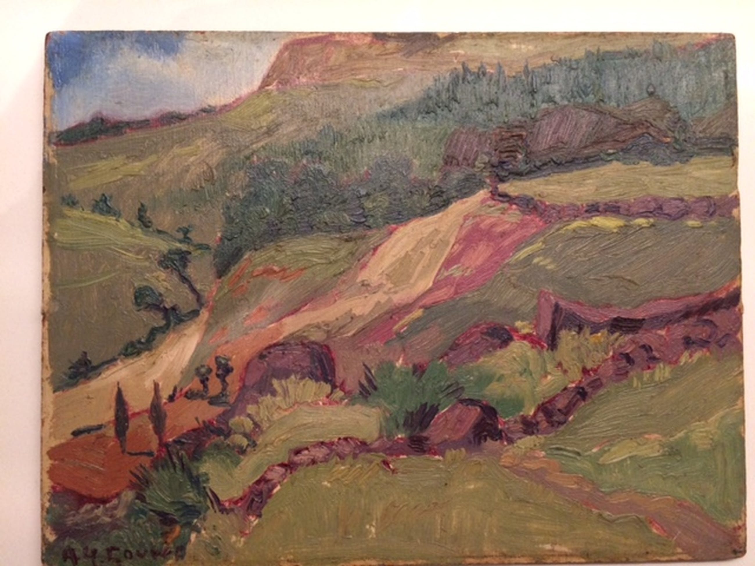 Charmant landschap van de bekende schilder A.H, (Herman) Gouwe. Met (eenvoudige) lijst. Waarschijnlijk een vroeg werk van hem uit de periode dat hij rondtrok in Spanje en Italie (1903-1905).