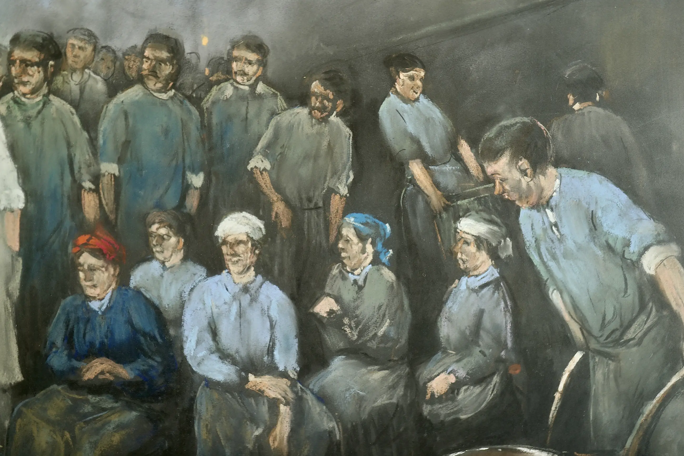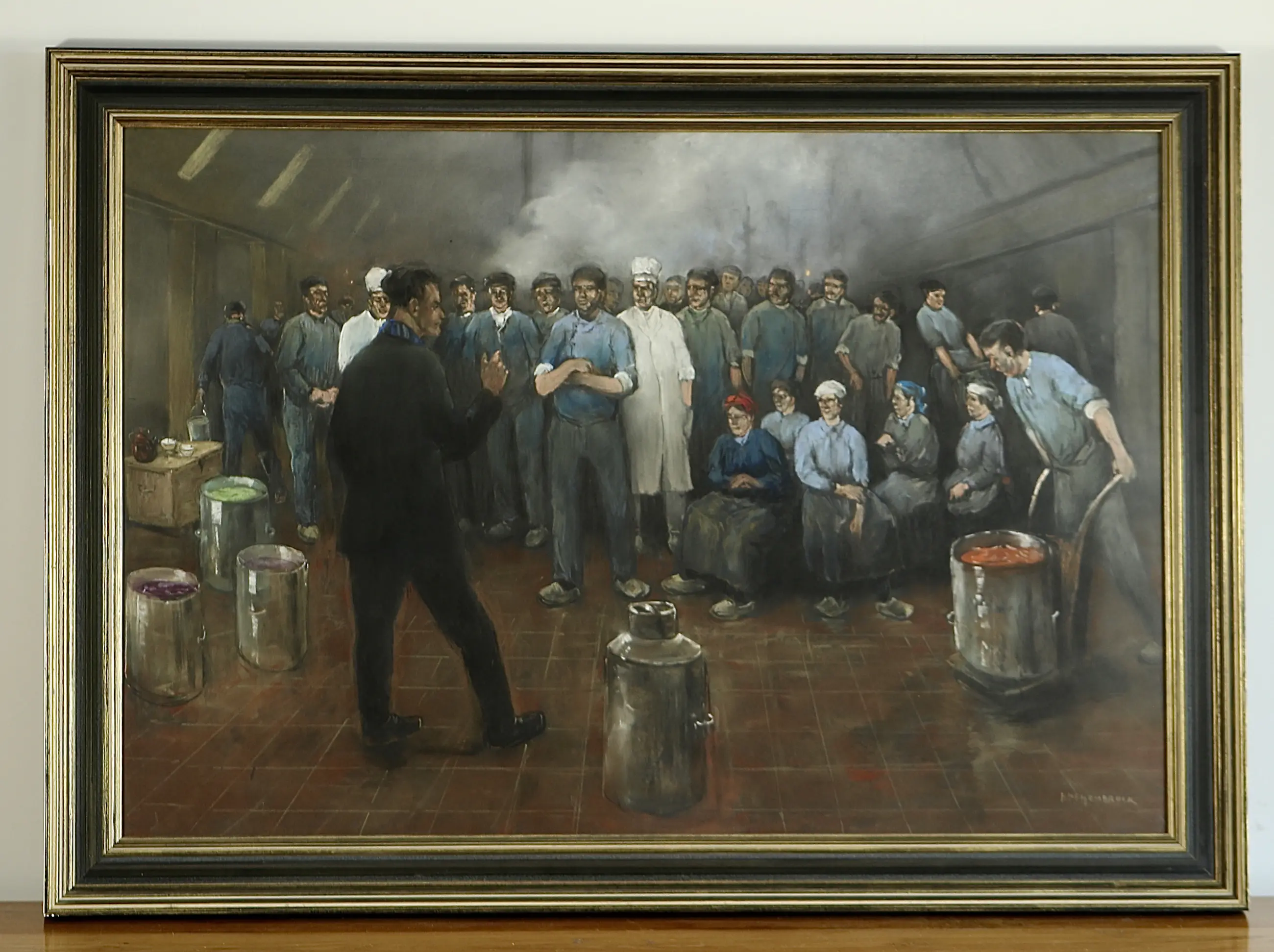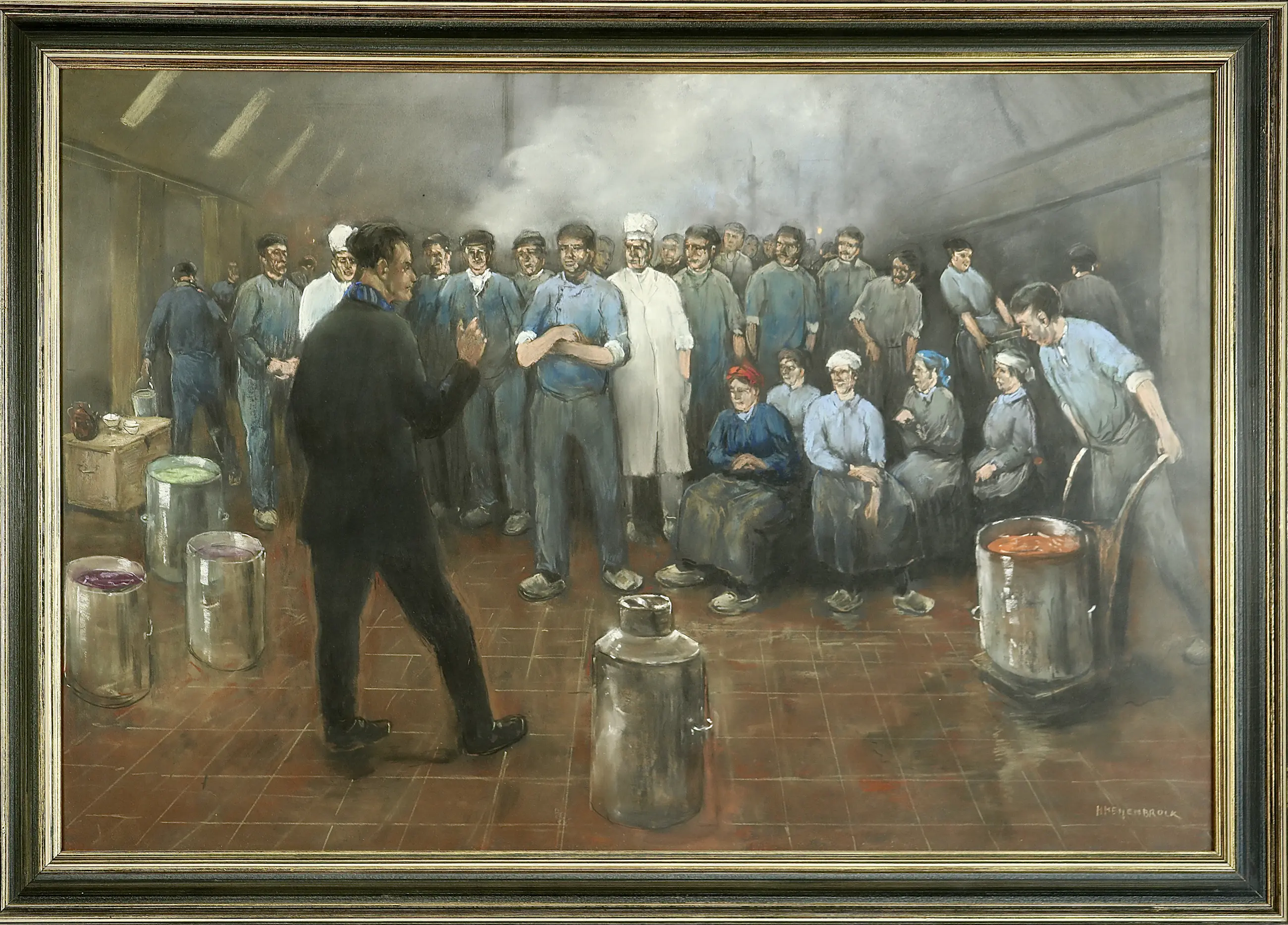 Overleg in de fabriek, heet dit schitterend werk (pastel) van Herman Heijenbrock (1871-1948). De afmetingen zijn 62 x 92 cm / 76 x 106 cm