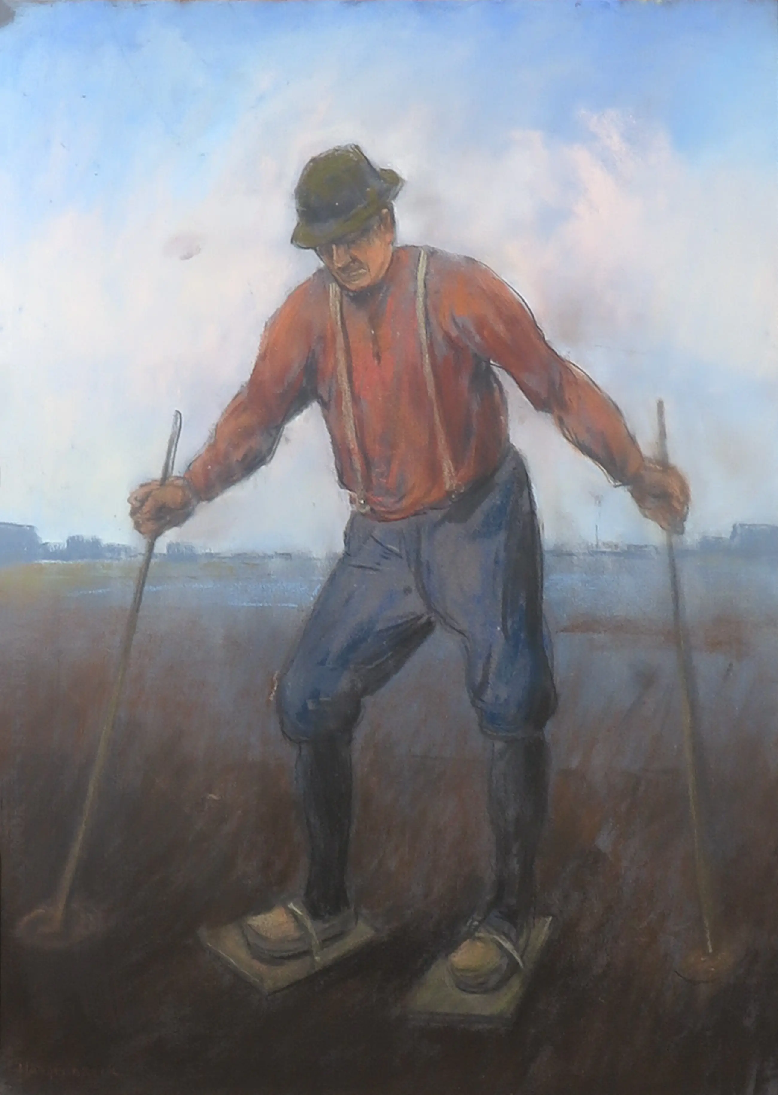 Over het algemeen is de voorstelling in goede staat: het werk zit wat scheef ingelijst en er zijn wat vegen in het krijt te zien. Een wat langere kreuk/veeg linksonder. Bovendien bevinden er zich wat haartjes achter de glasplaat. De lijst bevat wat beschadigingen. | |
