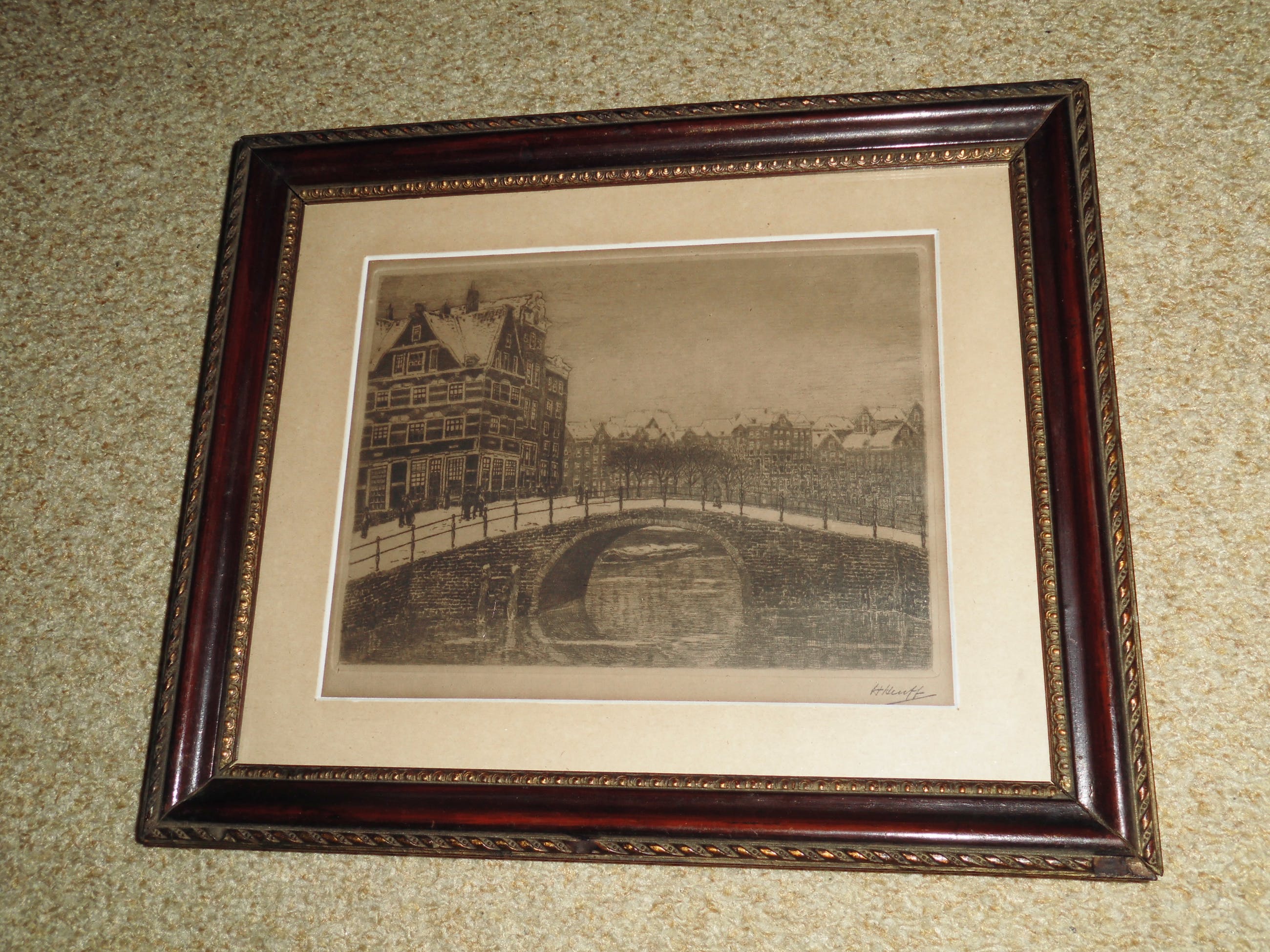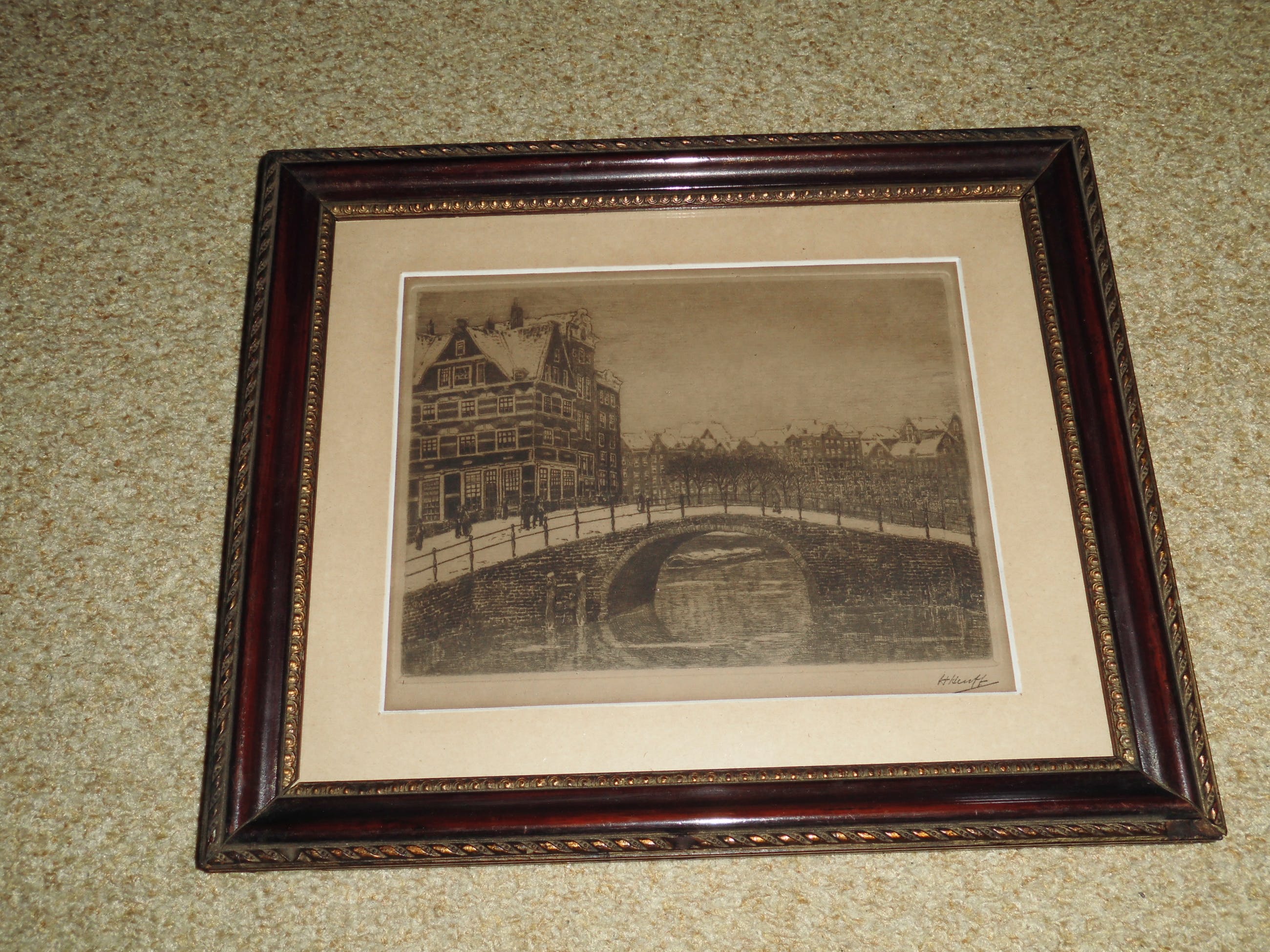 Mooie Oude Ets van Herman Heuff Besneeuwd "Stadsgrachtgezicht" vermoedelijk Amsterdam afmeting ets = 14 x 20 cm afmeting totaal = 26 x 30 cm Oude lijst , heeft zijn plekjes Oude maar goede staat [zie foto's] verzendkosten = 6,95 euro of AFHALEN