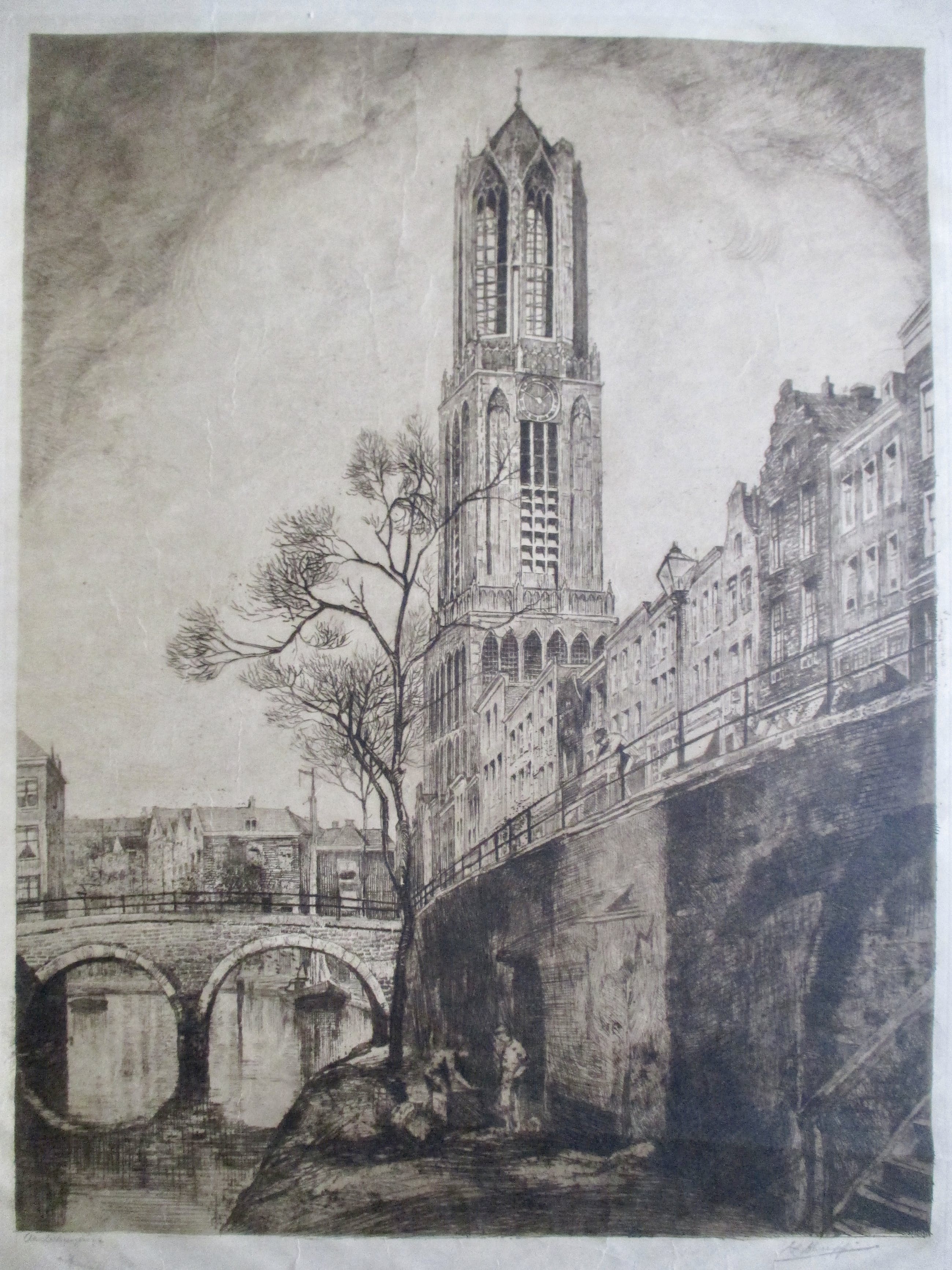 Fraaie grote ets van Herman Heuff van de domtoren in Utrecht, gesigneerd en getiteld in potlood. verzending tussen twee platen, 9,25, aangetekend 11,20