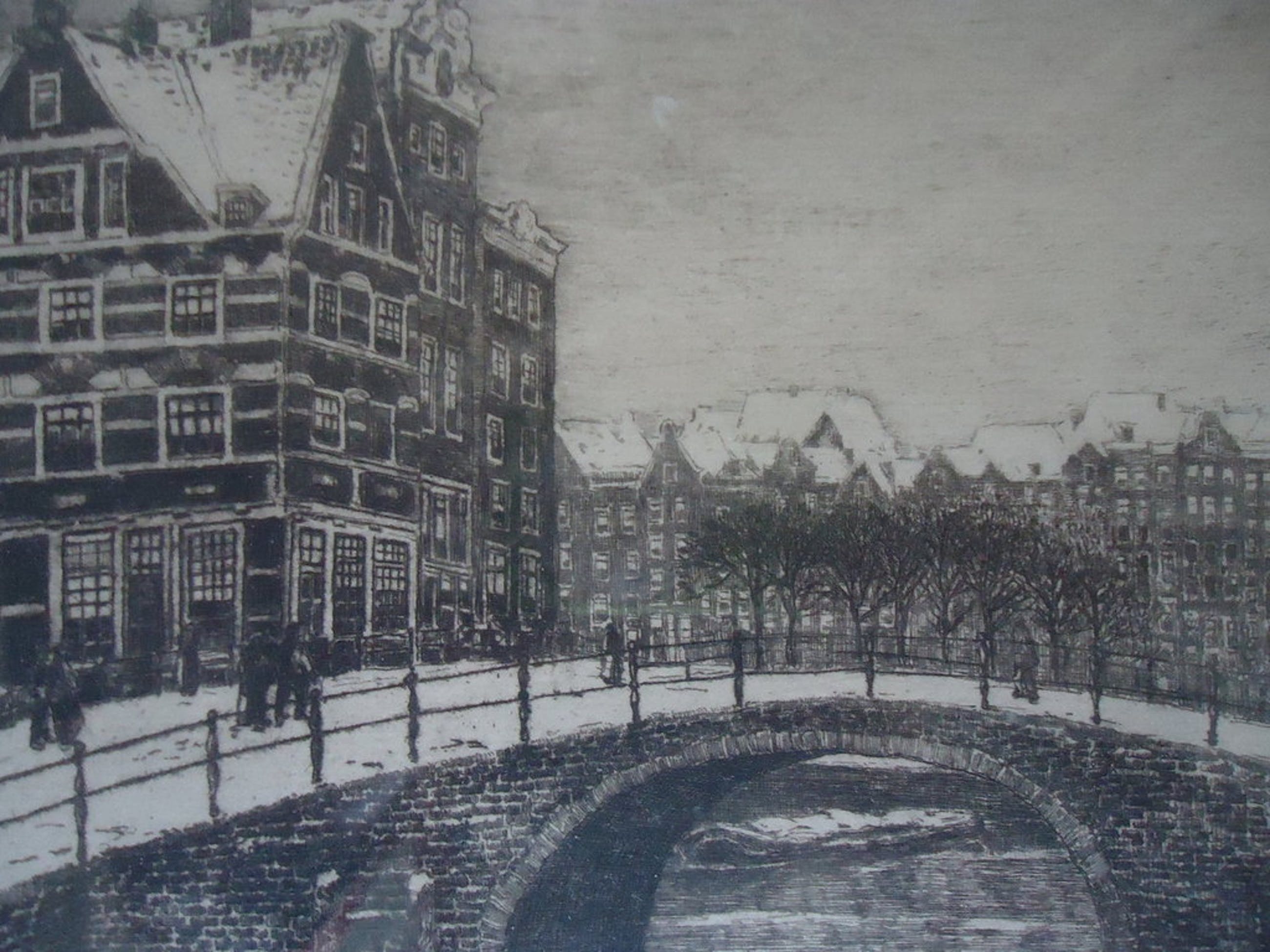 Ets van de Grachtengezicht in de winter te Amsterdam.