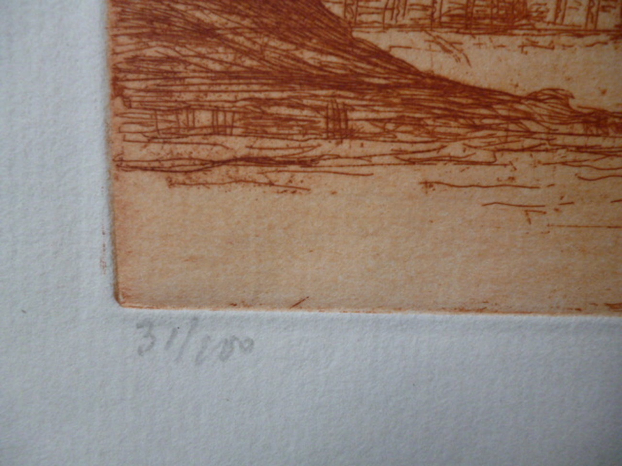 Ets in rood afgedrukt. Potlood gesigneerd rechtsonder. Genummerd 31/100 linksonder.