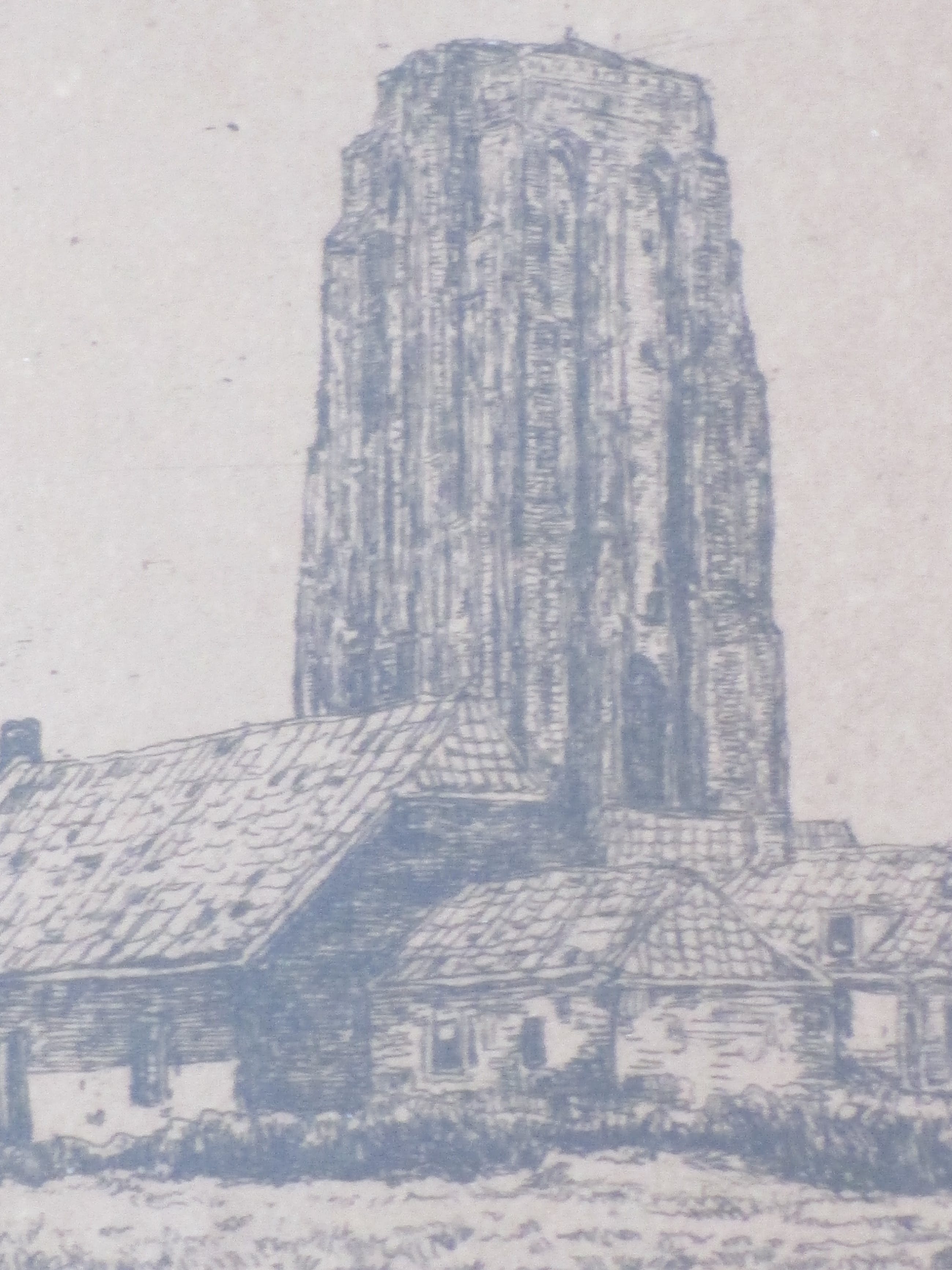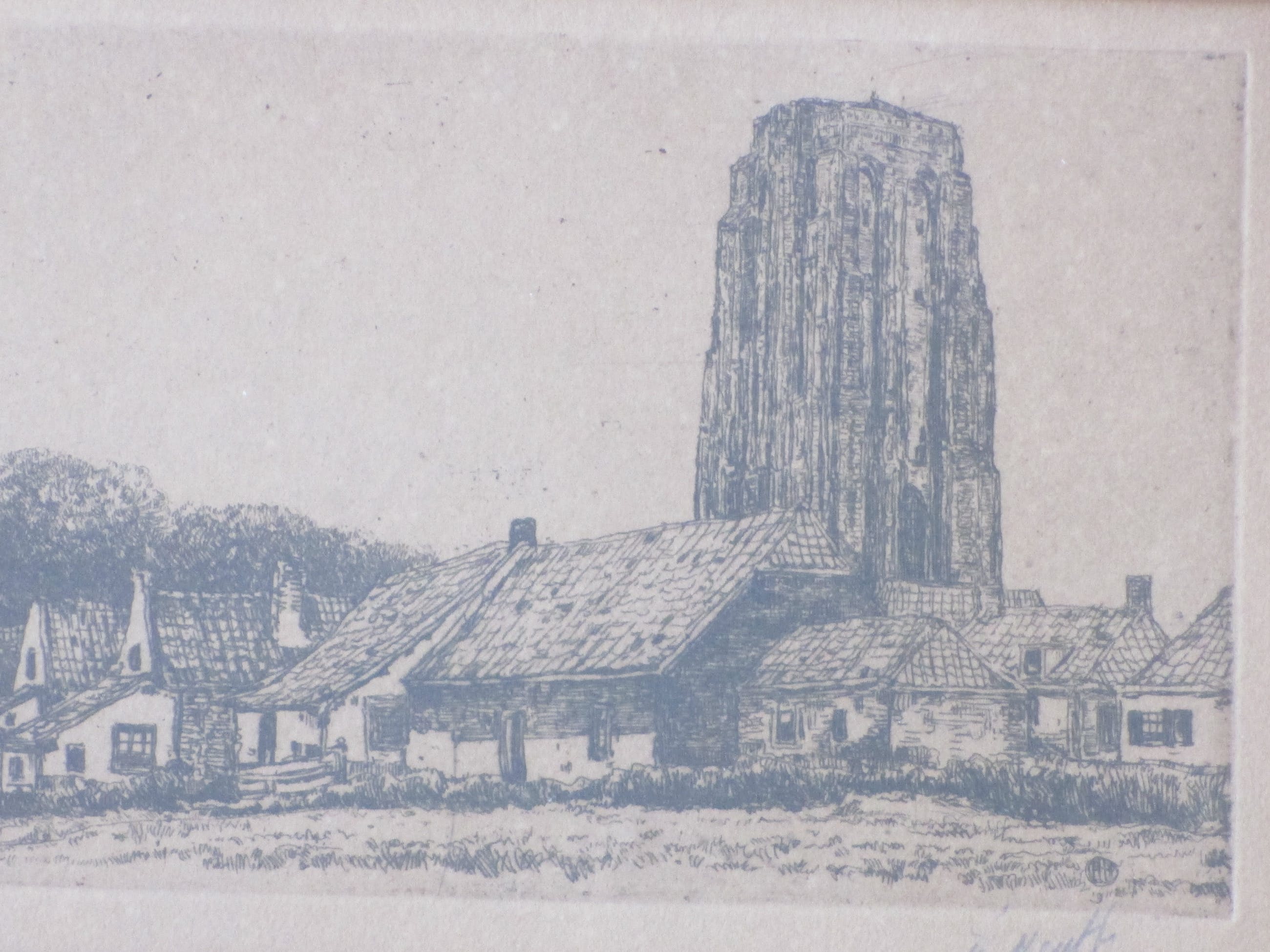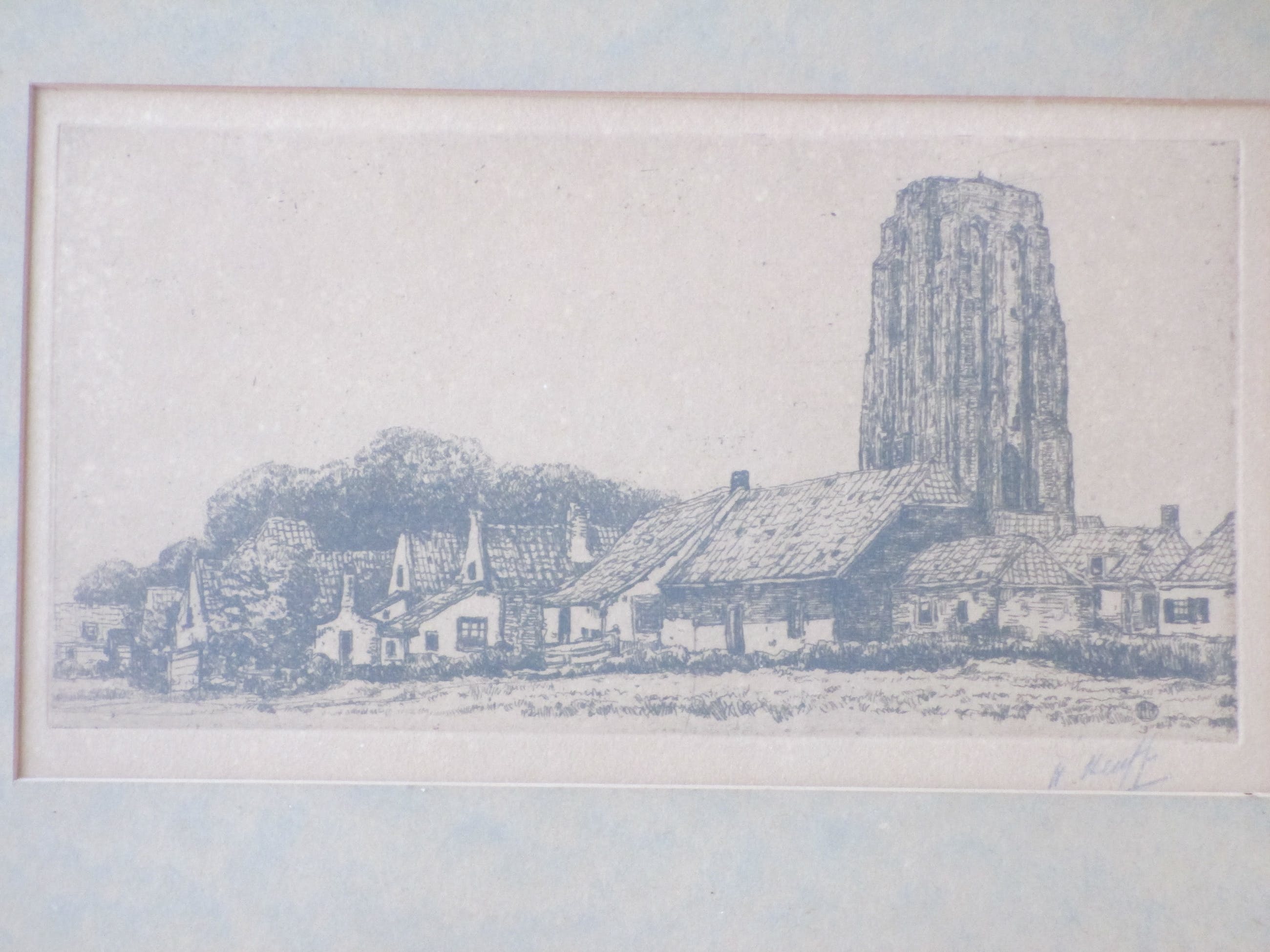 Ets door Herman Heuff Voorstelling van de St Lievens Monstertoren in Zierikzee Gelijst, beeldmaat 10x19, lijstmaat 24x35 Gesigneerd in potlood r.o.: 'H.Heuff' Tevens gemonogrammeerd in de druk r.o.: 'HH' Authenticiteit volledig gegarandeerd.