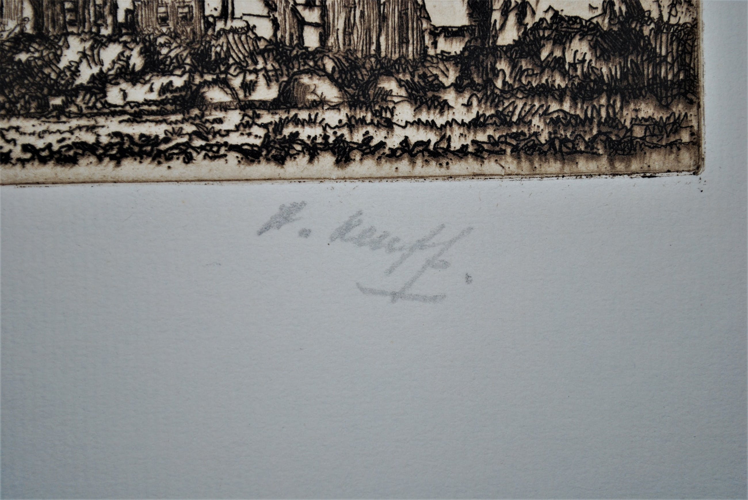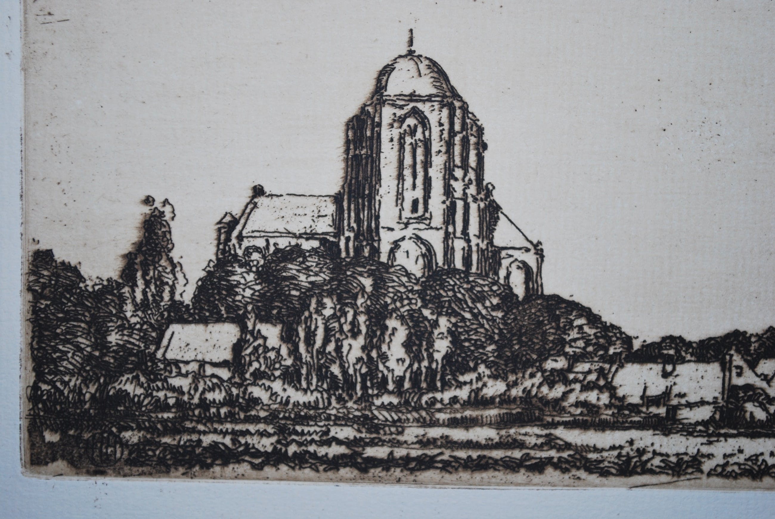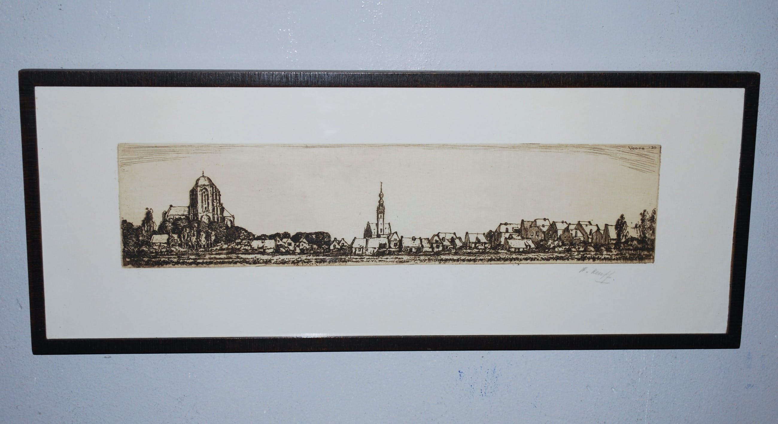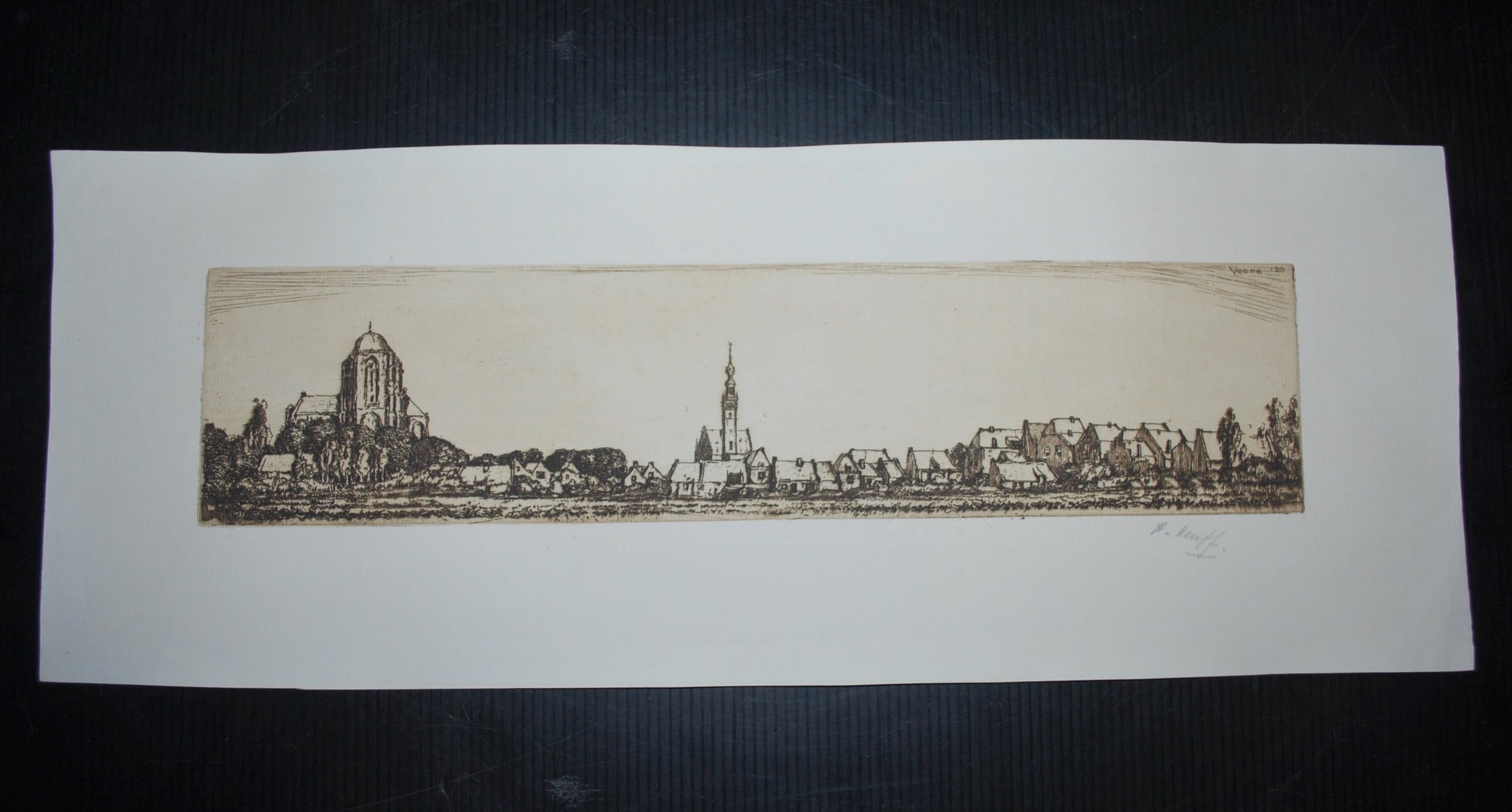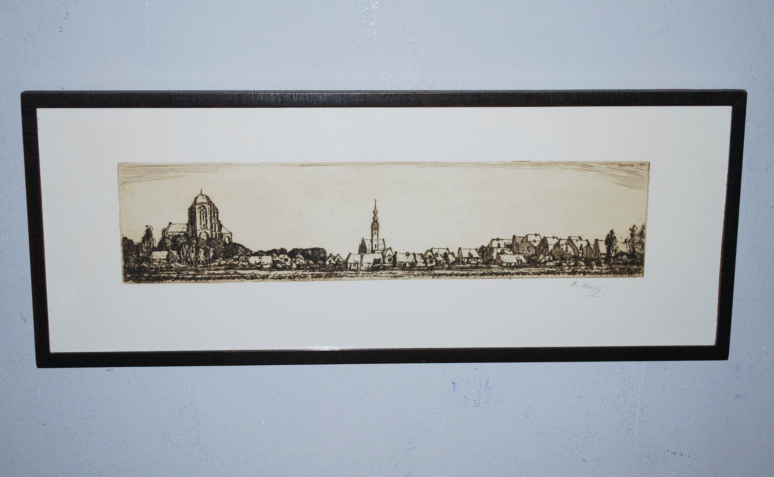 Bladmaat ca. 18x48 cm, in schone en heldere staat. Los geplaatst achter glas in de oorspronkelijke donkerbruine lijst (met slijtschade). Met potlood gesigneerd r.o. en 'Veere 20' in de plaat r.b.
