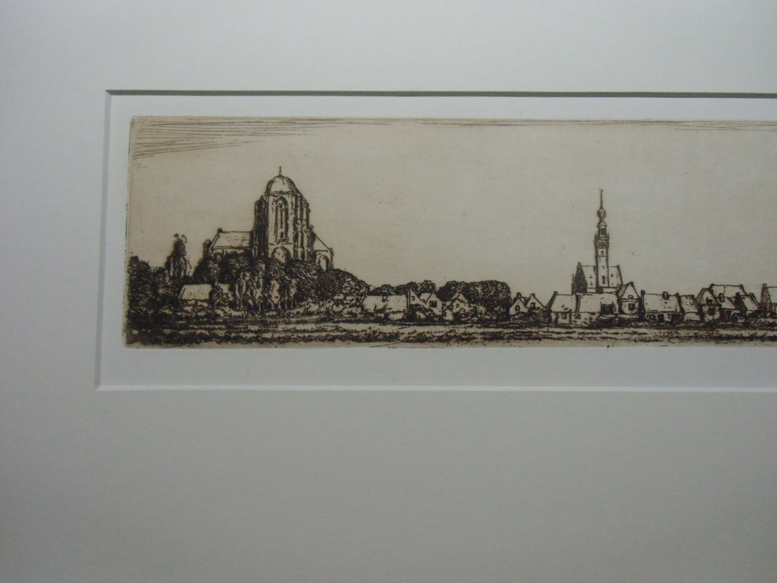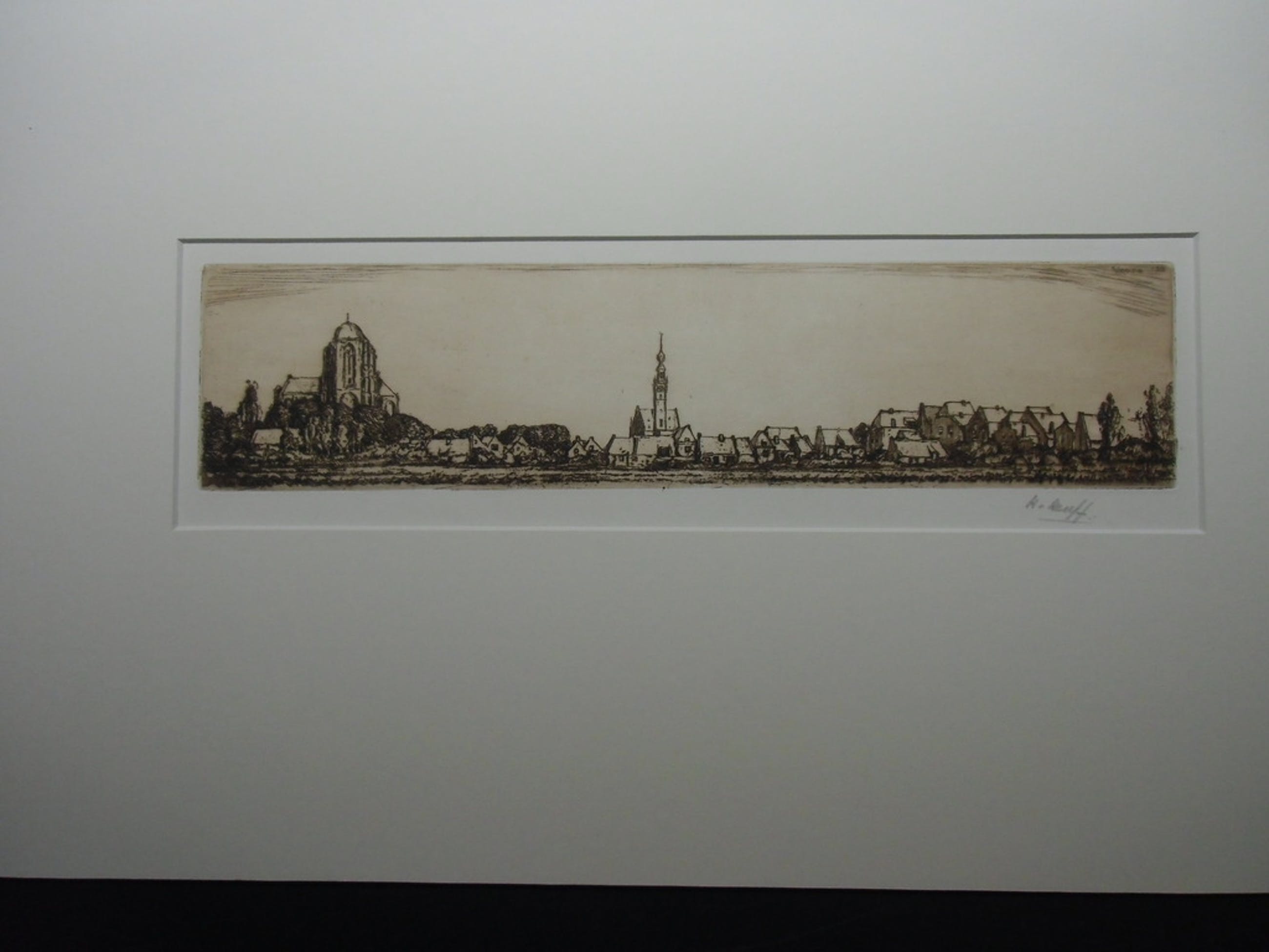 Dit bijzondere gezicht op Veere dateert uit 1920 en is gemaakt door Herman Davinus Heuff ( Den Haag 1875- 1945 Heemstede). De ets is afgedrukt in bruine inkt op vergé papier en is in zeer goede conditie. Gesigneerd in potlood r.o. en Veere en '20 in de plaat r.b. Het beeldformaat is 9 x 37.7 cm op een blad van 27 x 49.5 cm.