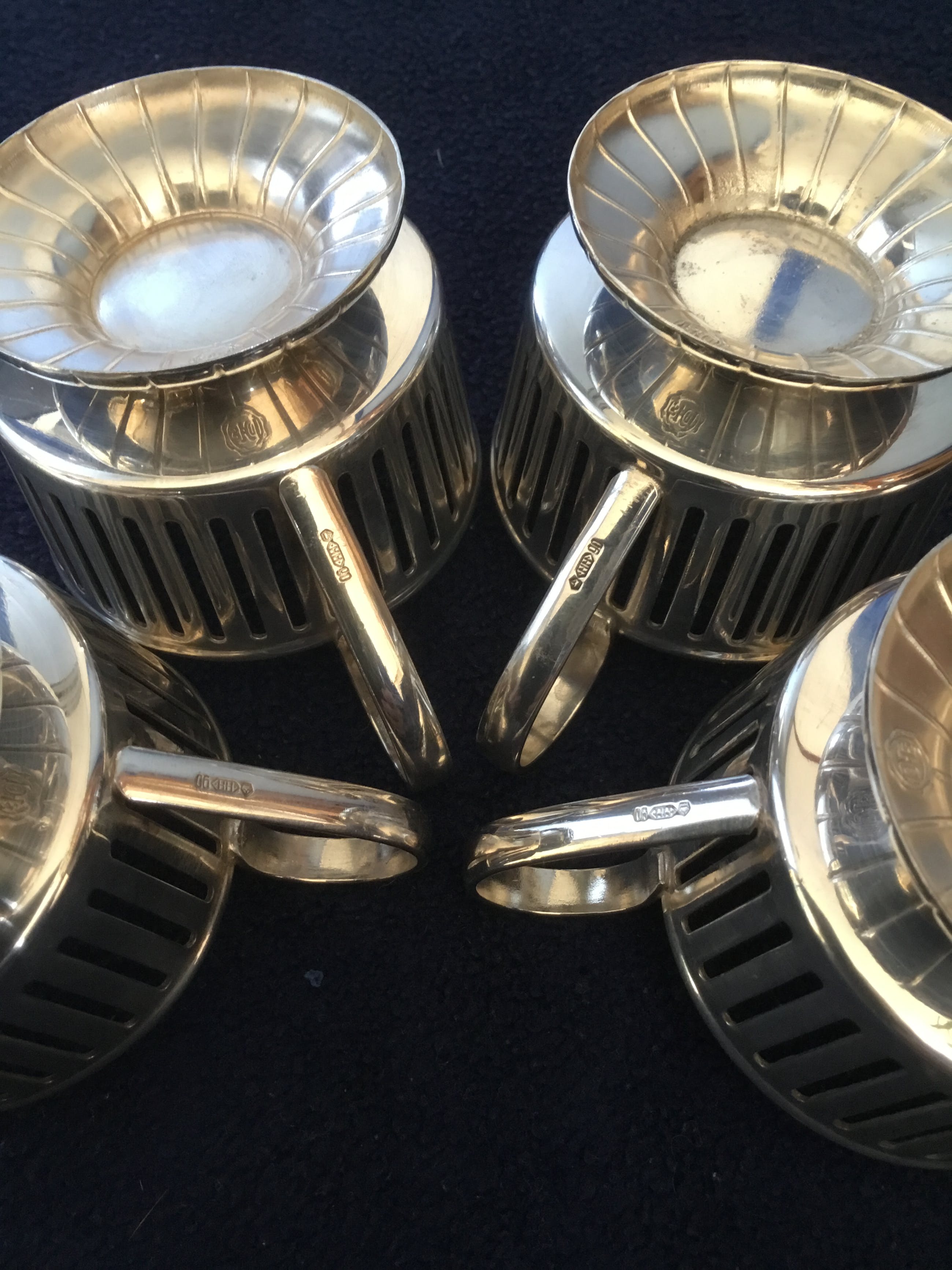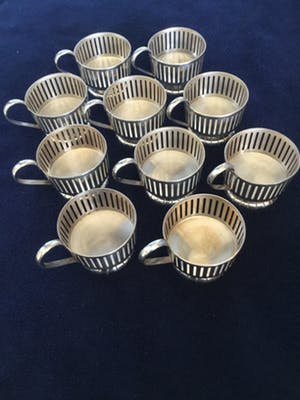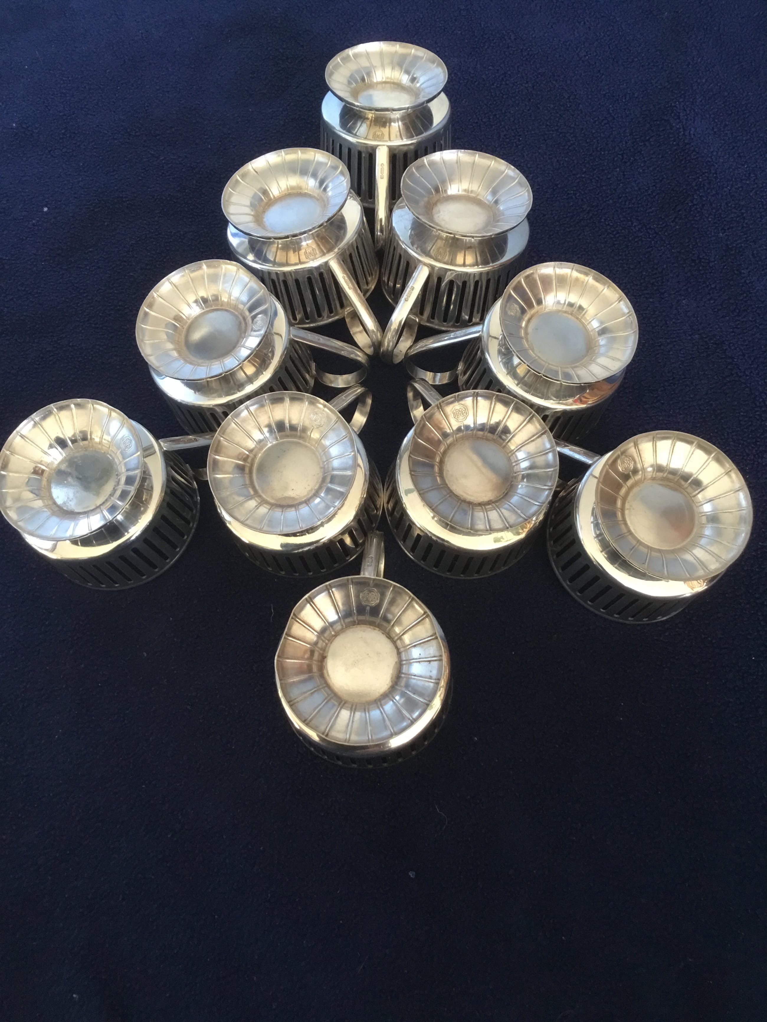 10 Mooie glashouders gemaakt door Herman Hooykaas uit Schoonhoven. Gemerkt met HH (Herman Hooykaas), DE (Douwe Egberts) en 90 (Zwaar verzilverd) Mooi gebruiks- of siervoorwerpen uit de jaren ‘70. (Zonder bijbehorend glas, die kwamen vaak bij Jena glas vandaan)