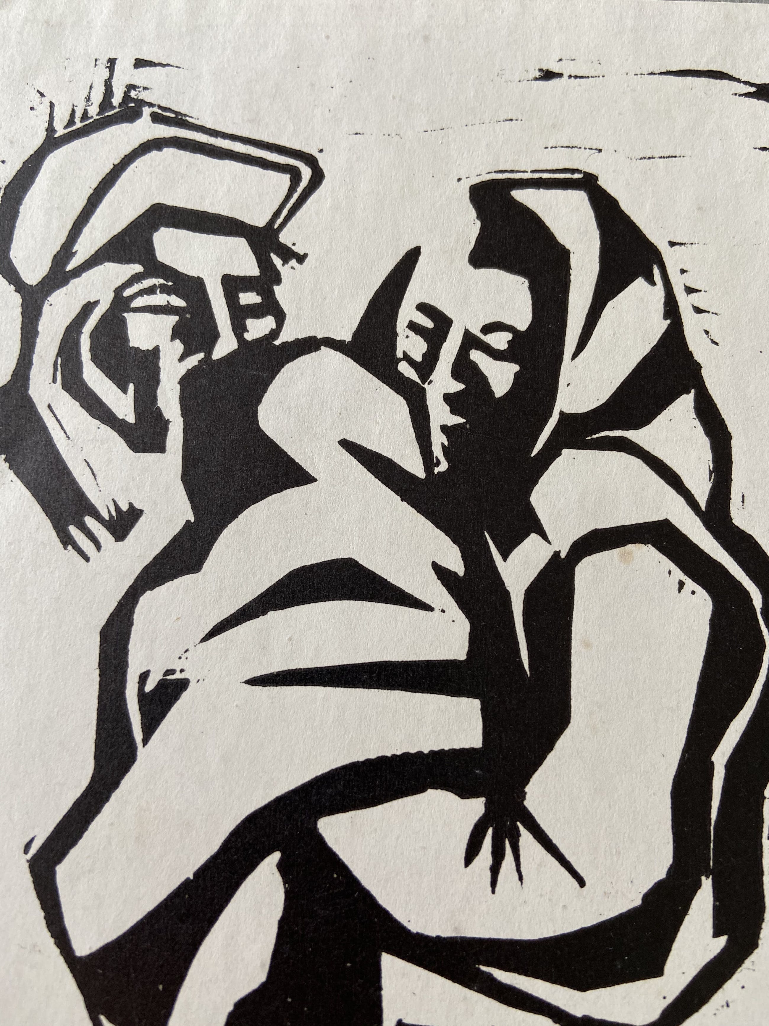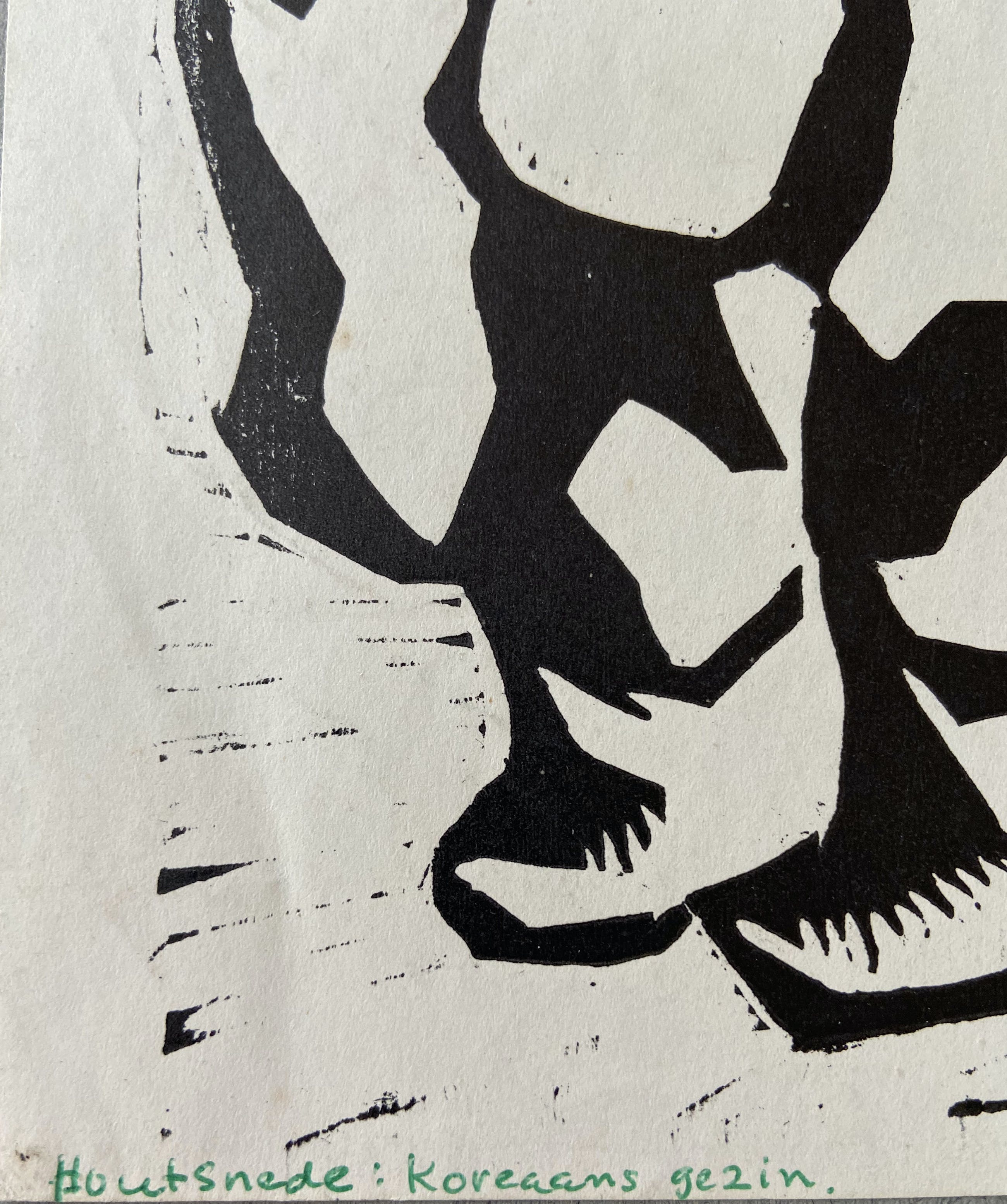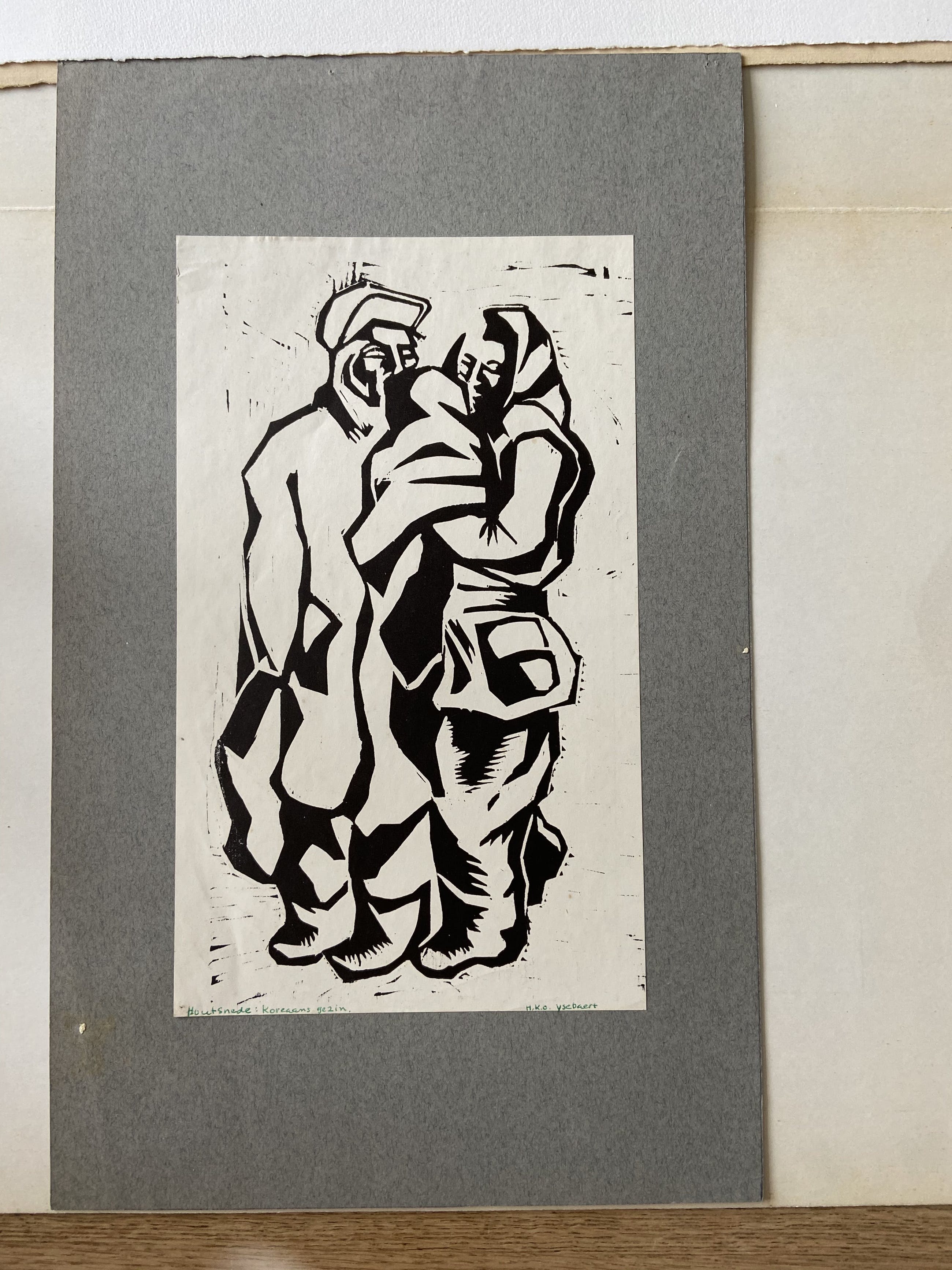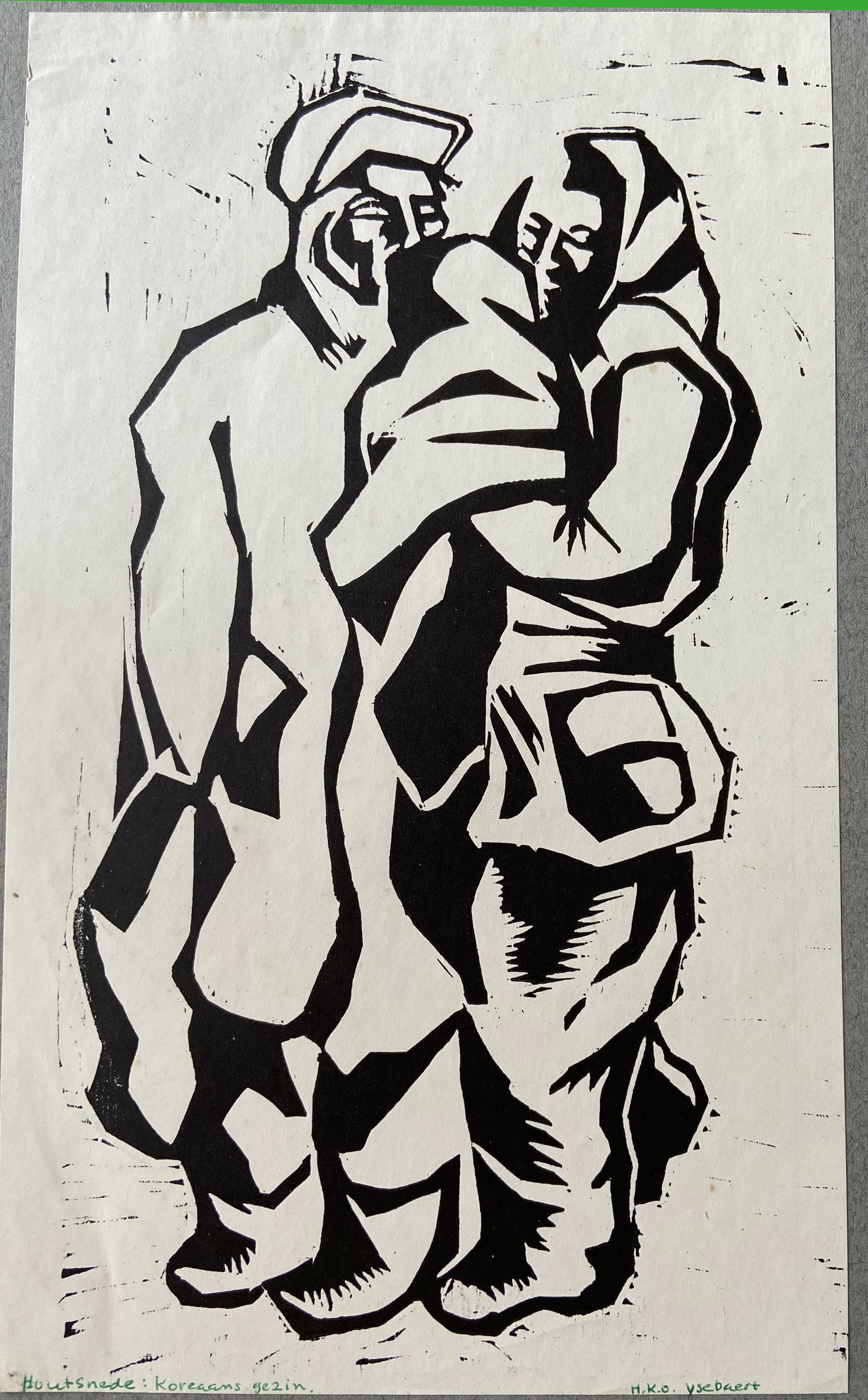 Houtsnede van een Koreaans gezin, man en vrouw met baby, dik ingepakt voor de Koreaanse winter. waarschijnlijk te dateren ten tijde van de Koreaanse oorlog erin jaren 50 van de vorige eeuw.
