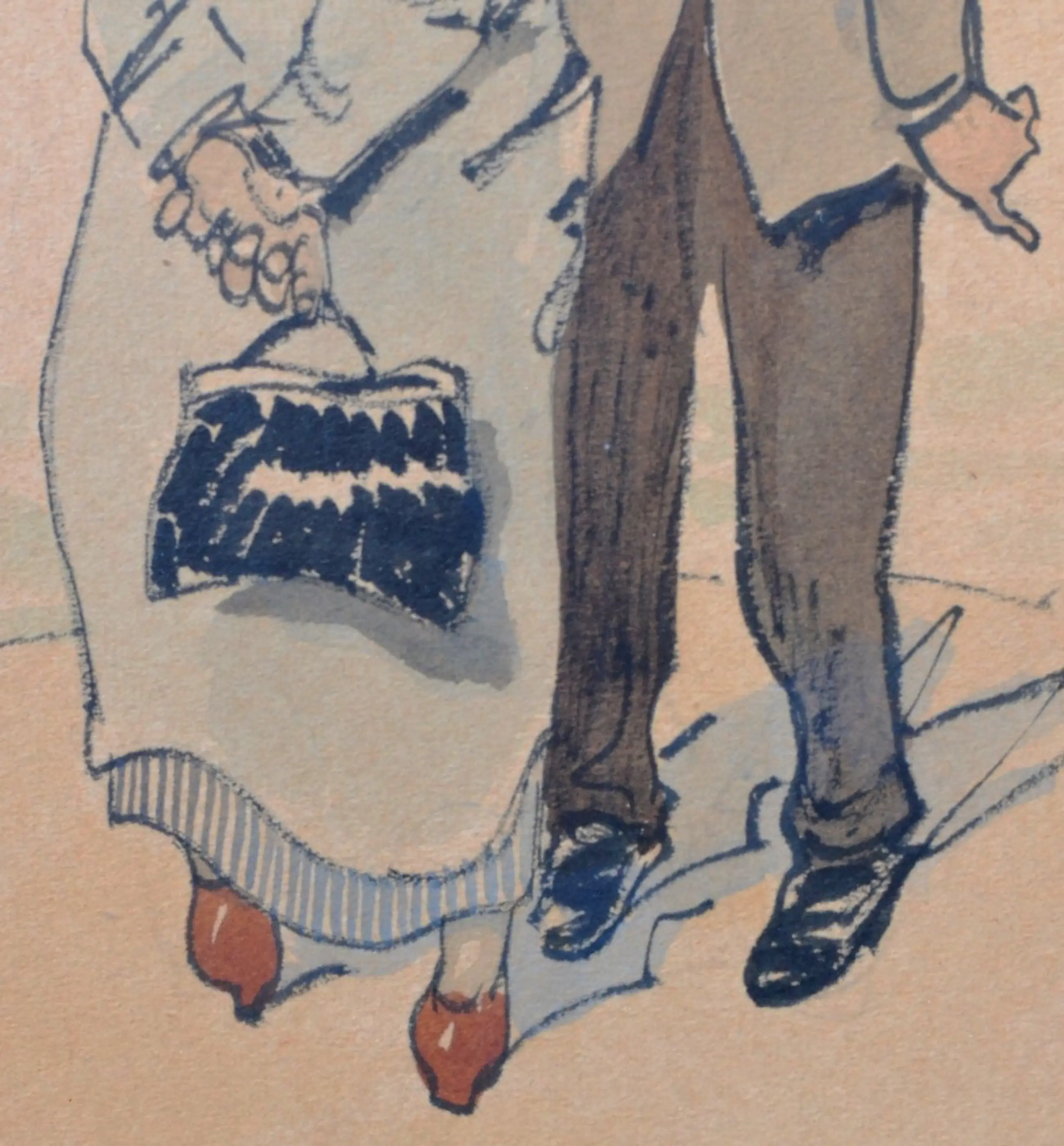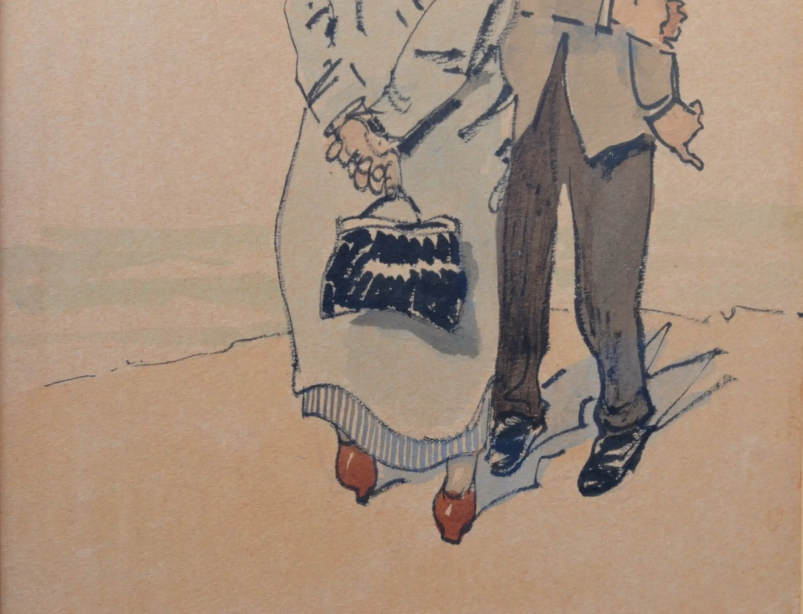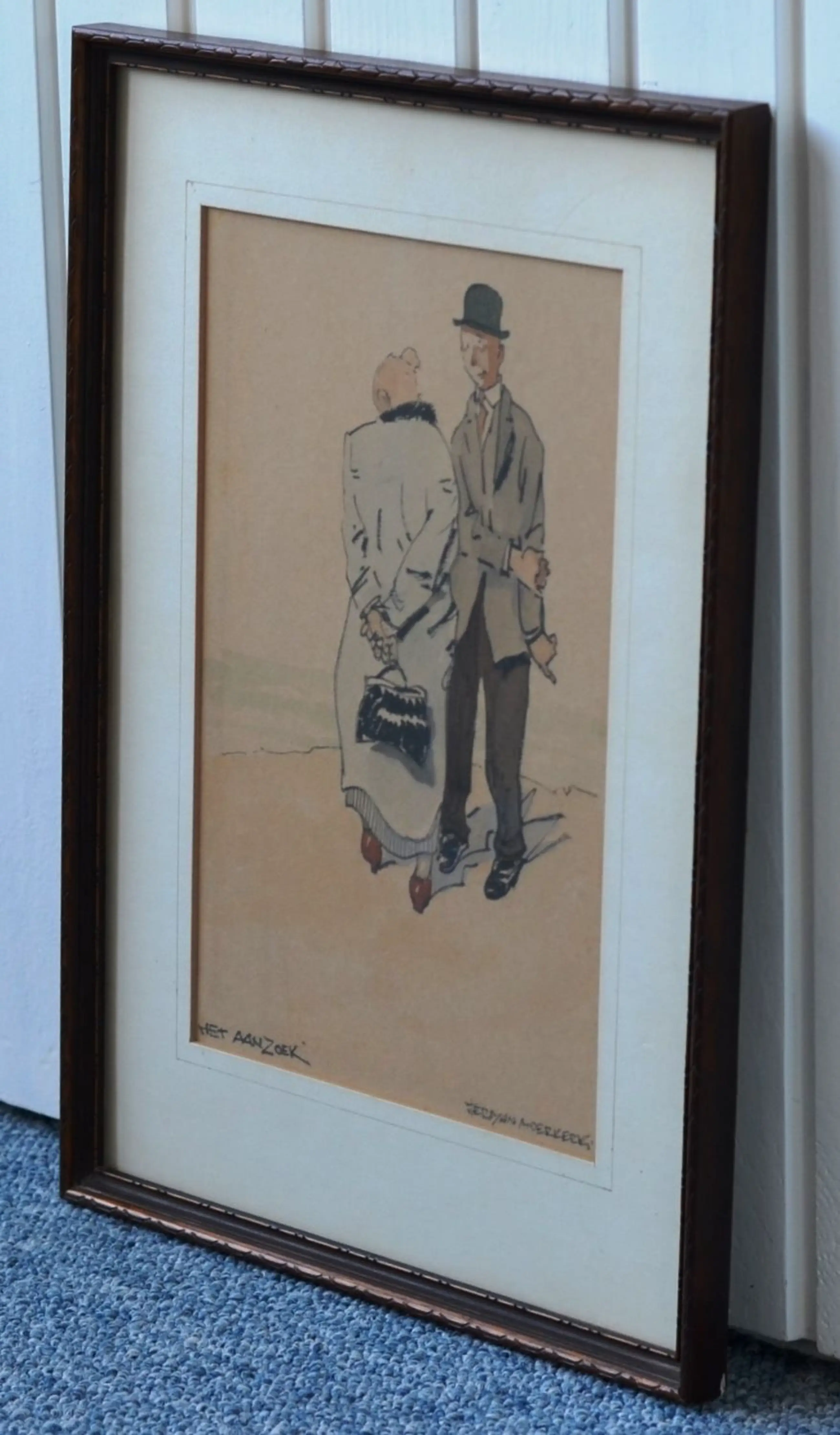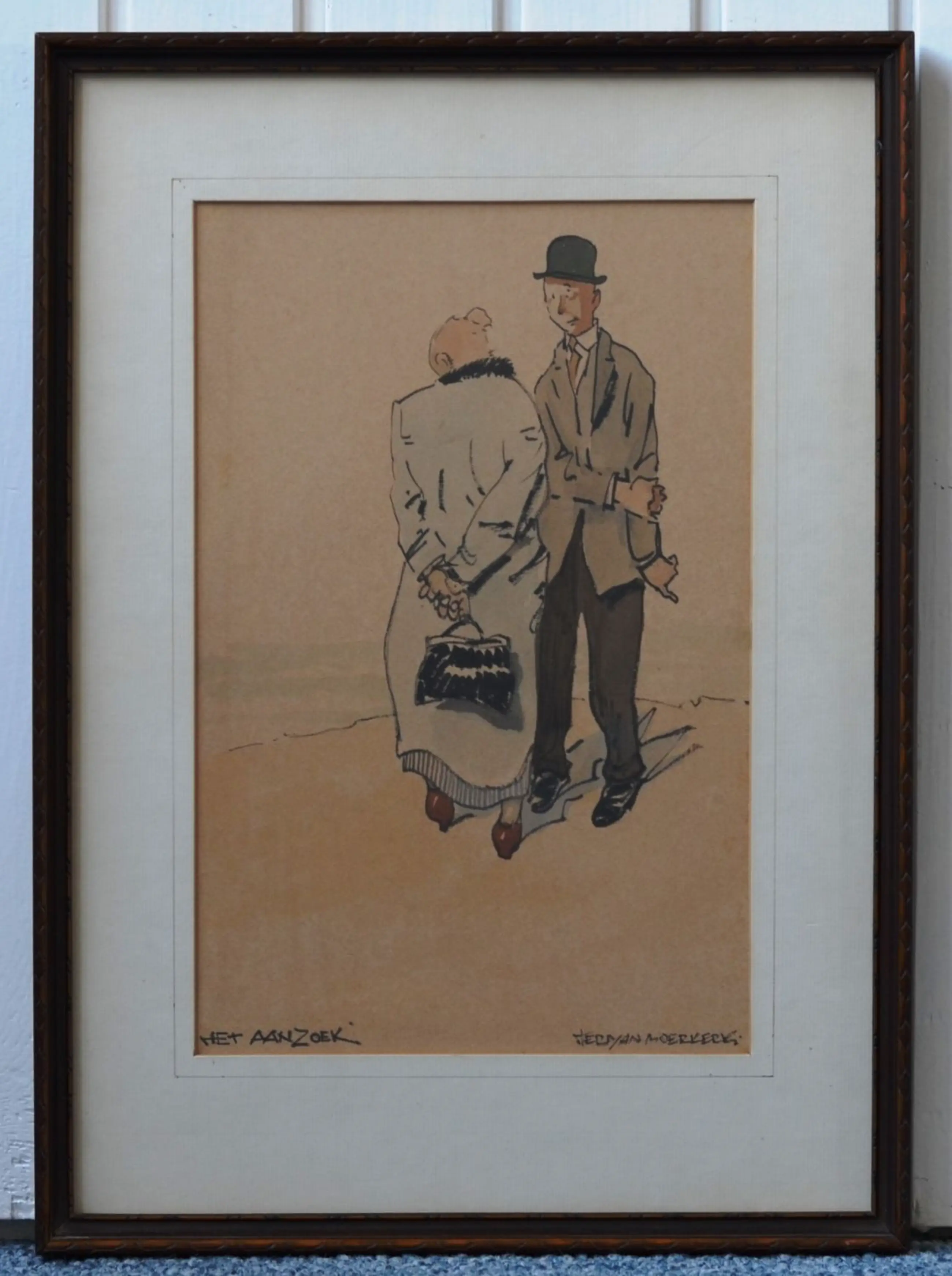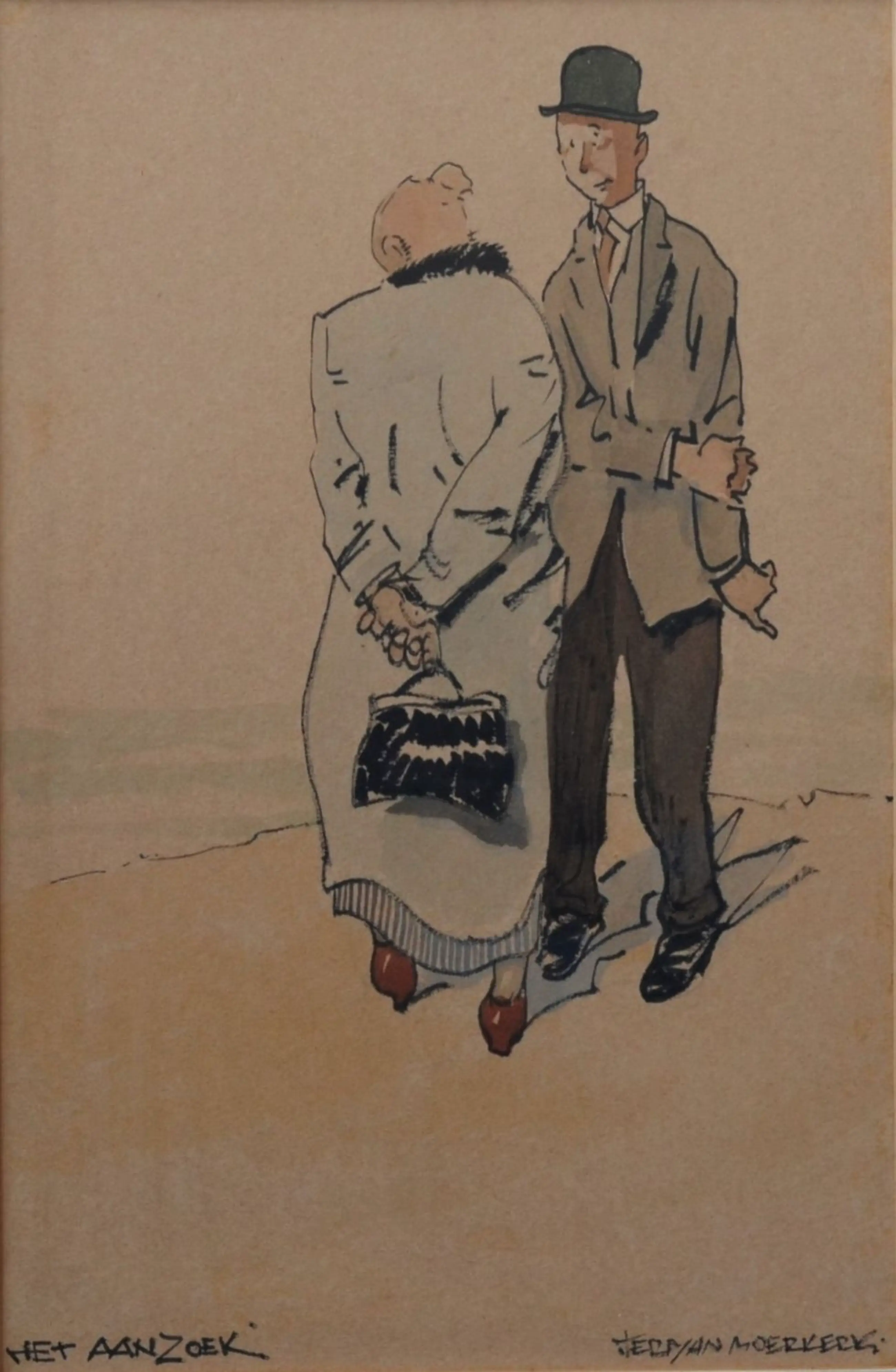 Een karikatuur van een (vermoedelijk) Brabantse man en vrouw met als titel 'Het aanzoek'. Het betreft een gemengde techniek van een tekening (krijt) met aquarel. De dagmaat van het kunstwerk binnen het passe-partout is 25 x 16 cm.