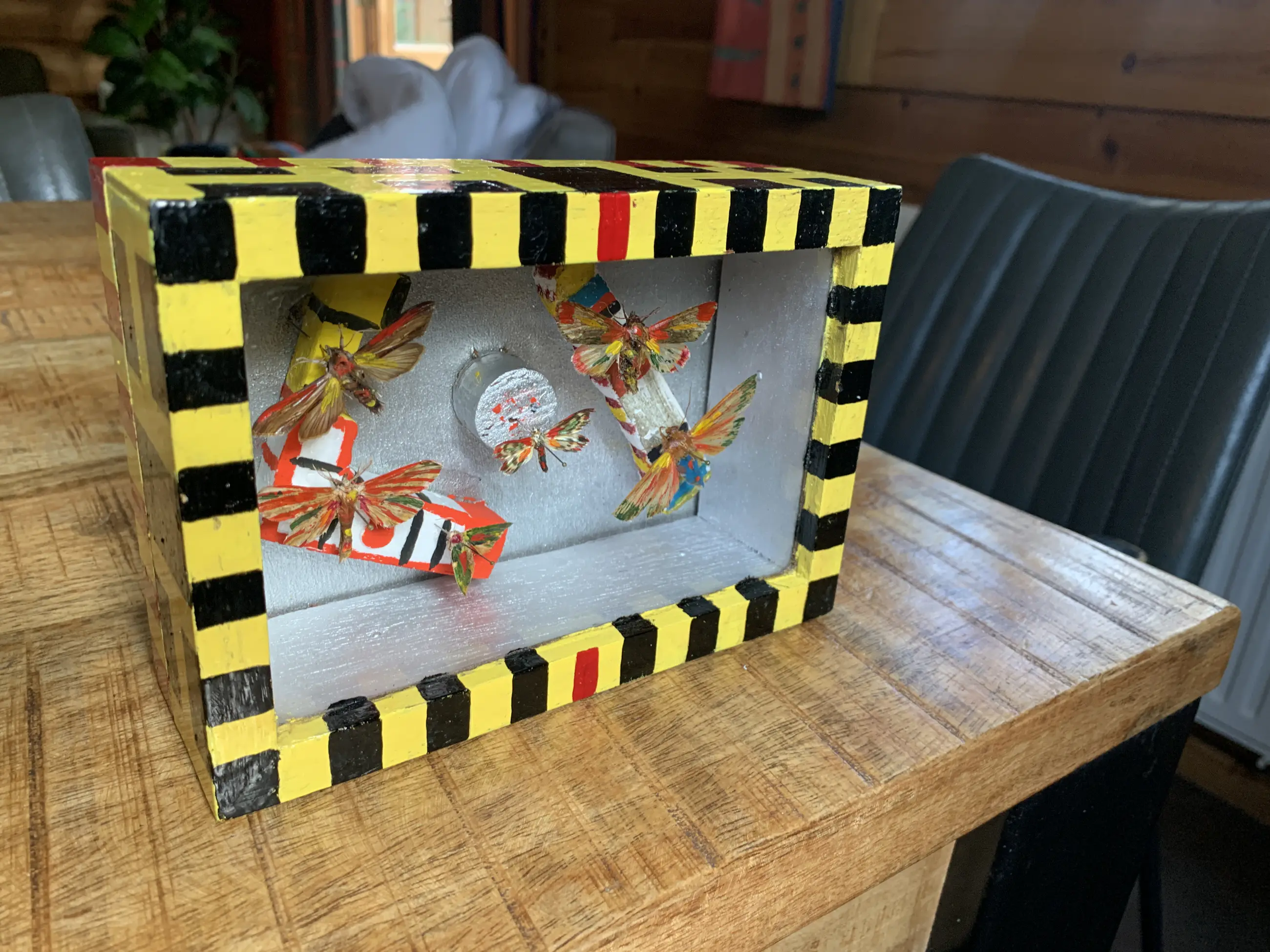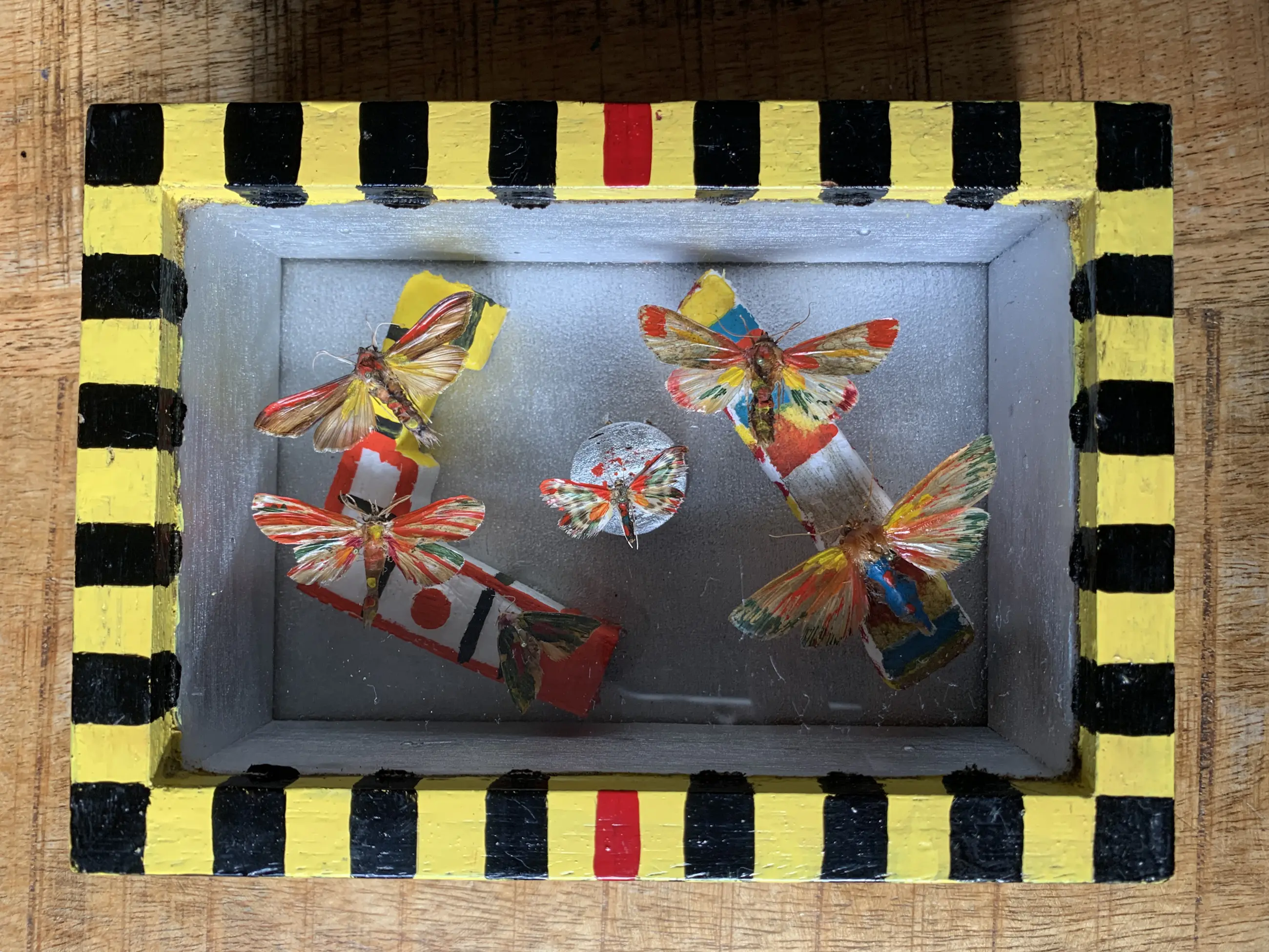Kunstig bewerkt houten kistje met een opstelling van geverfde vlinders en houten objecten. Het kistje is aan de achterkant gesigneerd door Herman Stammeshaus, 1975. Deze kunstenaar was specialist op het gebied van Surinaamse vlinders, wat het waarschijnlijk maakt dat de vlinders in het kistje ook uit Suriname komen.
