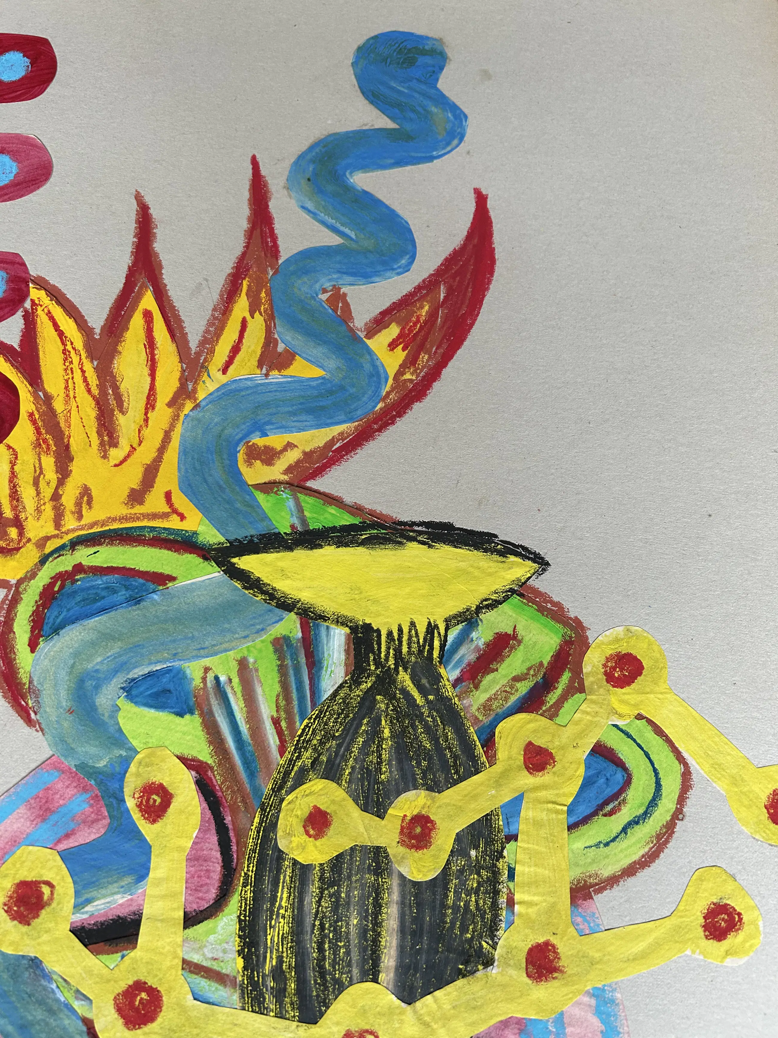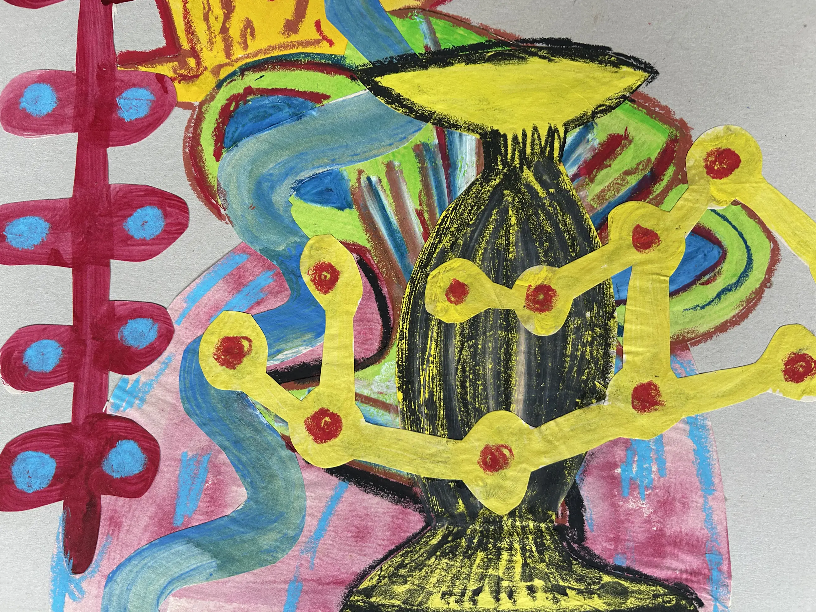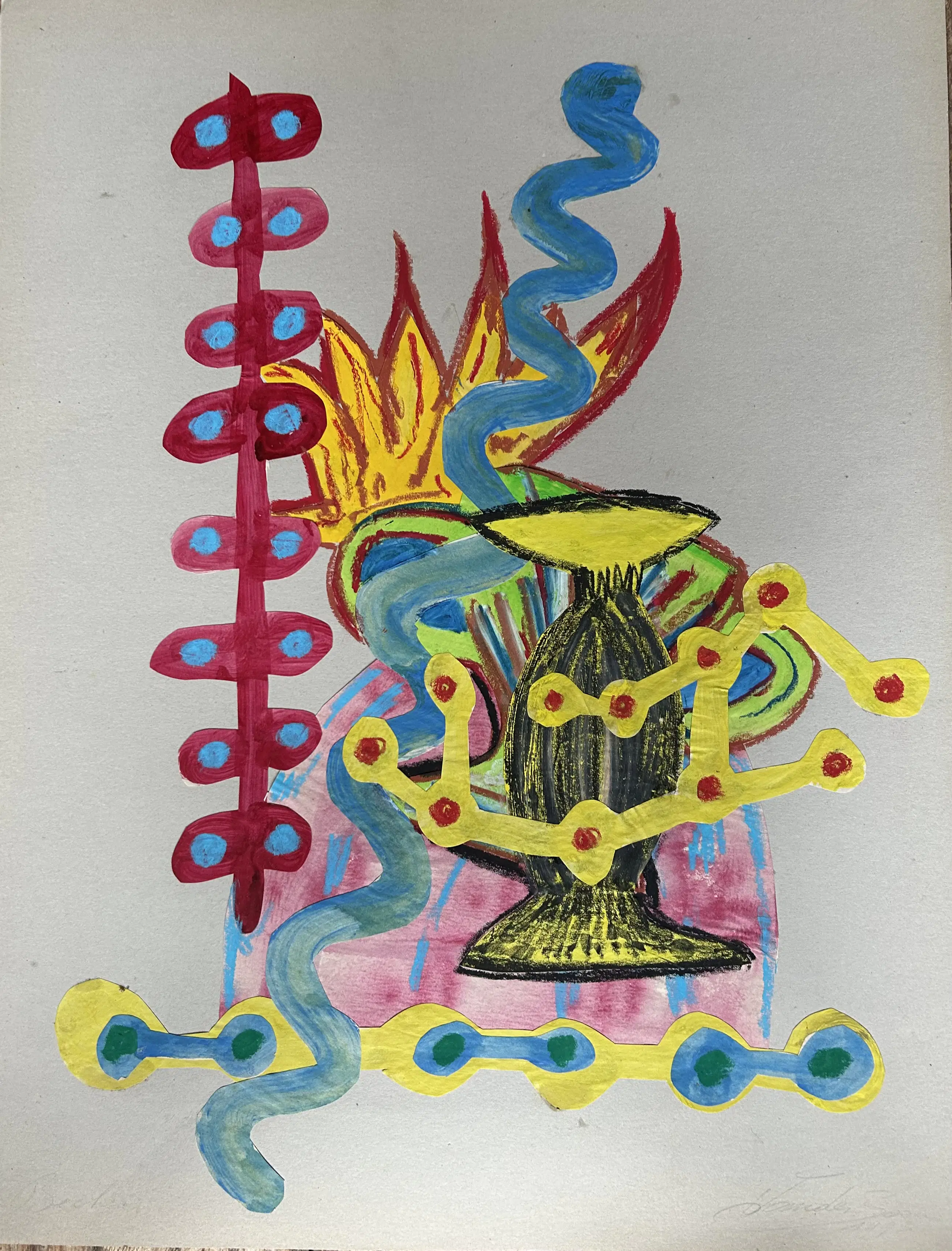 Dit levendige mixed-media werk van Herman van den Boom, getiteld Bernd und Hilla’s Becher, presenteert een speelse, abstracte compositie Uitgesneden, geschilderde vormen - variërend van slangachtige rondingen tot geometrische en pijlachtige vormen - verstrengelen zich op een neutrale achtergrond. Felle kleuren en expressieve penseelstreken creëren een dynamische spanning tussen organische en gestructureerde elementen. Van den Boom gaat in dialoog met een persoonlijke, fantasierijke interpretatie van de bekende bewust expressieloze en objectieve werken van De Bechers.