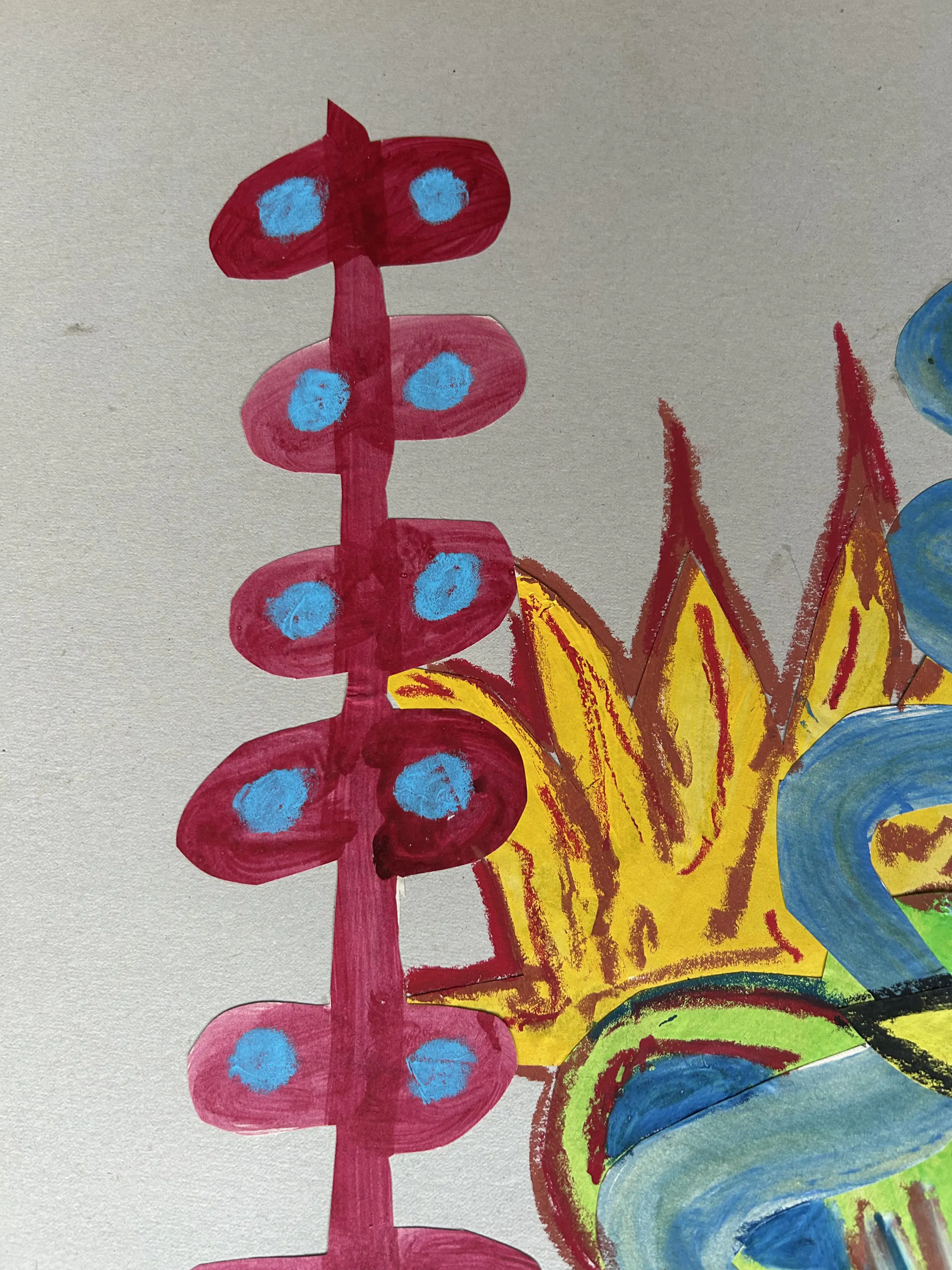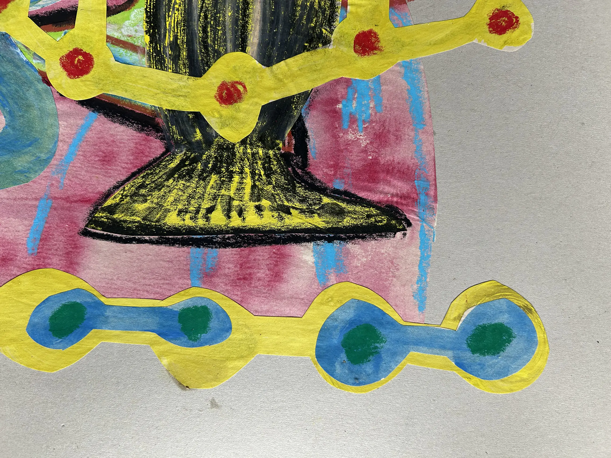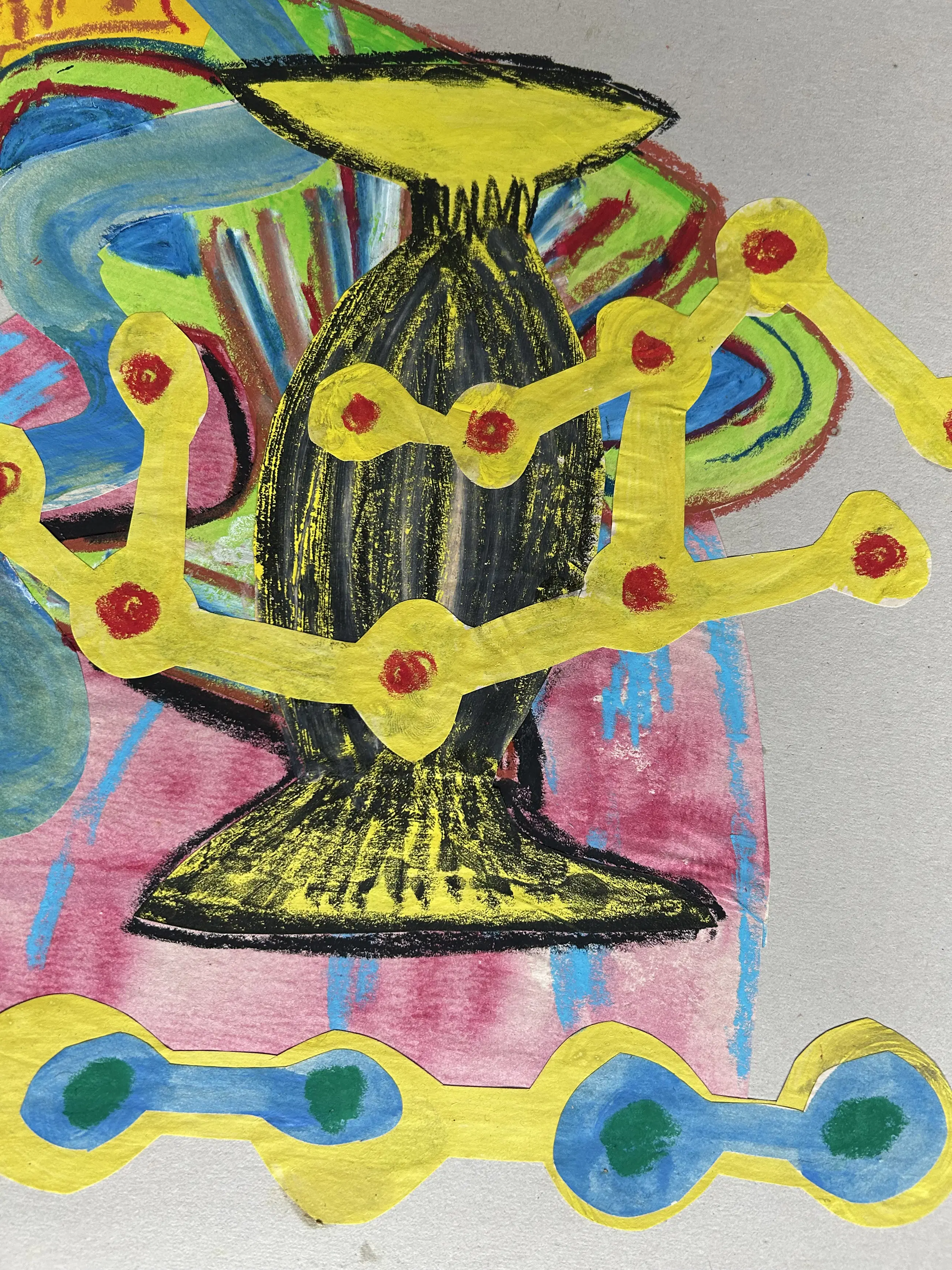 Dit levendige mixed-media werk van Herman van den Boom, getiteld Bernd und Hilla’s Becher, presenteert een speelse, abstracte compositie Uitgesneden, geschilderde vormen - variërend van slangachtige rondingen tot geometrische en pijlachtige vormen - verstrengelen zich op een neutrale achtergrond. Felle kleuren en expressieve penseelstreken creëren een dynamische spanning tussen organische en gestructureerde elementen. Van den Boom gaat in dialoog met een persoonlijke, fantasierijke interpretatie van de bekende bewust expressieloze en objectieve werken van De Bechers.