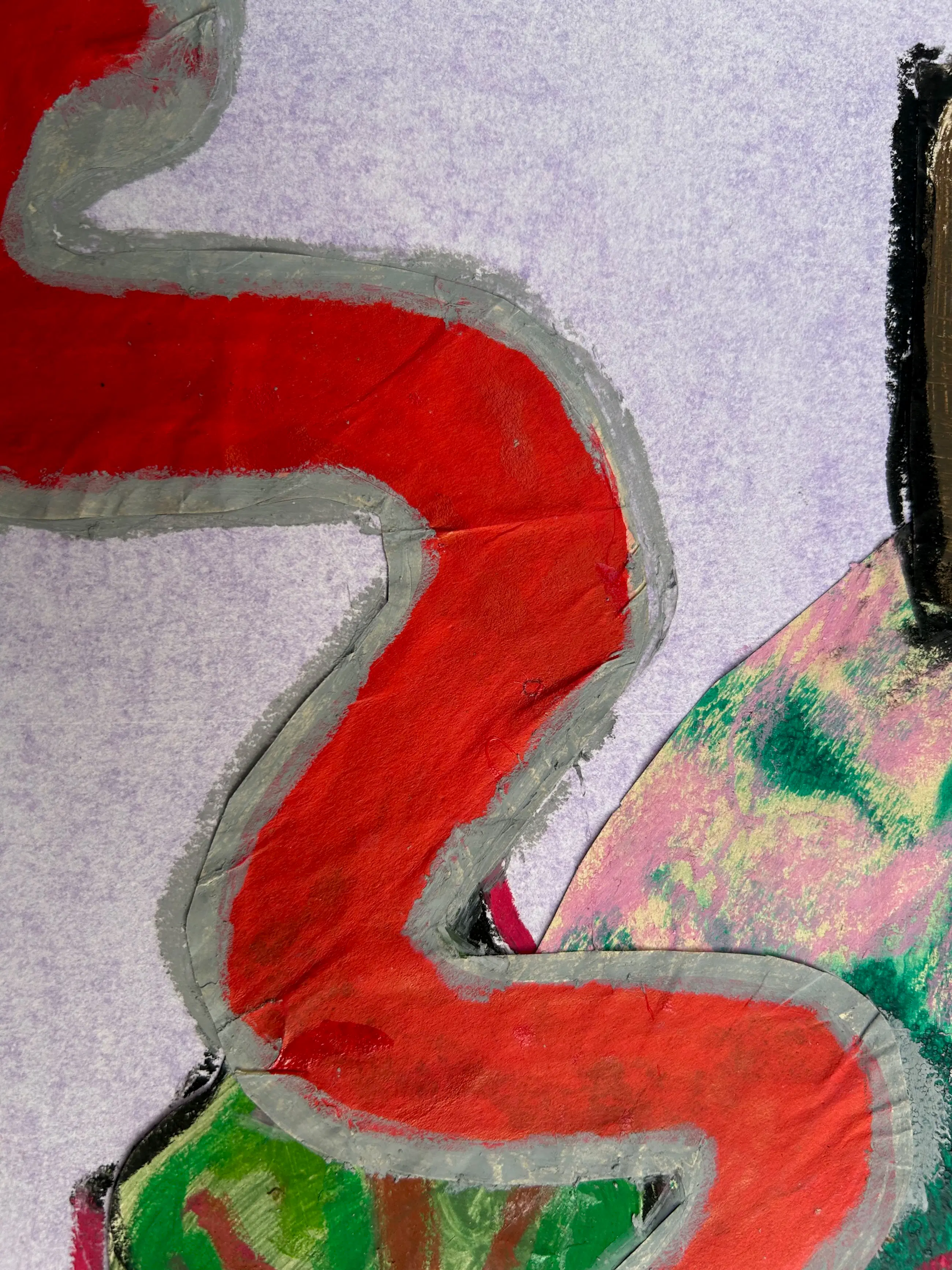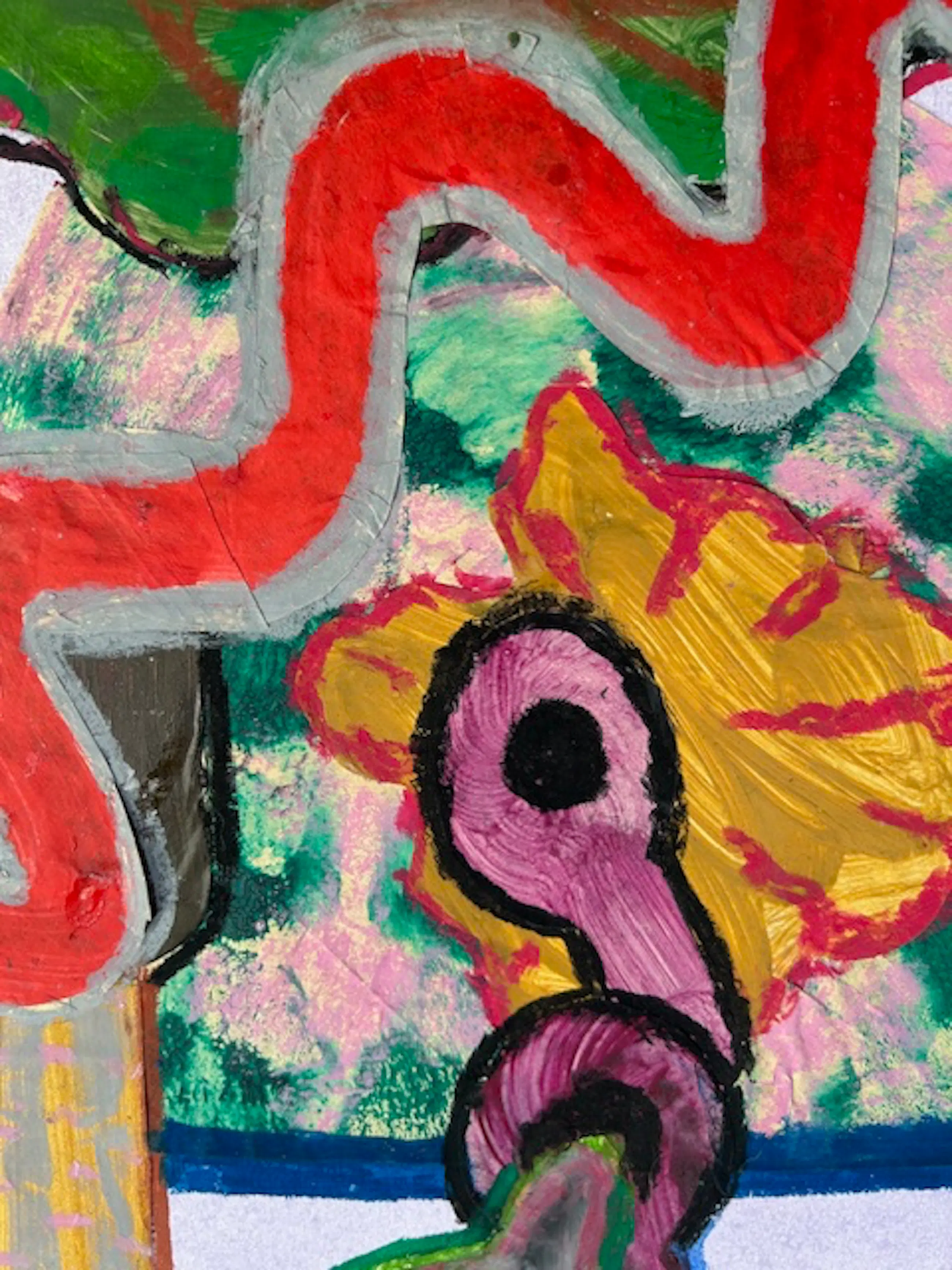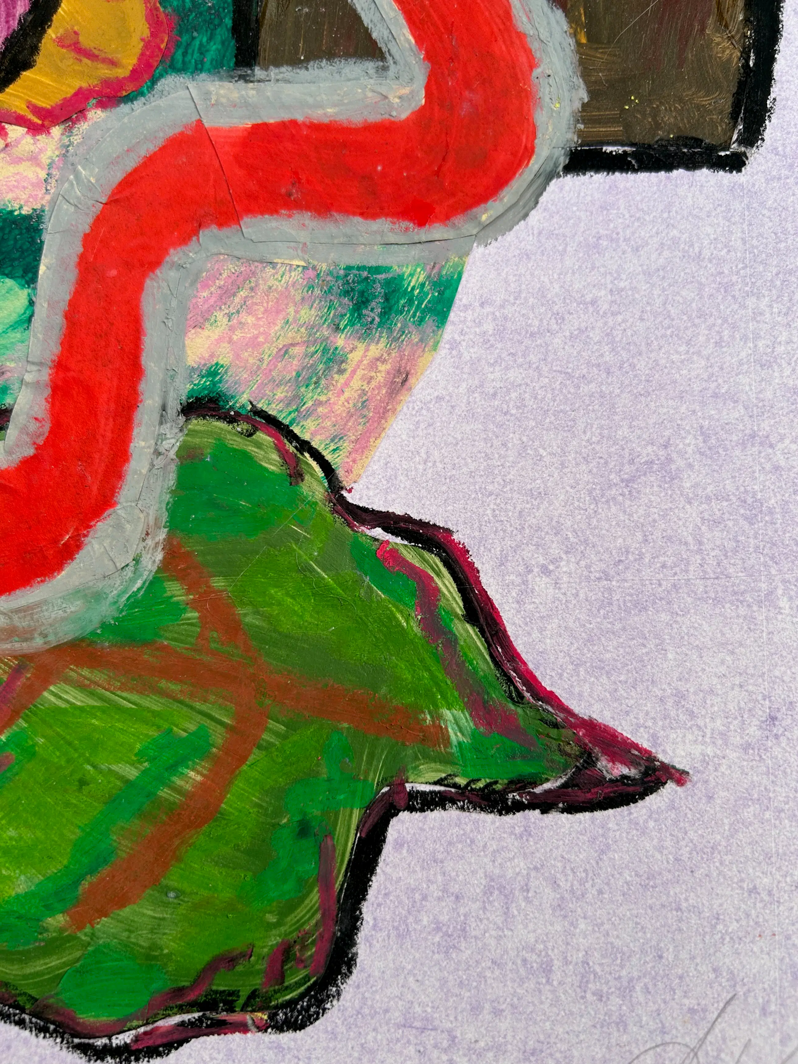 Dit levendige mixed-media werk van Herman van den Boom, getiteld Stilleven, presenteert een speelse, abstracte compositie die doet denken aan een fantastische tuin. Uitgesneden, geschilderde vormen - variërend van slangachtige rondingen en bloemmotieven tot geometrische en pijlachtige vormen - verstrengelen zich op een neutrale achtergrond. Felle kleuren en expressieve penseelstreken creëren een dynamische spanning tussen organische en gestructureerde elementen. Van den Boom verkent een persoonlijke, fantasierijke interpretatie van de natuur als zowel chaotisch als vreugdevol.