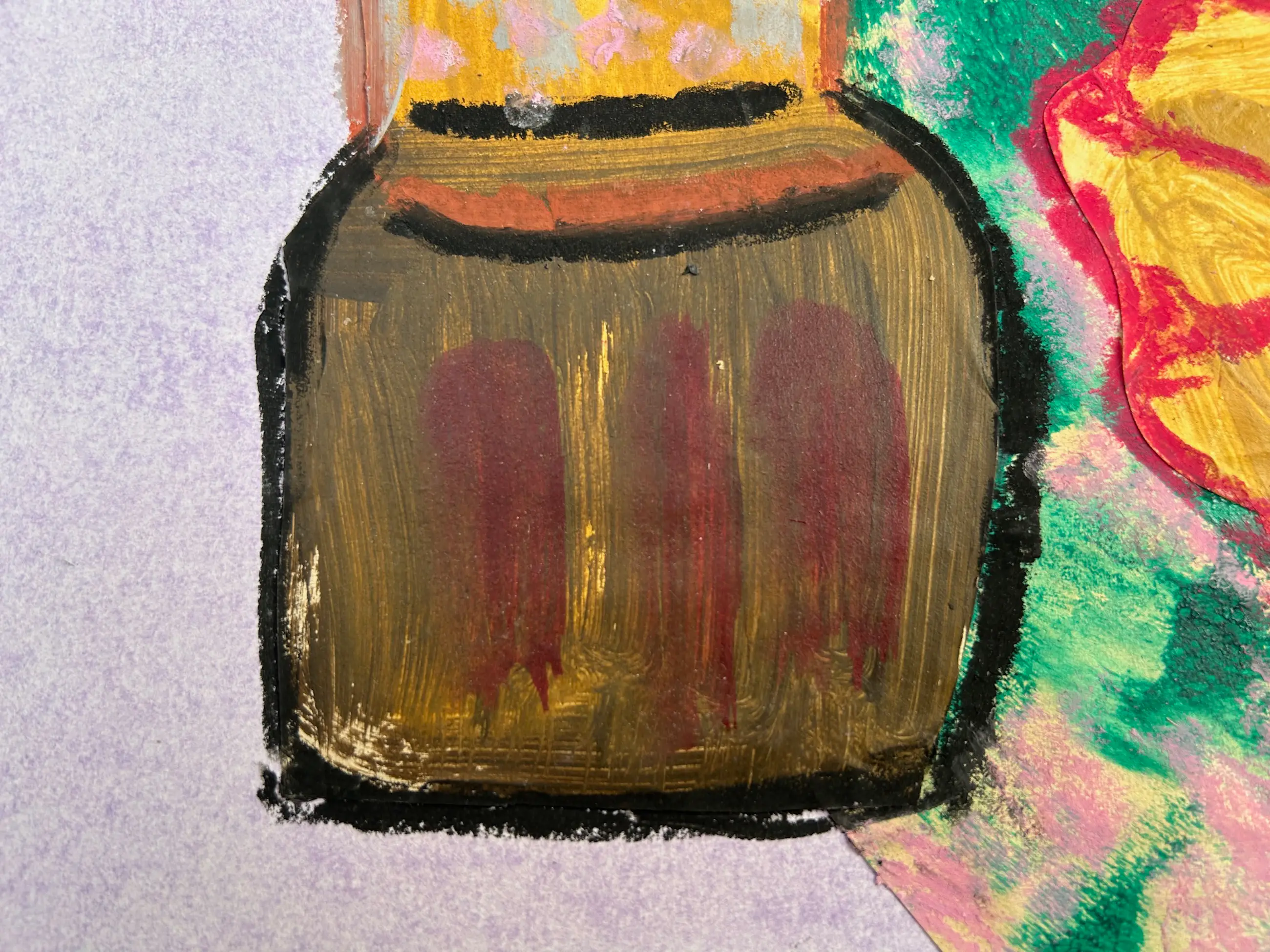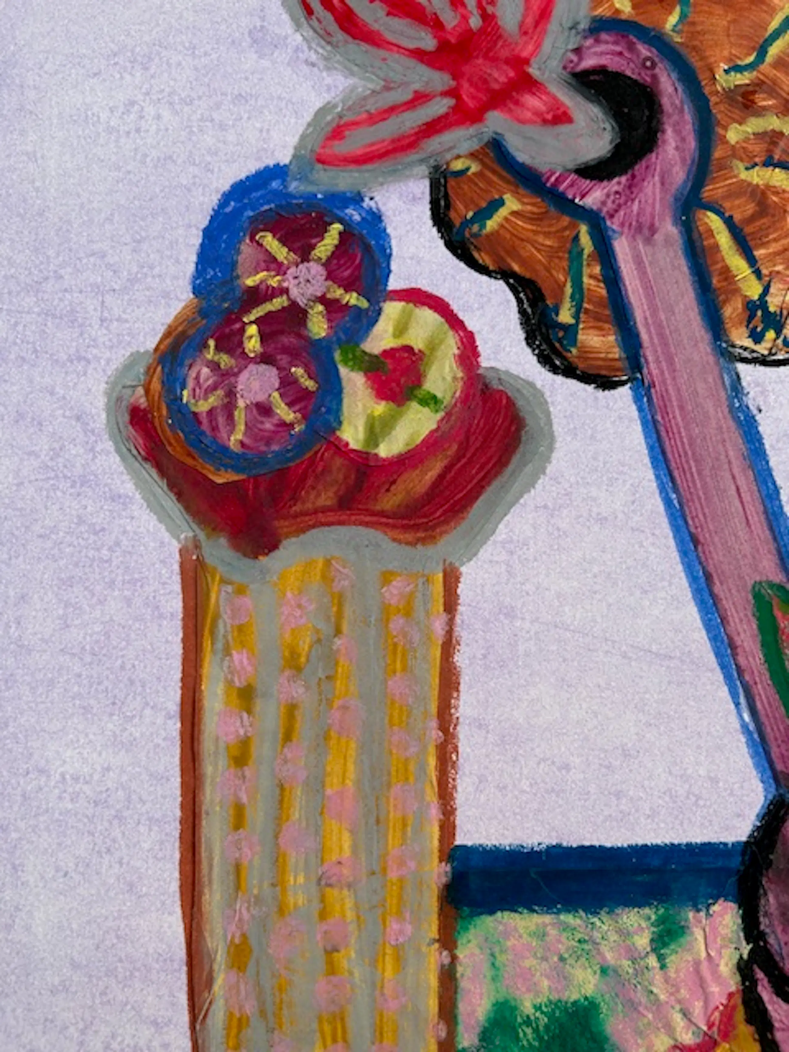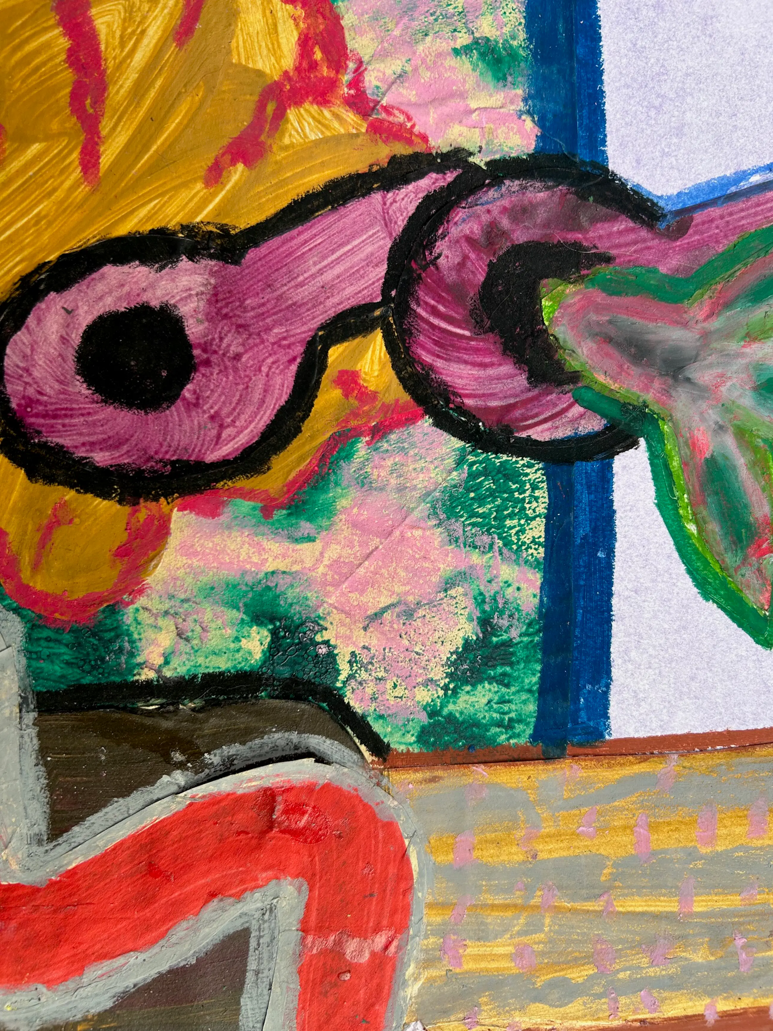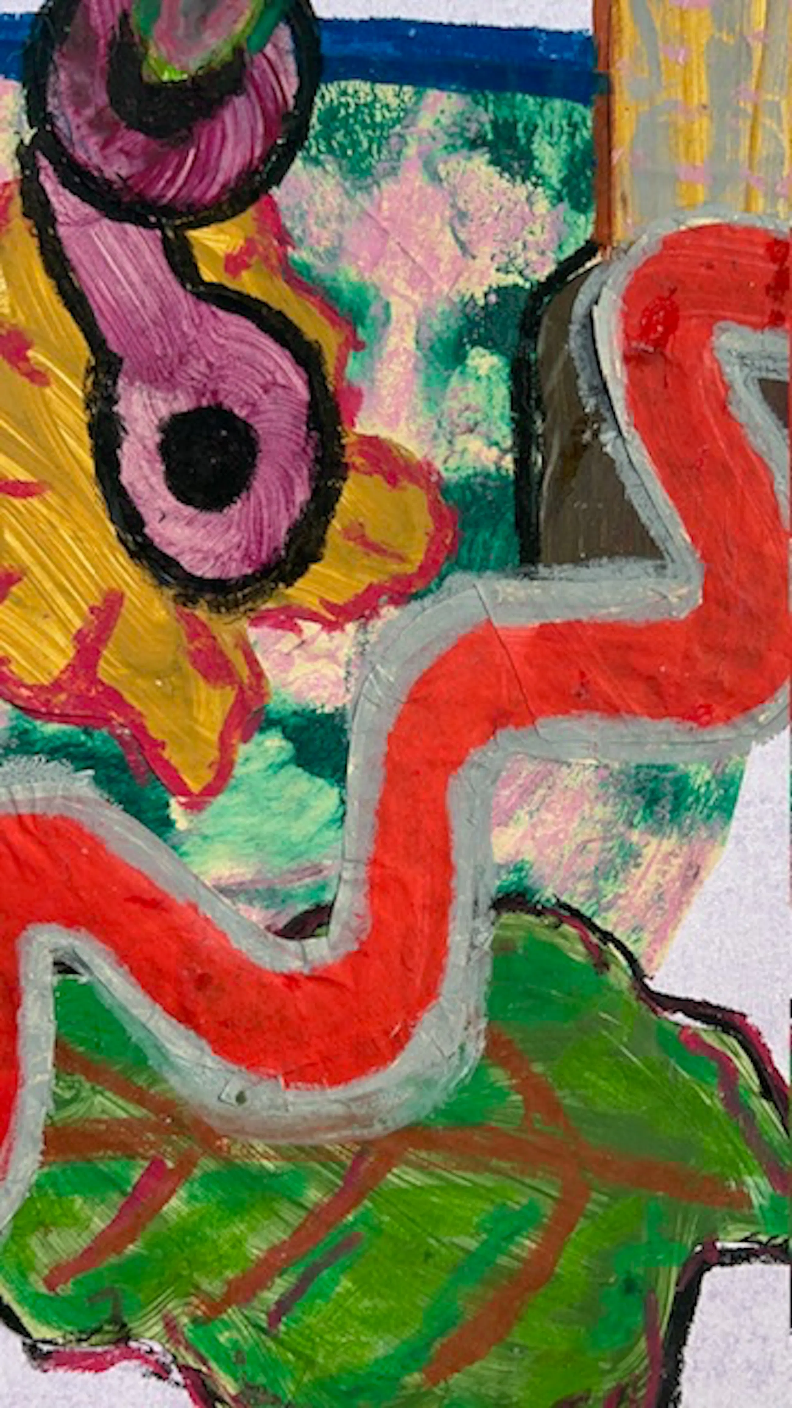 Dit levendige mixed-media werk van Herman van den Boom, getiteld Stilleven, presenteert een speelse, abstracte compositie die doet denken aan een fantastische tuin. Uitgesneden, geschilderde vormen - variërend van slangachtige rondingen en bloemmotieven tot geometrische en pijlachtige vormen - verstrengelen zich op een neutrale achtergrond. Felle kleuren en expressieve penseelstreken creëren een dynamische spanning tussen organische en gestructureerde elementen. Van den Boom verkent een persoonlijke, fantasierijke interpretatie van de natuur als zowel chaotisch als vreugdevol.