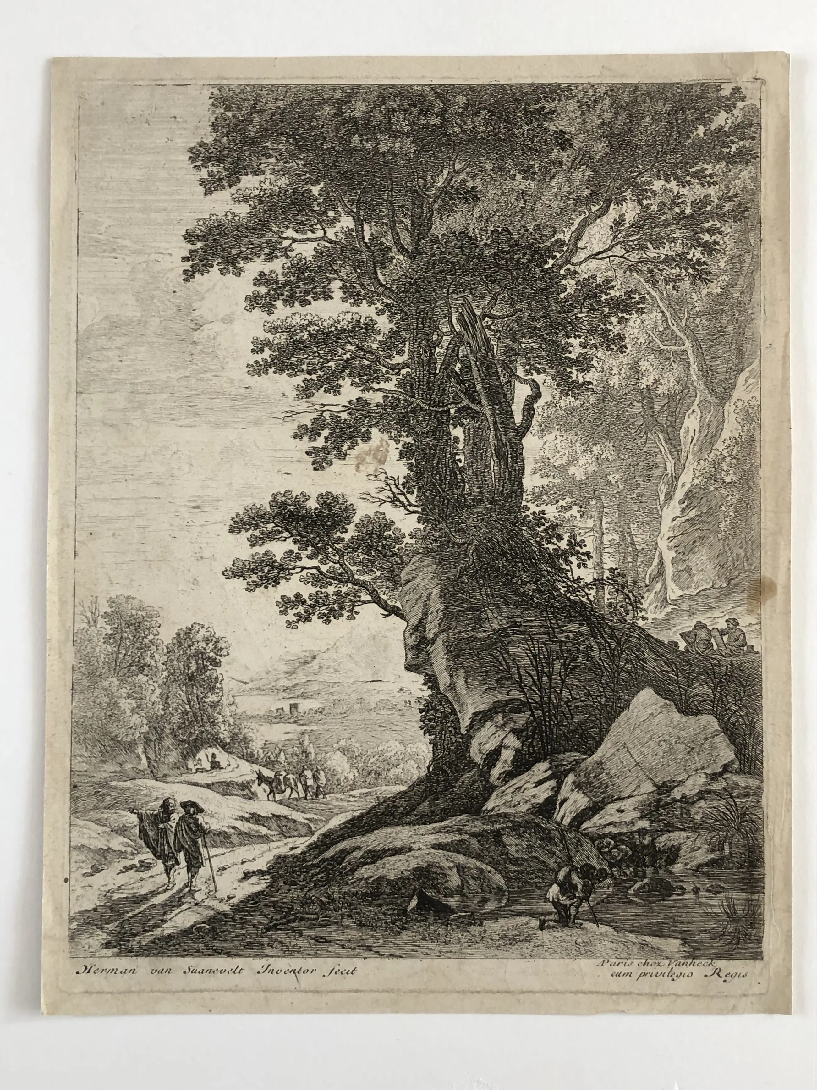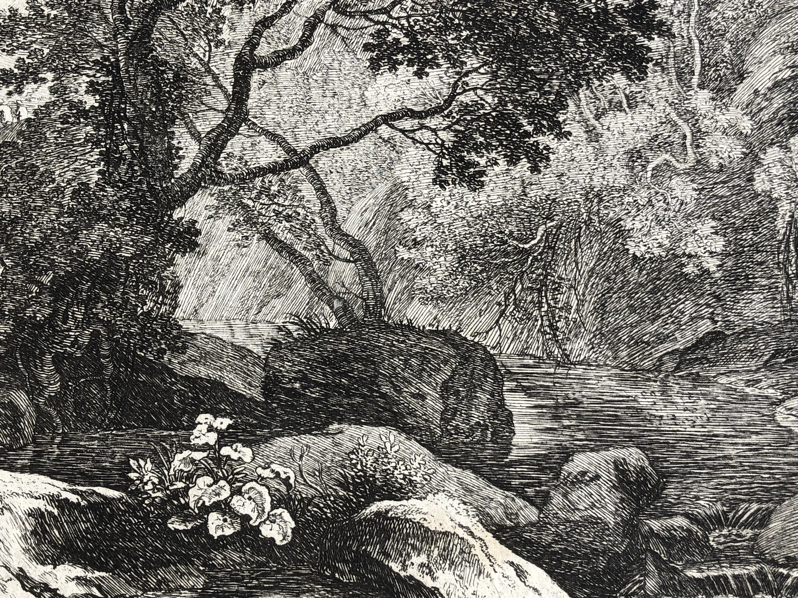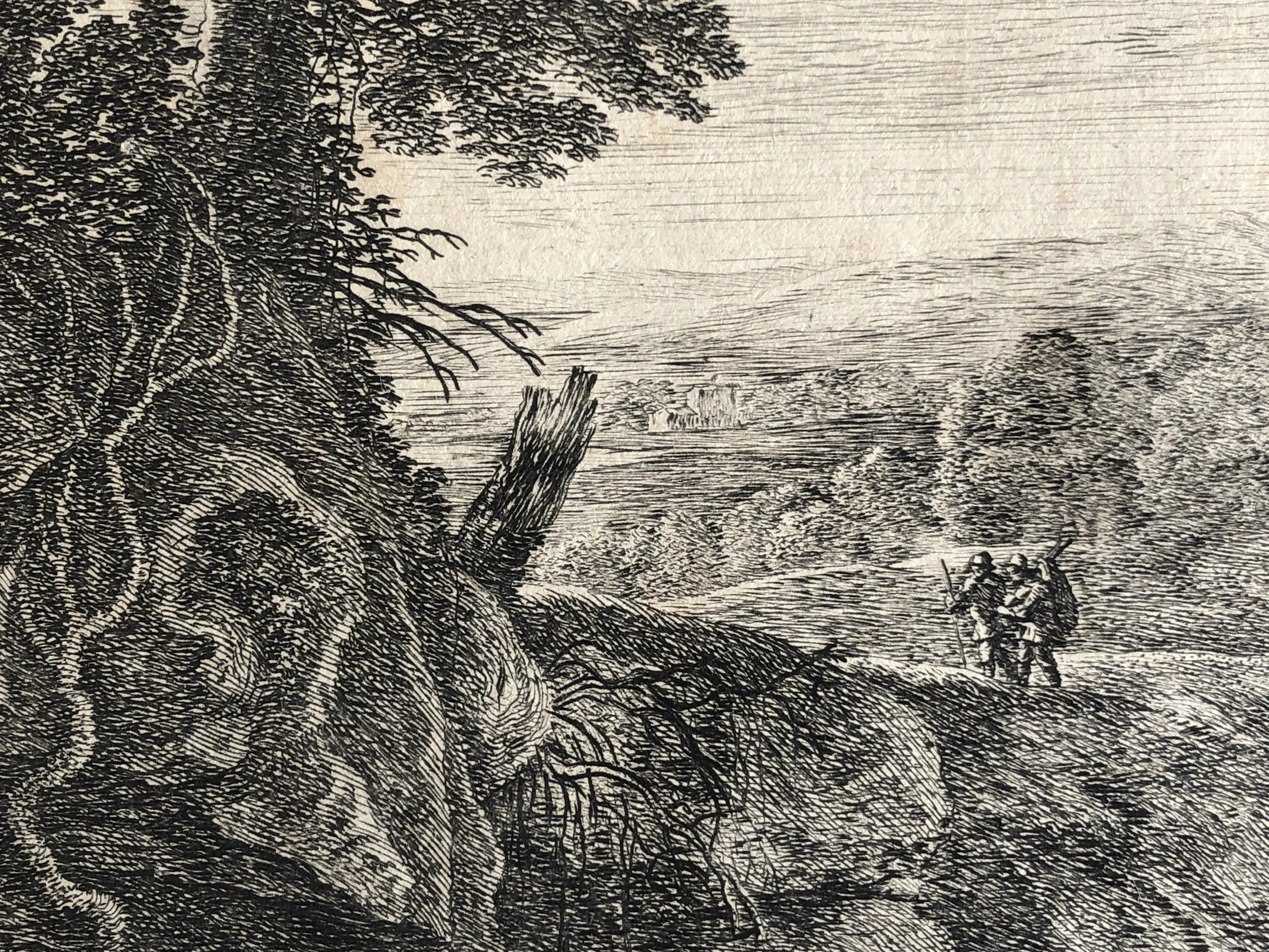 2. Een groep bomen op een rotsblok (=Hollstein 102-IV, Bartsch 115), uit dezelfde serie als de eerste ets en in dezelfde matige conditie: twee vlekjes in het beeld, kreukjes langs de randen, miniem scheurtje in de marge rechtsboven, achterzijde vuil.