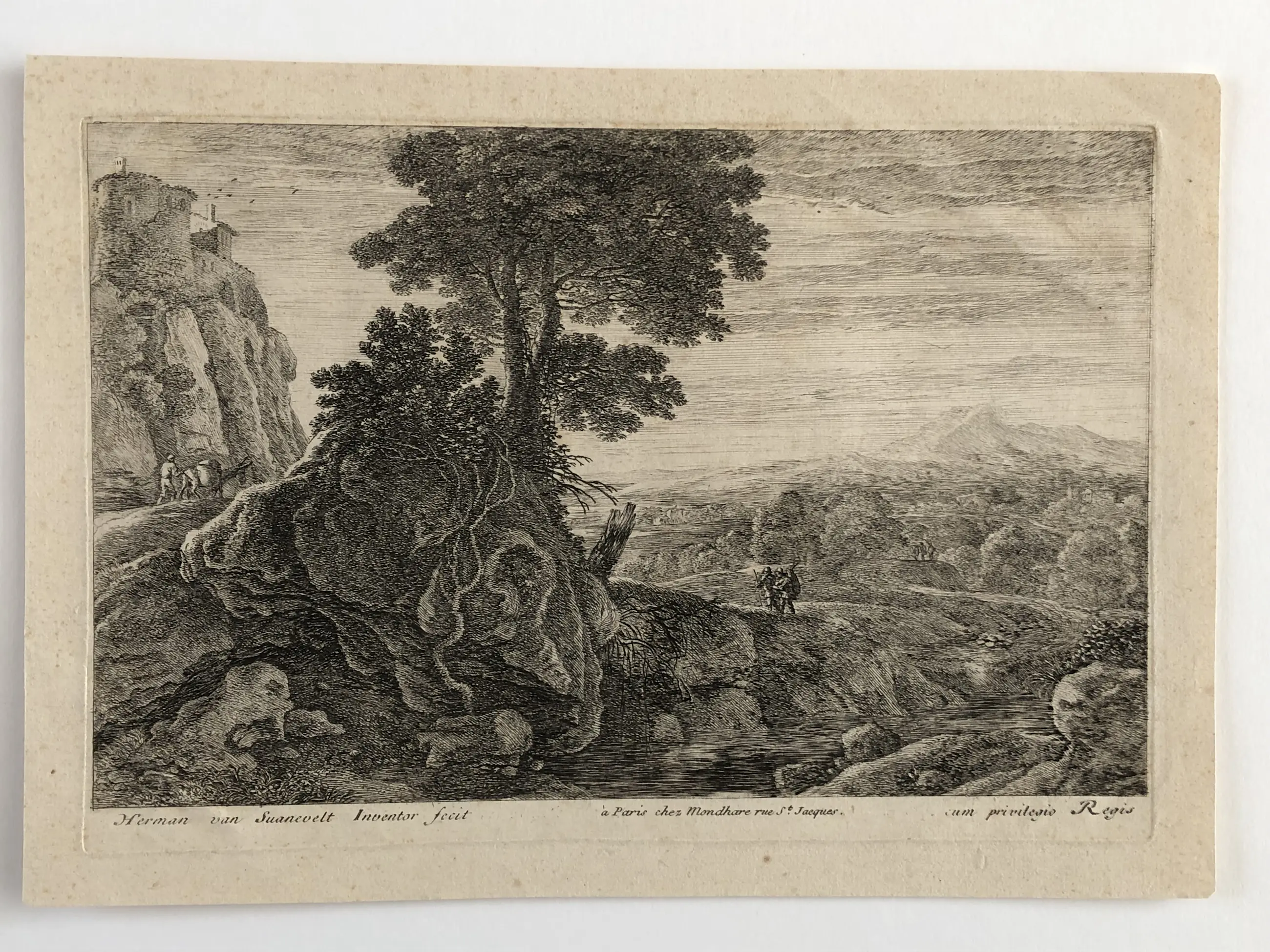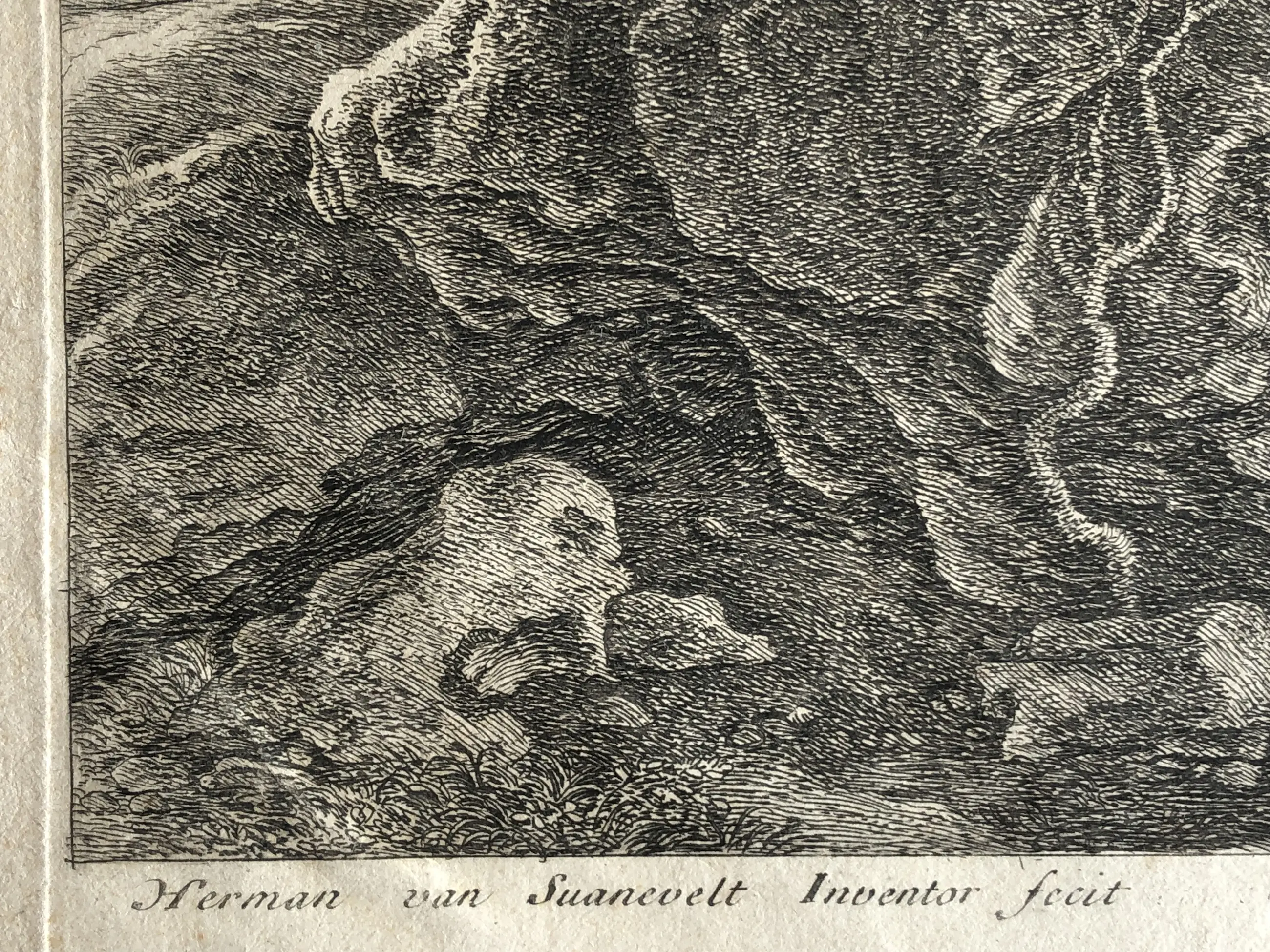 3. Het huis op de rots (=Hollstein 98-IV, Bartsch 94) uit een serie van twaalf landschappen. Signatuur, uitgever en goedkeuring in de onderste marge. Formaat beeld 17,5 x 27,5 cm, met onderschrift en marges 21,7 x 30,5 cm. Over het gehele oppervlak lichtbruine vochtvlekjes, zichtbare vouwen in de hoeken linksonder en linksboven.
