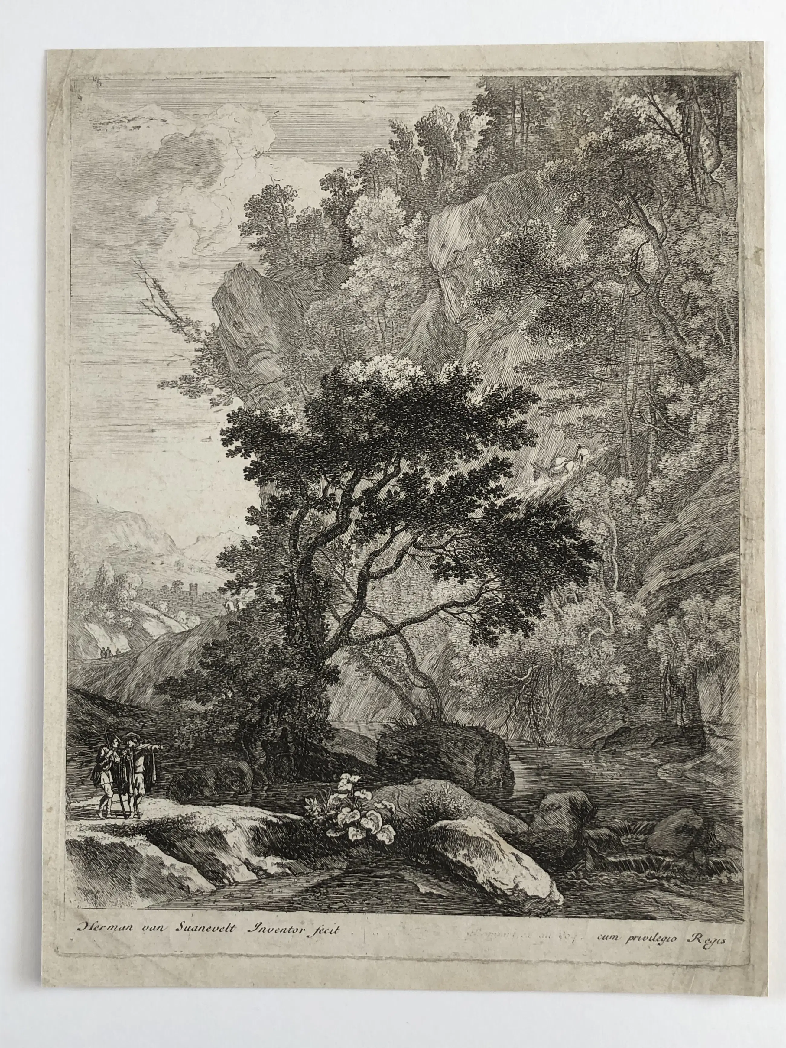1. De hoge bergwand (=Hollstein 100-V, Bartsch 113). Uit een serie van vier grote landschappen. Afbeelding 29,5 x 24,7 cm, met onderschrift en marge 33 x 25,5 cm. Gesigneerd in de onderste marge. De vermelding van de uitgever is zeer vaag gedrukt of deels verwijderd (zie tweede ets). Langs de randen met kreukjes en vlekkerig. Een bruine vlek rechtsboven is zichtbaar in het beeld. De achterzijde is vuil met vlekjes en resten van plakker of versteviging.