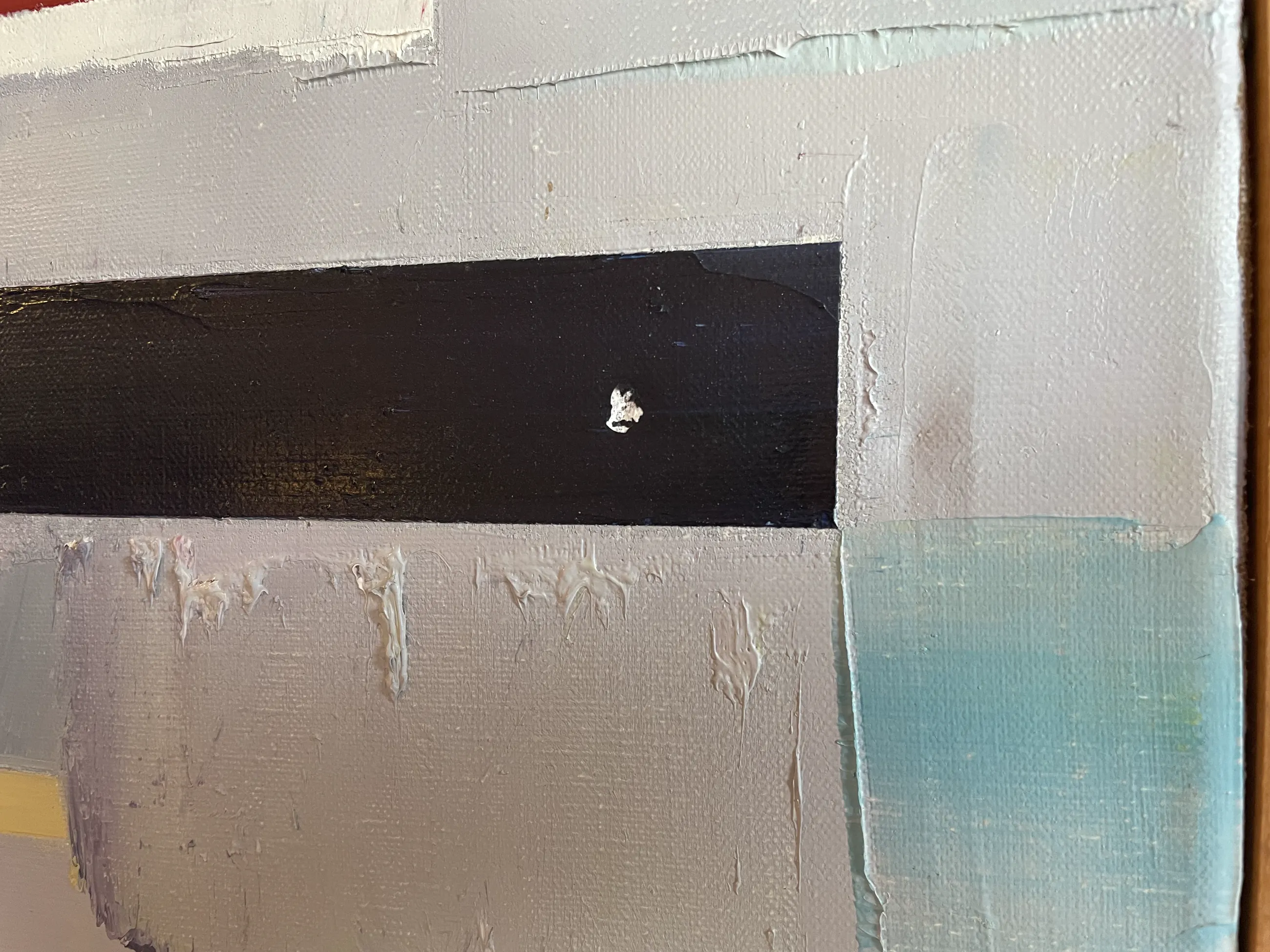 Het doek verkeert in goede staat, maar heeft enkele kleine beschadigingen: rechts-onder een klein butsje met verfverlies en een klein deukje, midden-onder in het bruin een stukje opstaande verf en links-onder een klein stukje verfverlies. Eventueel door kleine restauratie weer te herstellen. Zie ook detailfoto's.