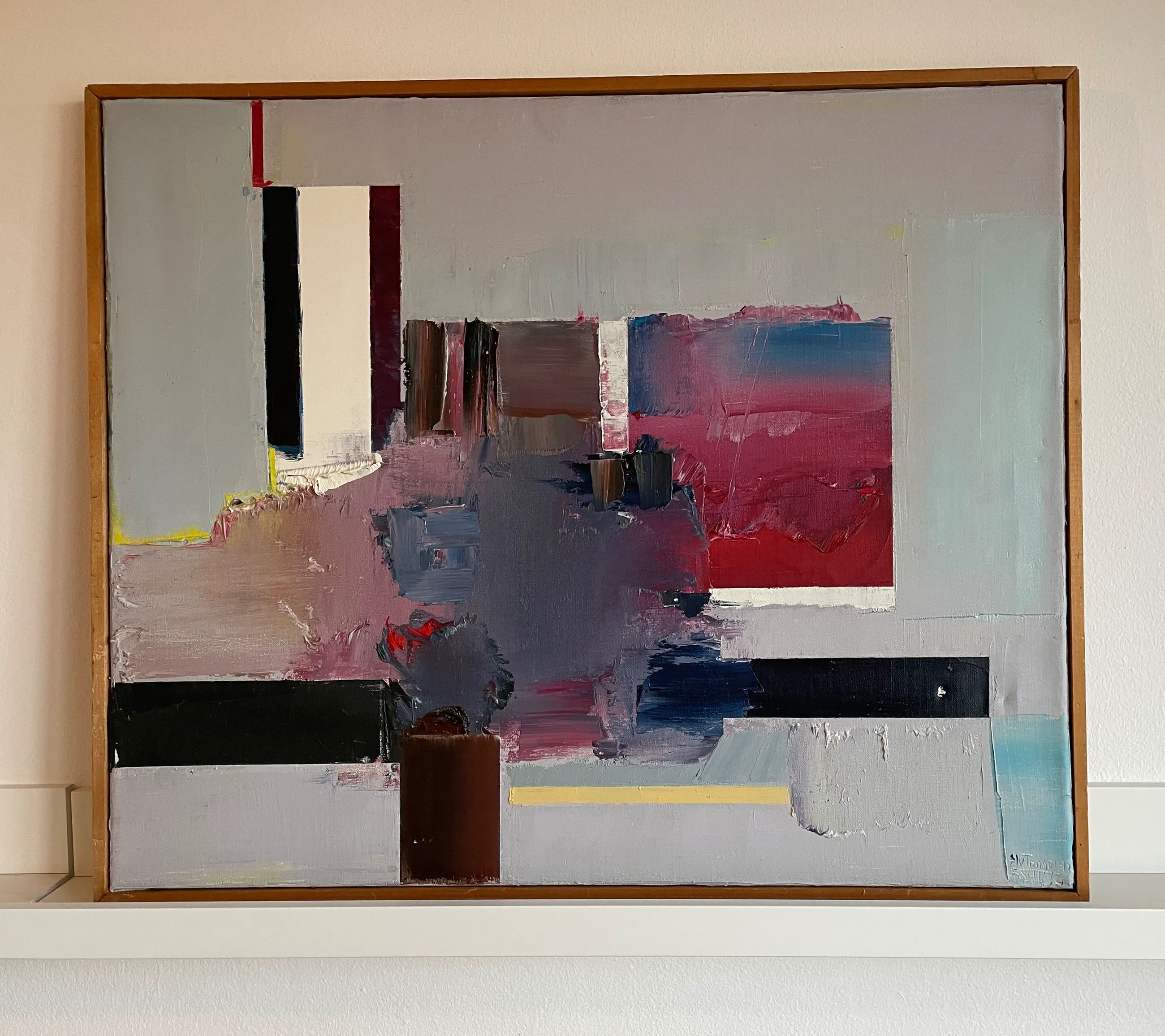 Fraai klein olieverfschilderij door de kunstenaar Herman van Tongeren (1933), vervaardigd in 1973. De verschillende blauwe- en rode tinten zijn deels pasteus op het doek gezet.