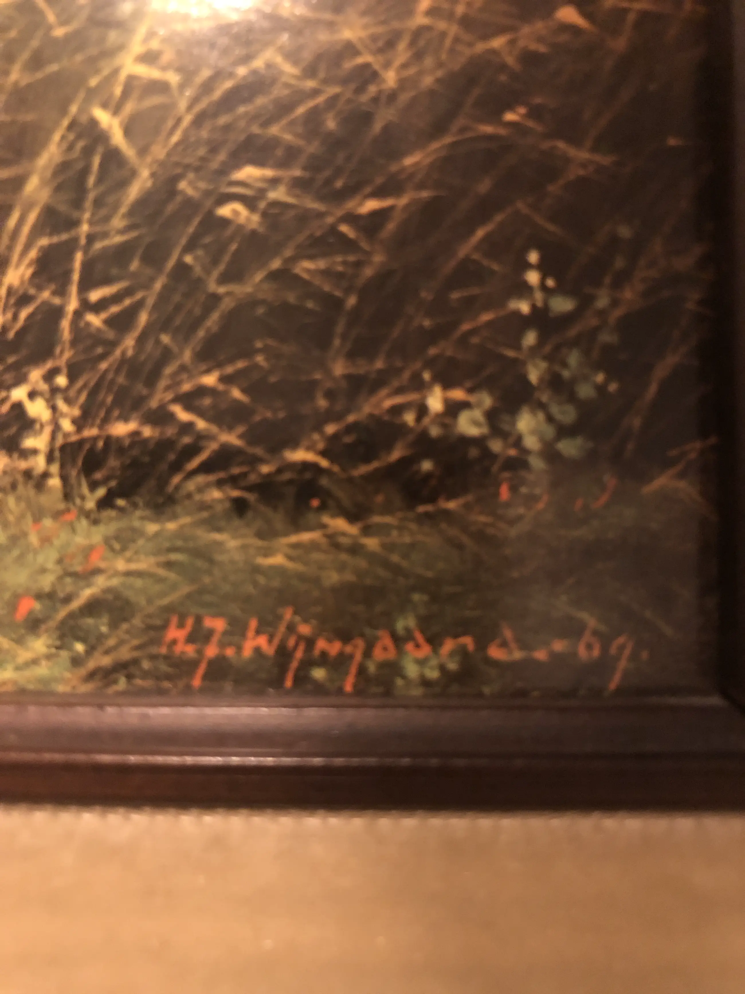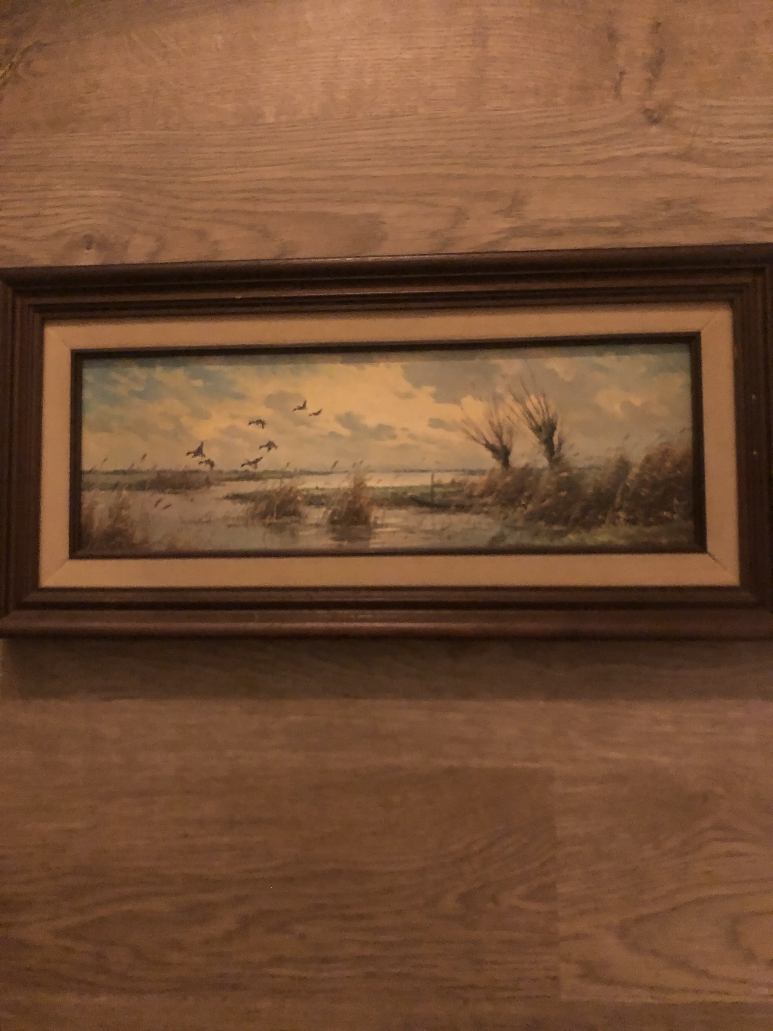 Waterlandschap, links 7 vliegende eenden, rechts wilgen met een bootje in het riet. Gesigneerd HJ Wijngaard 69