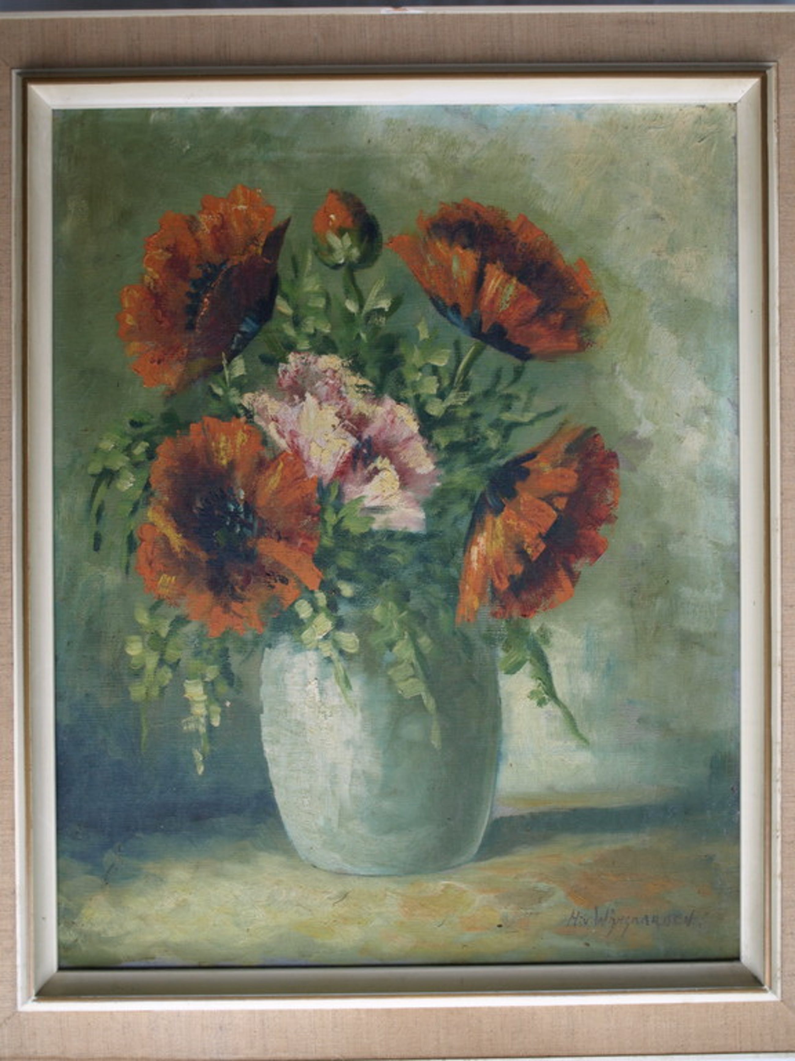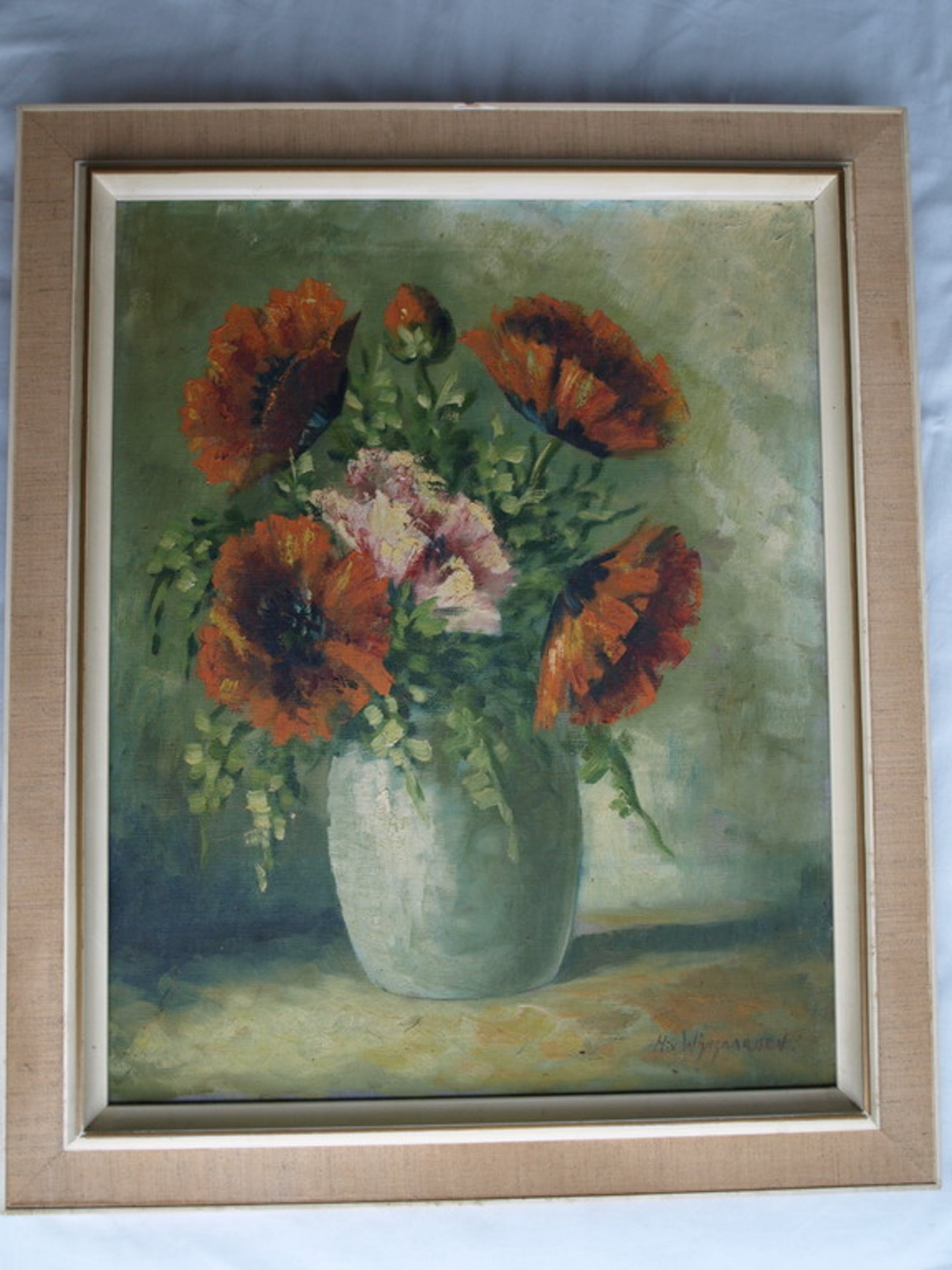 Een schilderij van de Nederlandse kunstenaar Herman J. Wijngaard met een bloemstilleven.