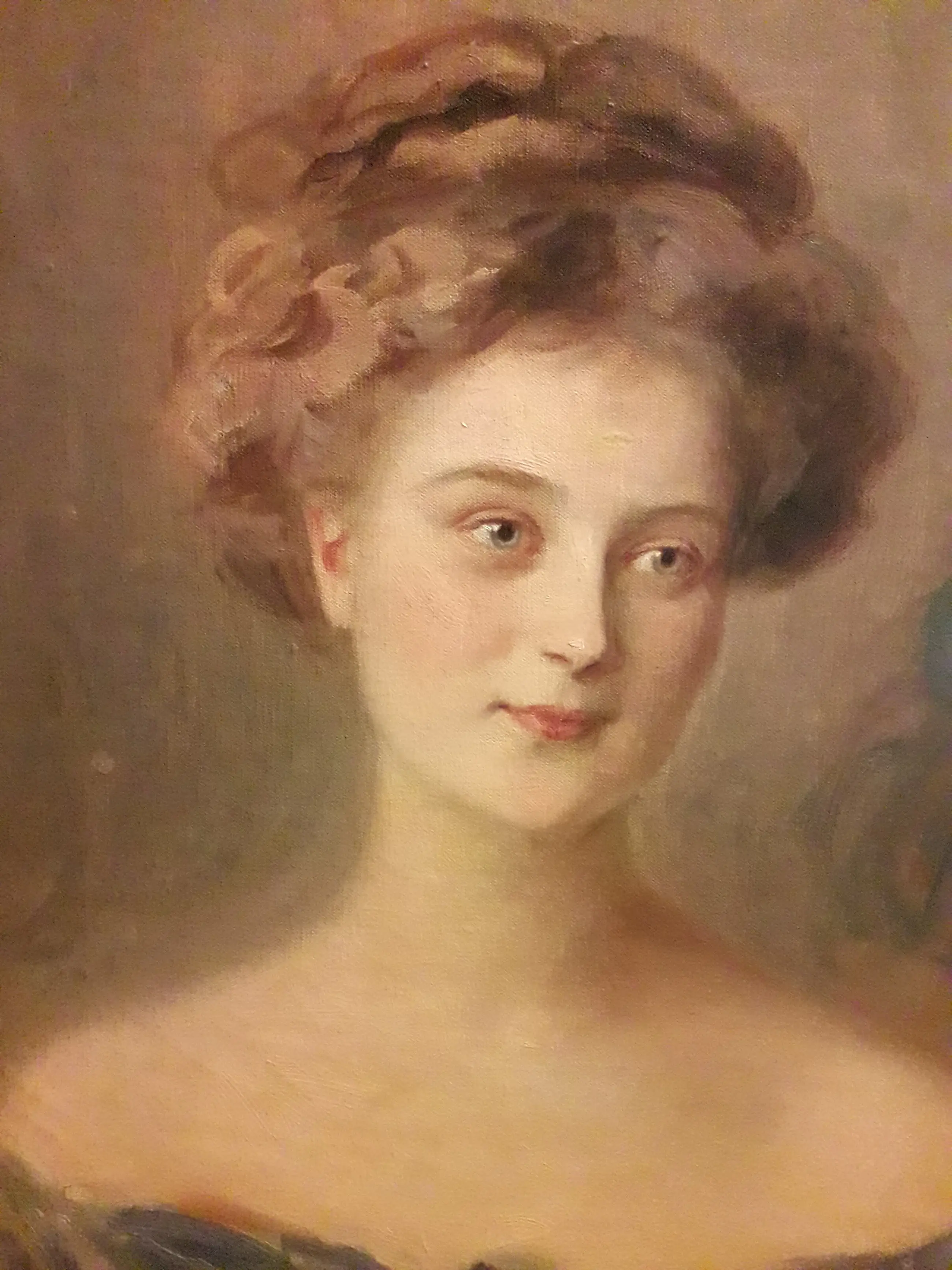 Van art nouveau beïnvloed portret van een jonge vrouw in blauw bandloos kleed, die lachend naar de zijkant kijkt. 55*40.5 cm goudlijst 61*46.5 cm
