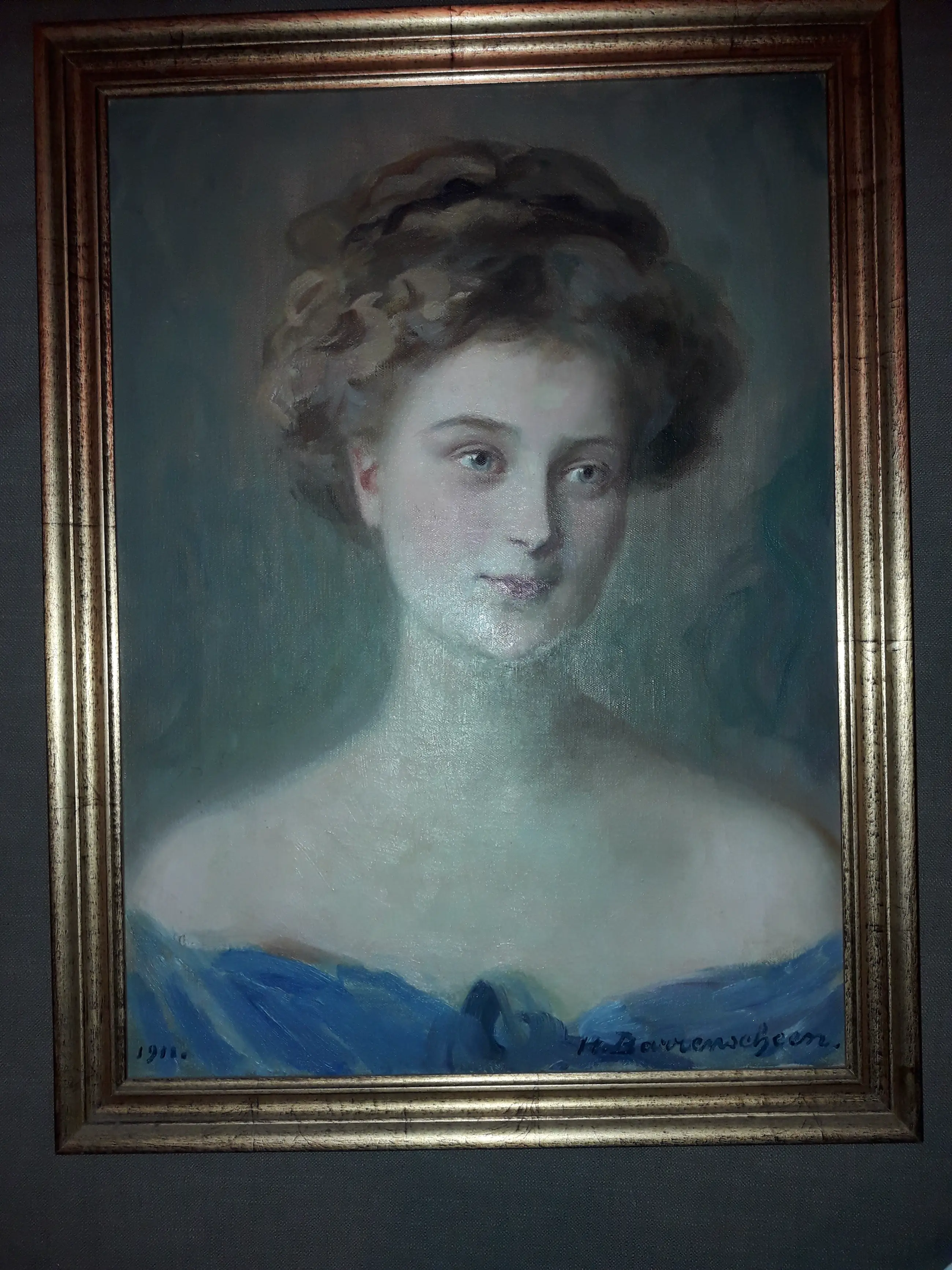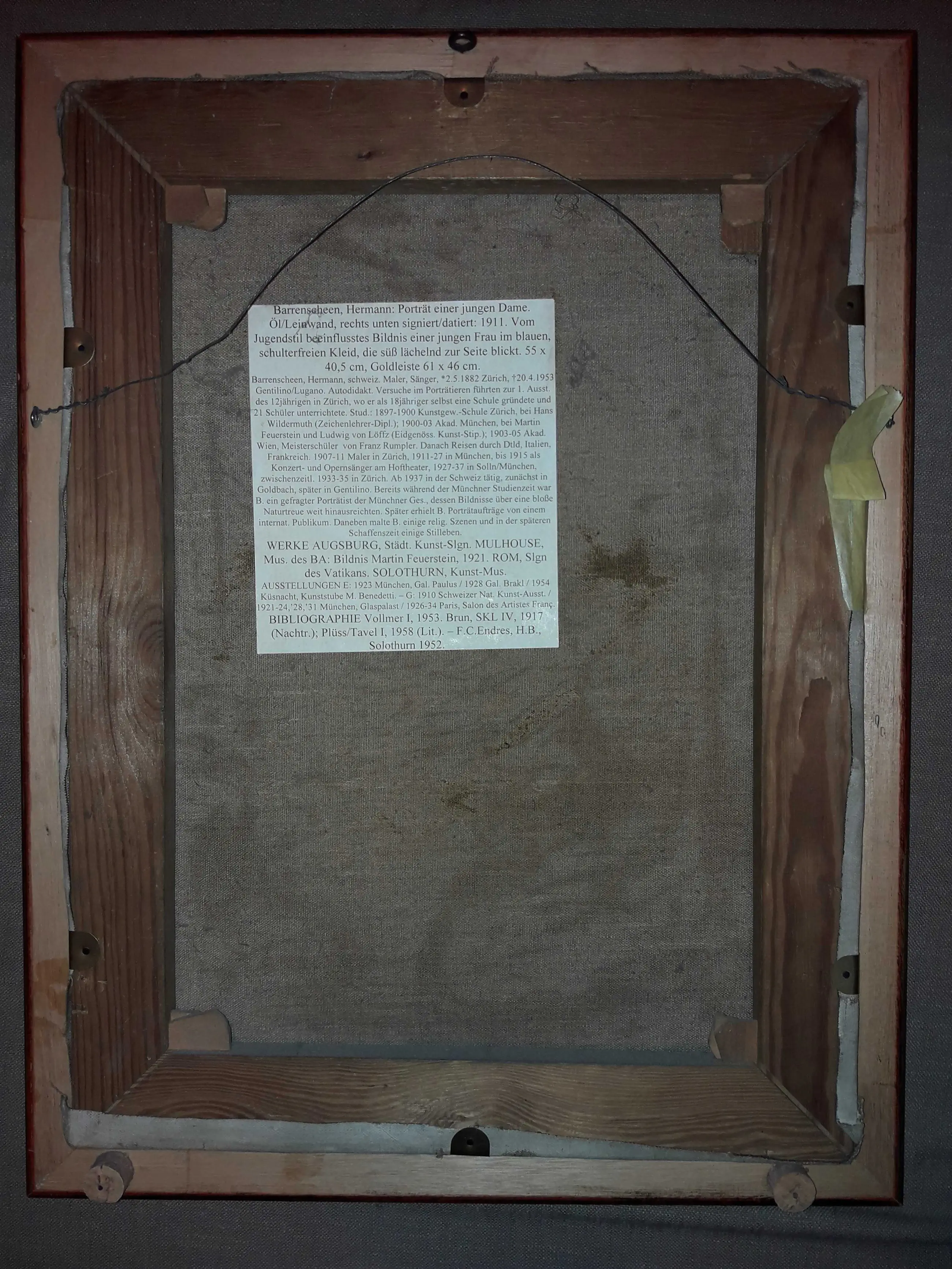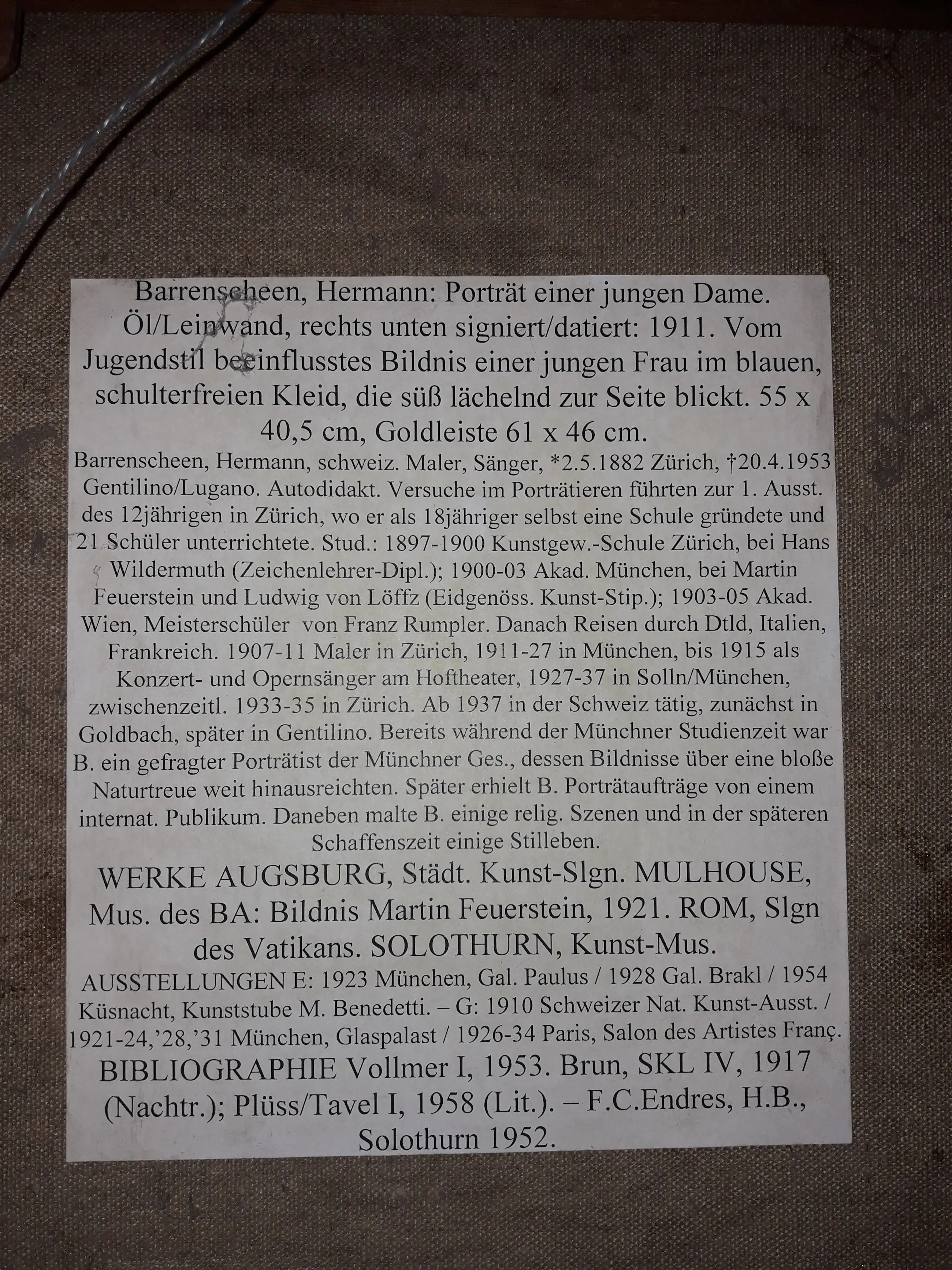 Barrenscheen Hermann: Zwitser schilder en zanger; een veelgevraagde portrettist in de Munchense gemeenschap. autodidact op 12 jaar tentoonstelling Zurich, 1897-1905 op 18 jarige leeftijd school opgericht Portret van een jonge dame Olie/Canvas, rechtsonder gesigneerd/gedateerd: 1911