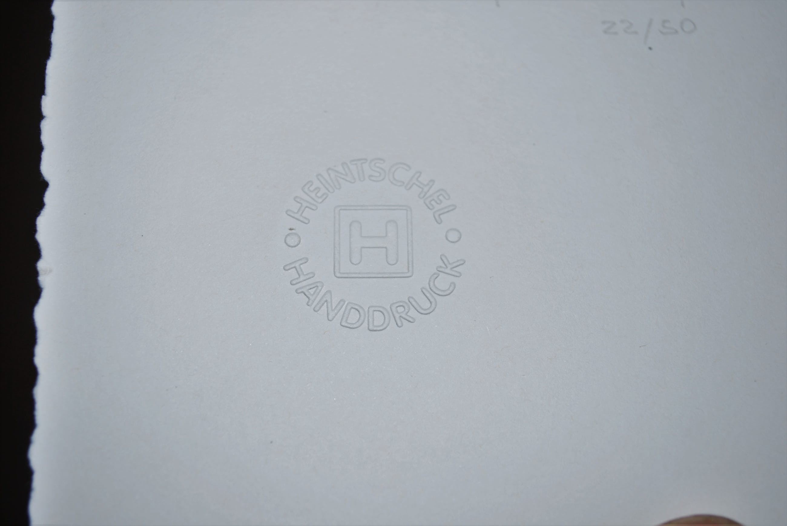 Plaatrand 10x10 cm. Met potlood: signatuur, titel, jaar, oplage .